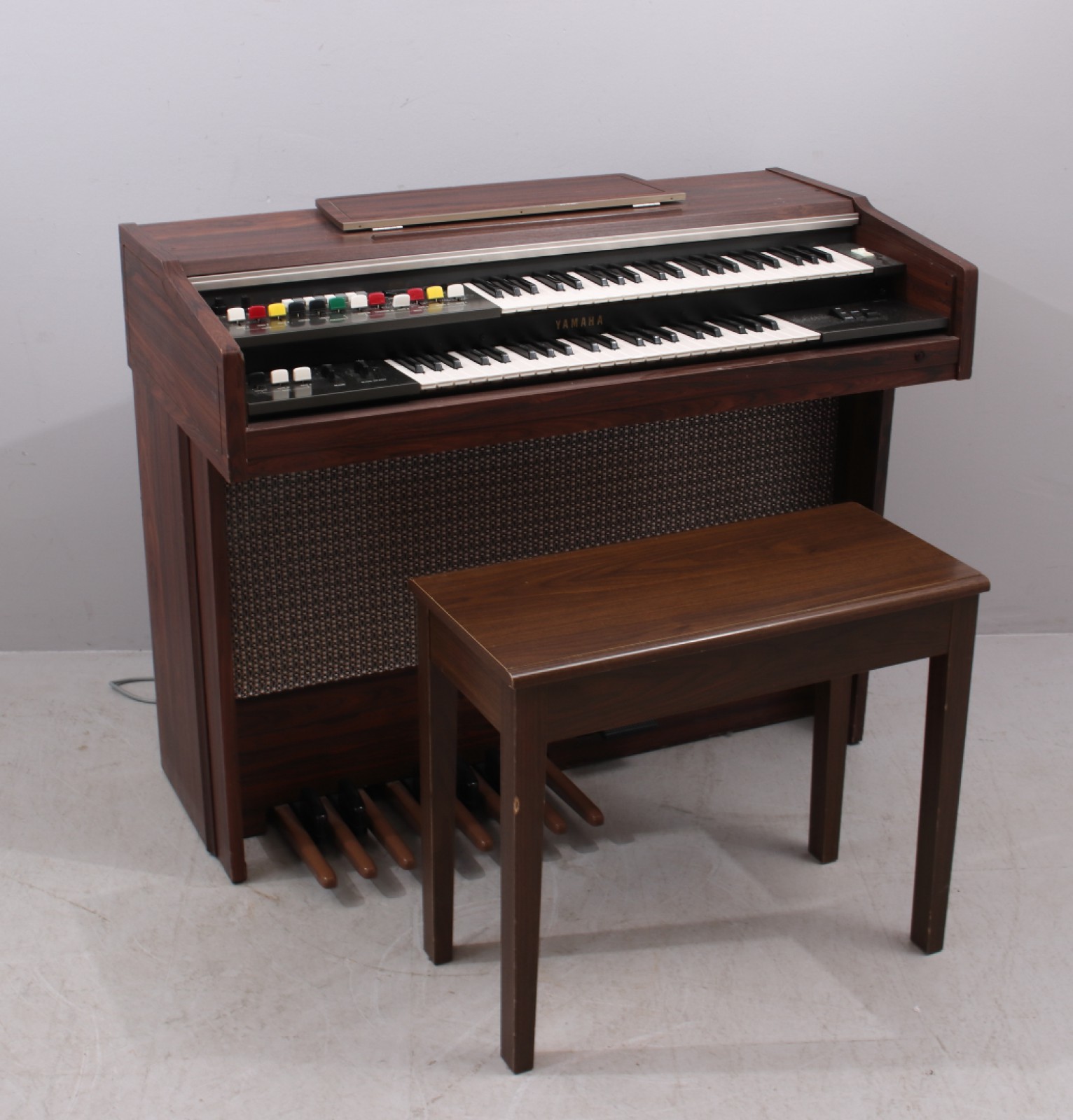 Yamaha B-5CR samt pall, 1970,80-tal, piano H.90, B.111, Dj.55,5 cm, pall H.55, B.66, Dj.32 cm. (vån1)