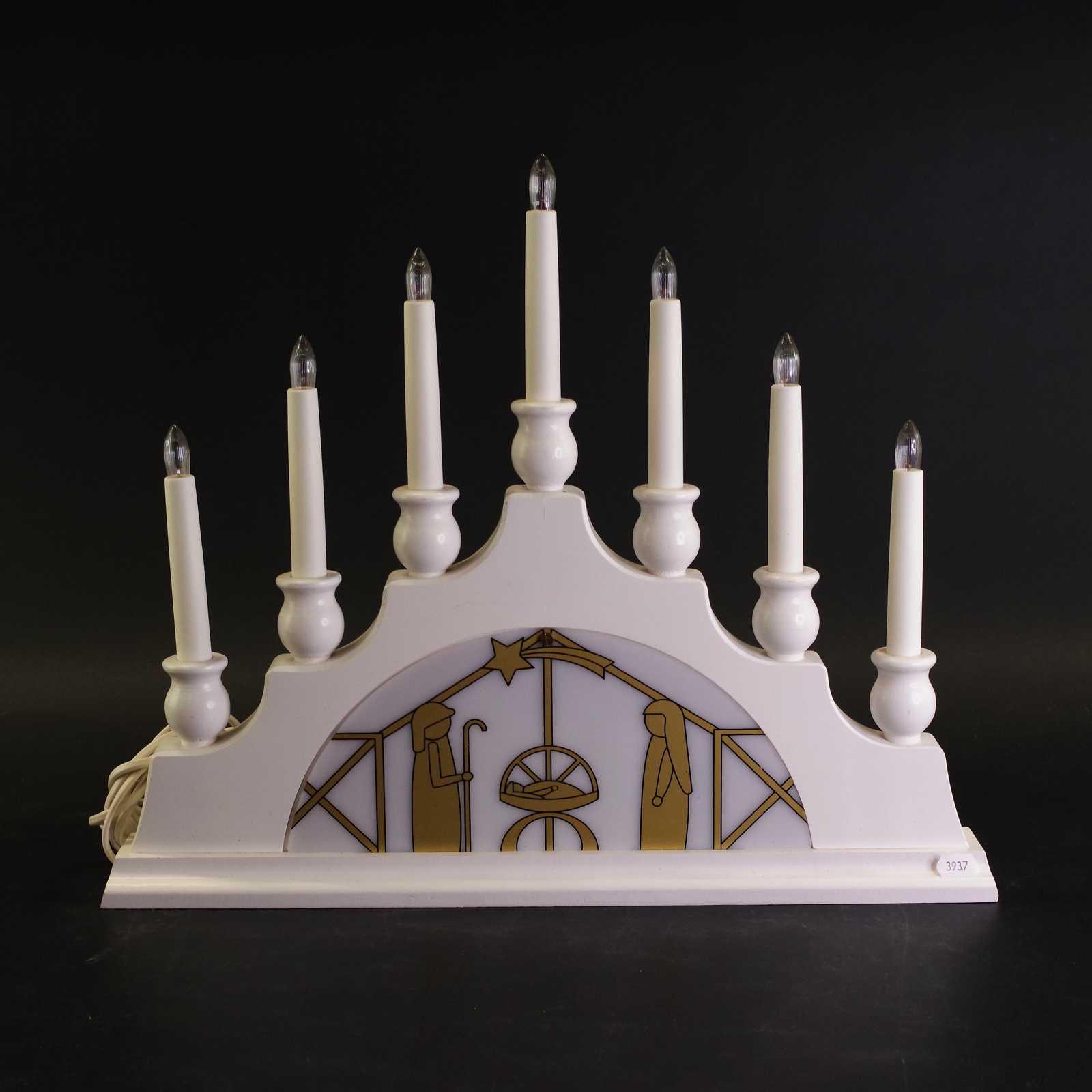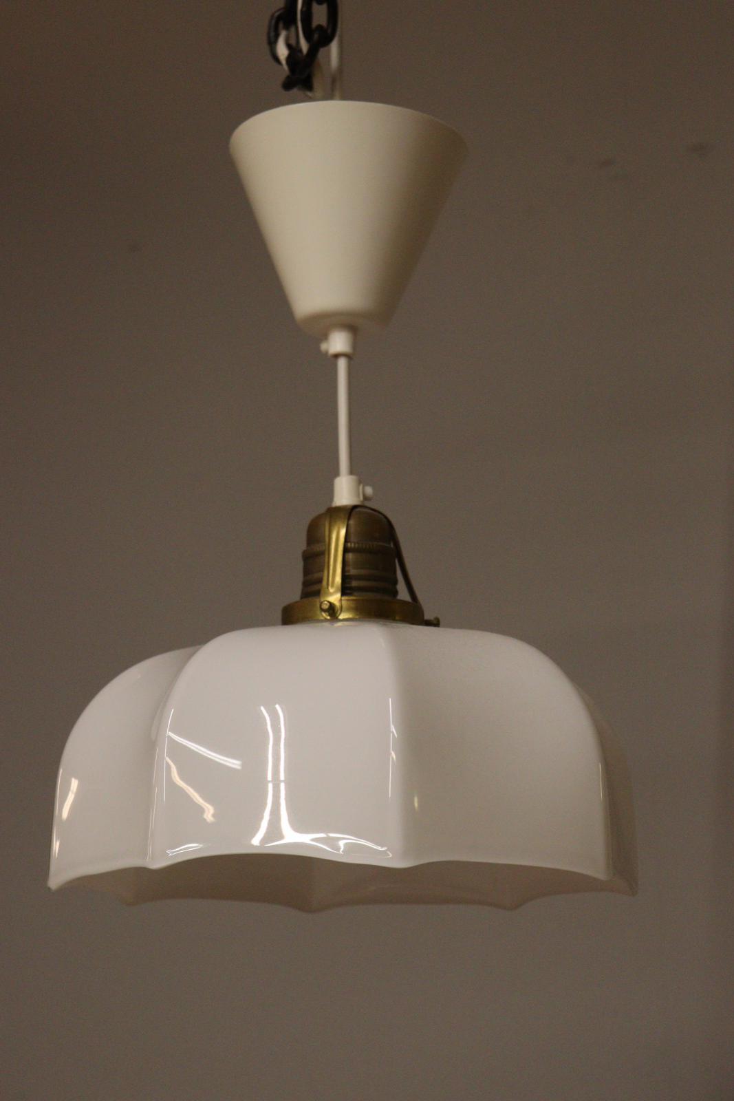 Alm och mässingsfärgad metall. Skärm invändigt lackad. Två ljuspunkter.