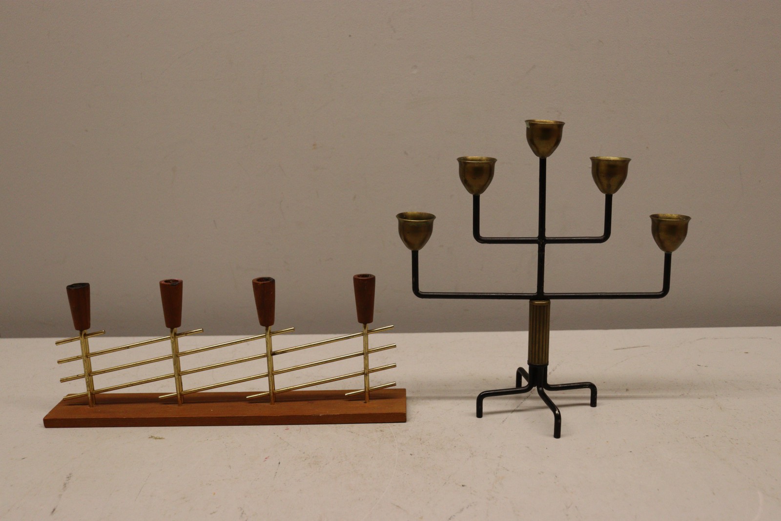 Teak/mässing. Smide/mässing. H: 14-28 cm.