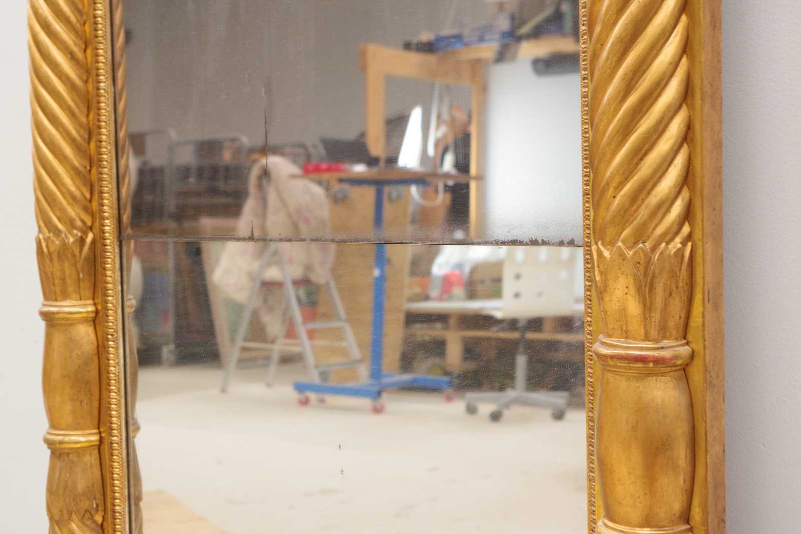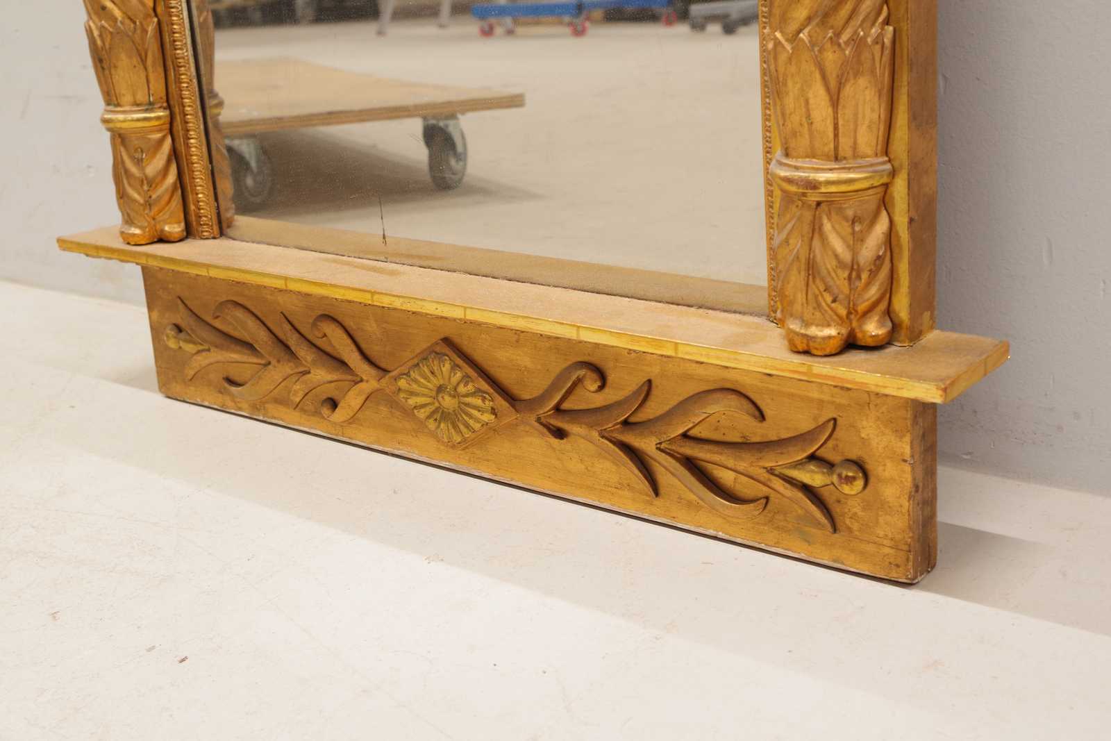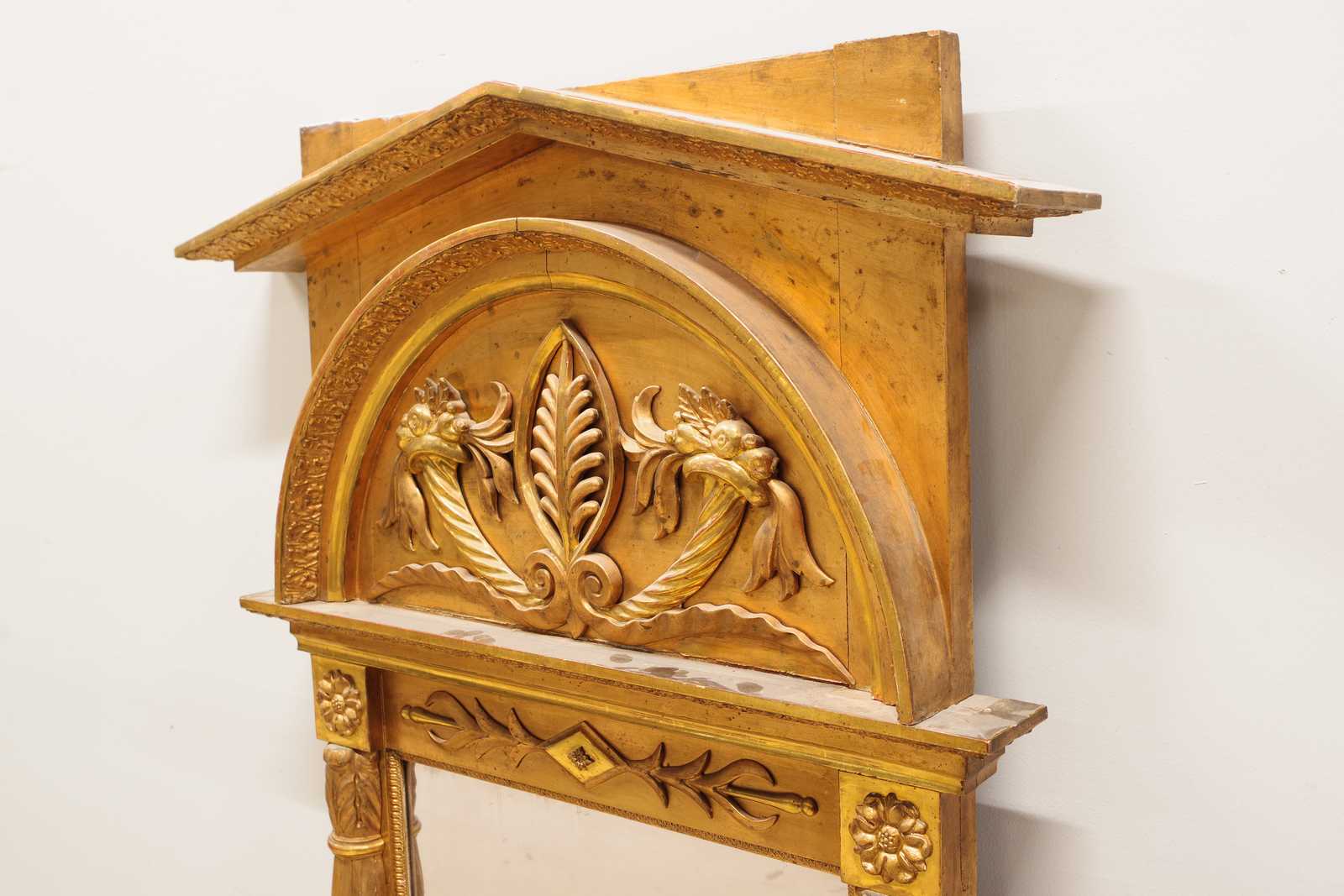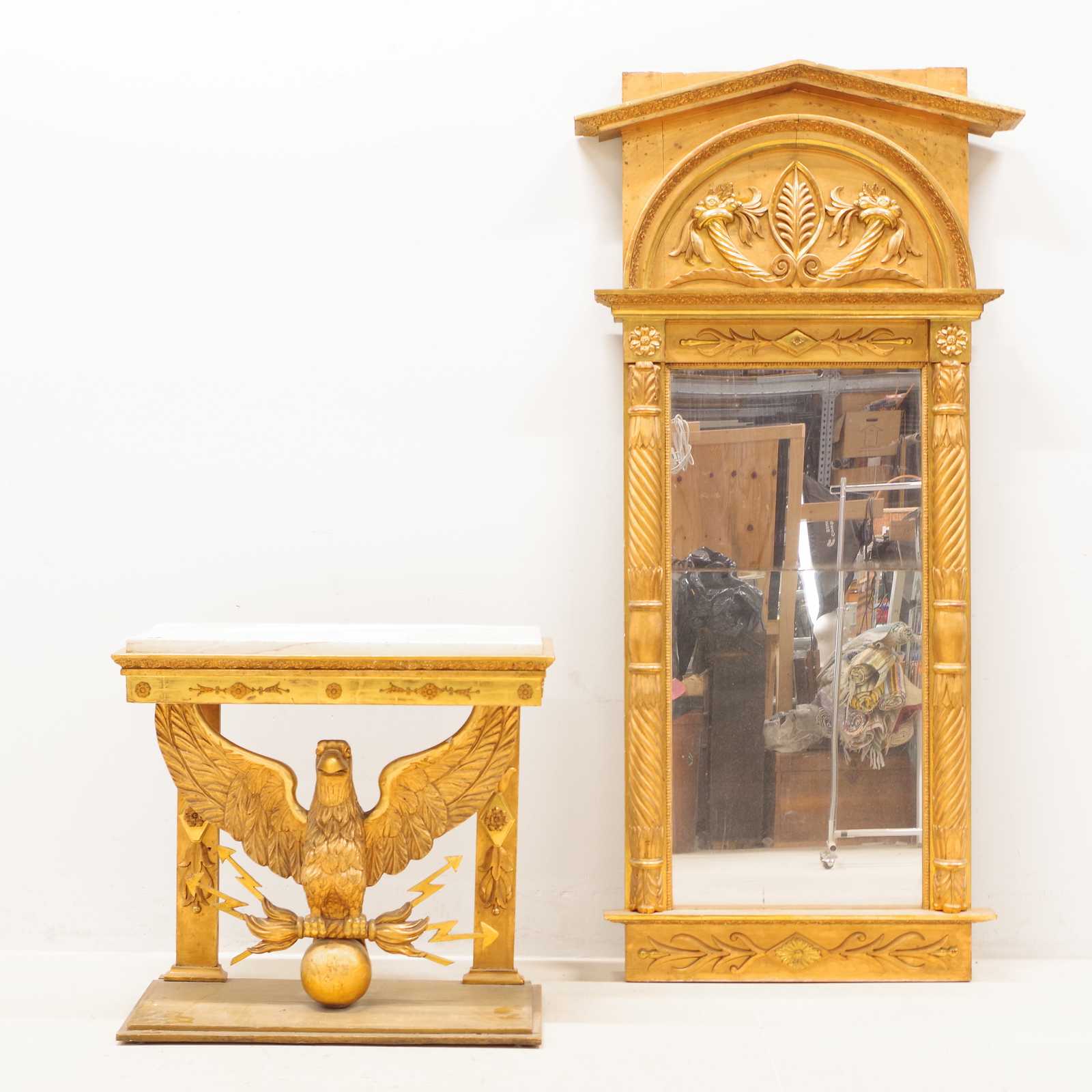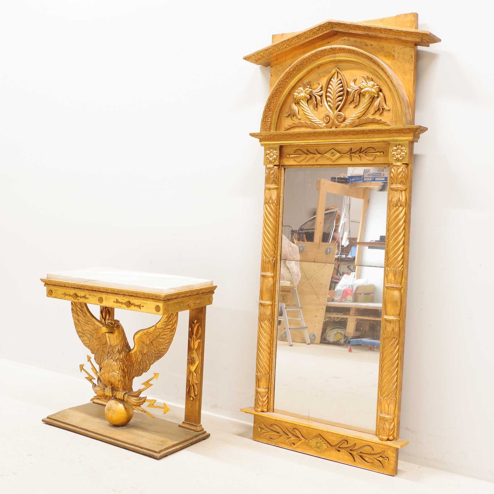 Bilder KONSOLBORD Empire, form av örn med åskviggar, med en senare stenskiva & SPEGEL med originalglas, troligen från Göteborg, 1800 tal. konsolbord H:75x 79x 37cm. Spegel 70x186cm. (åldersslitage, bord något ostadigt, nagg, ställvis anlupet glas, senare renovering & komplettering)
