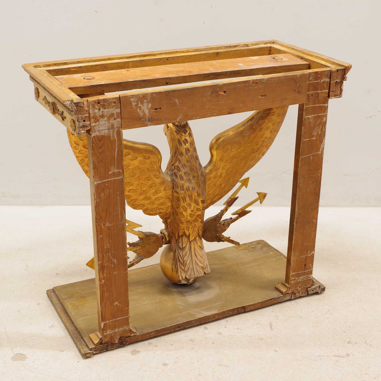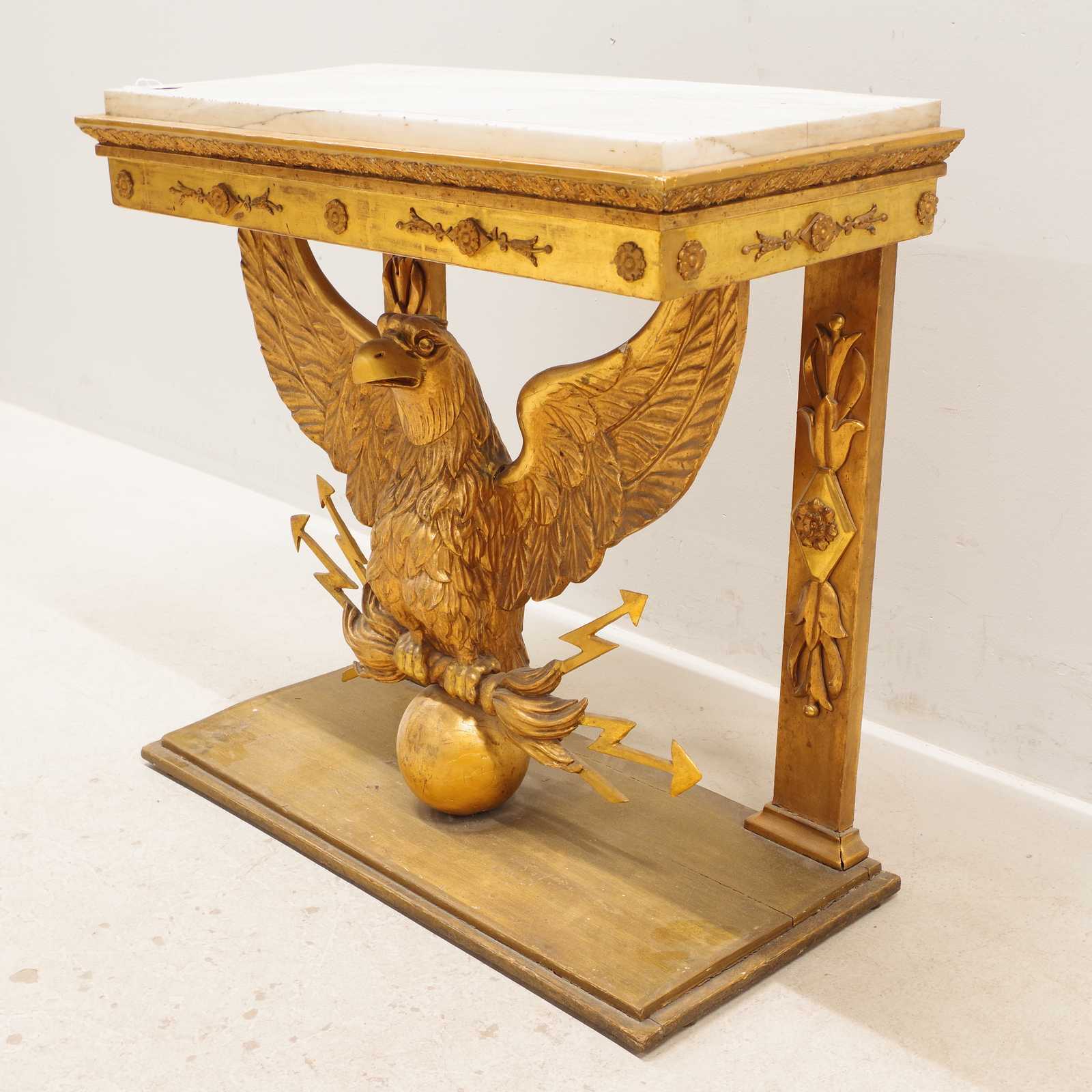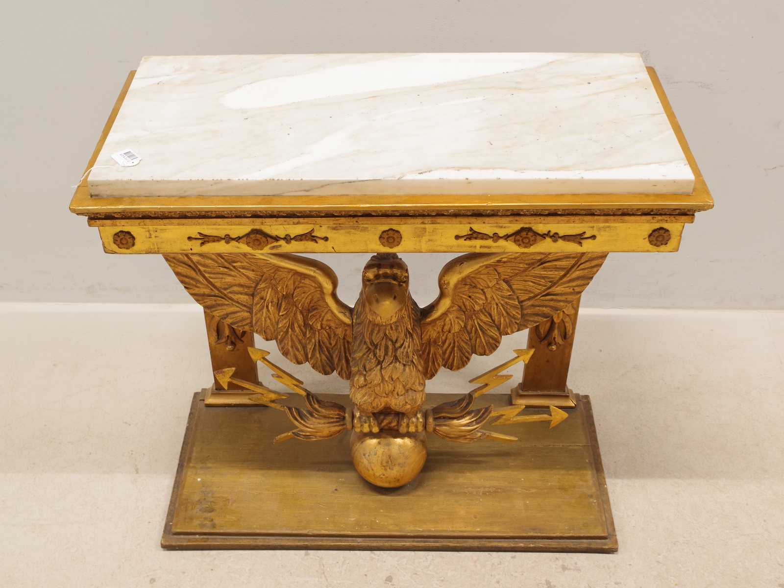 Auktioner KONSOLBORD Empire, form av örn med åskviggar, med en senare stenskiva & SPEGEL med originalglas, troligen från Göteborg, 1800 tal. konsolbord H:75x 79x 37cm. Spegel 70x186cm. (åldersslitage, bord något ostadigt, nagg, ställvis anlupet glas, senare renovering & komplettering)