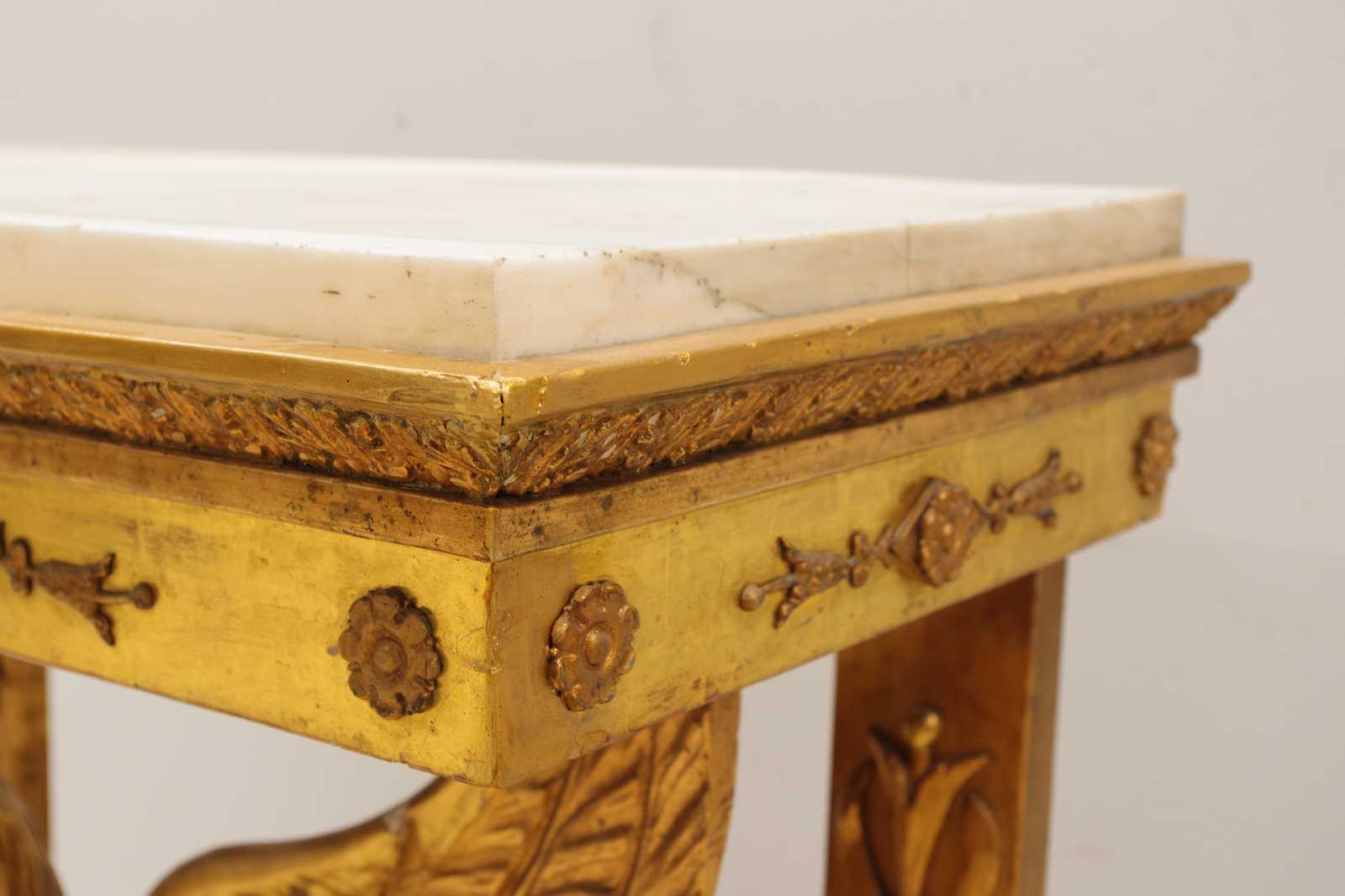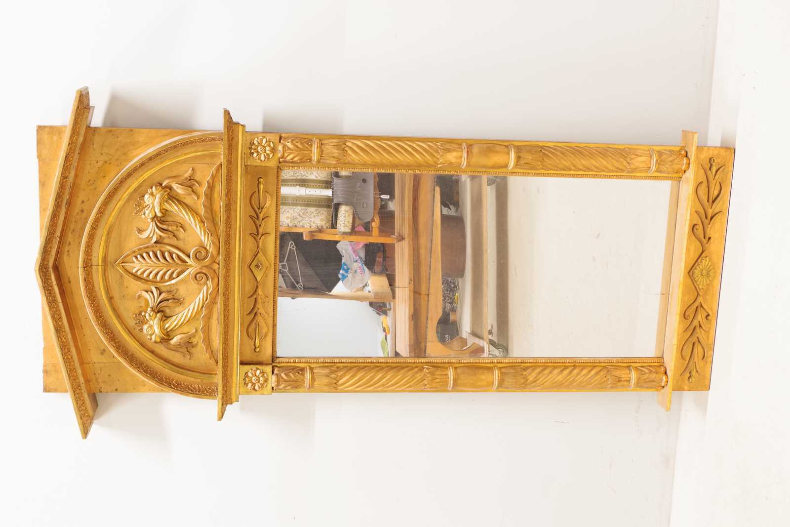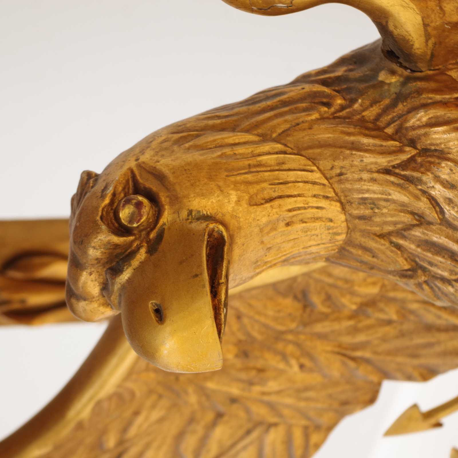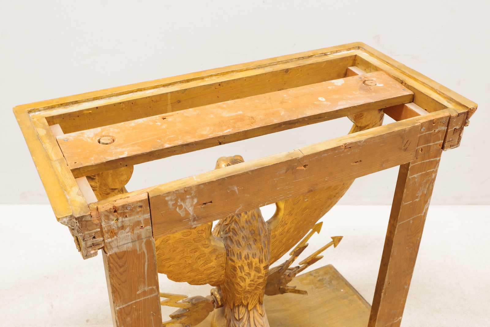 Auktioner KONSOLBORD Empire, form av örn med åskviggar, med en senare stenskiva & SPEGEL med originalglas, troligen från Göteborg, 1800 tal. konsolbord H:75x 79x 37cm. Spegel 70x186cm. (åldersslitage, bord något ostadigt, nagg, ställvis anlupet glas, senare renovering & komplettering)