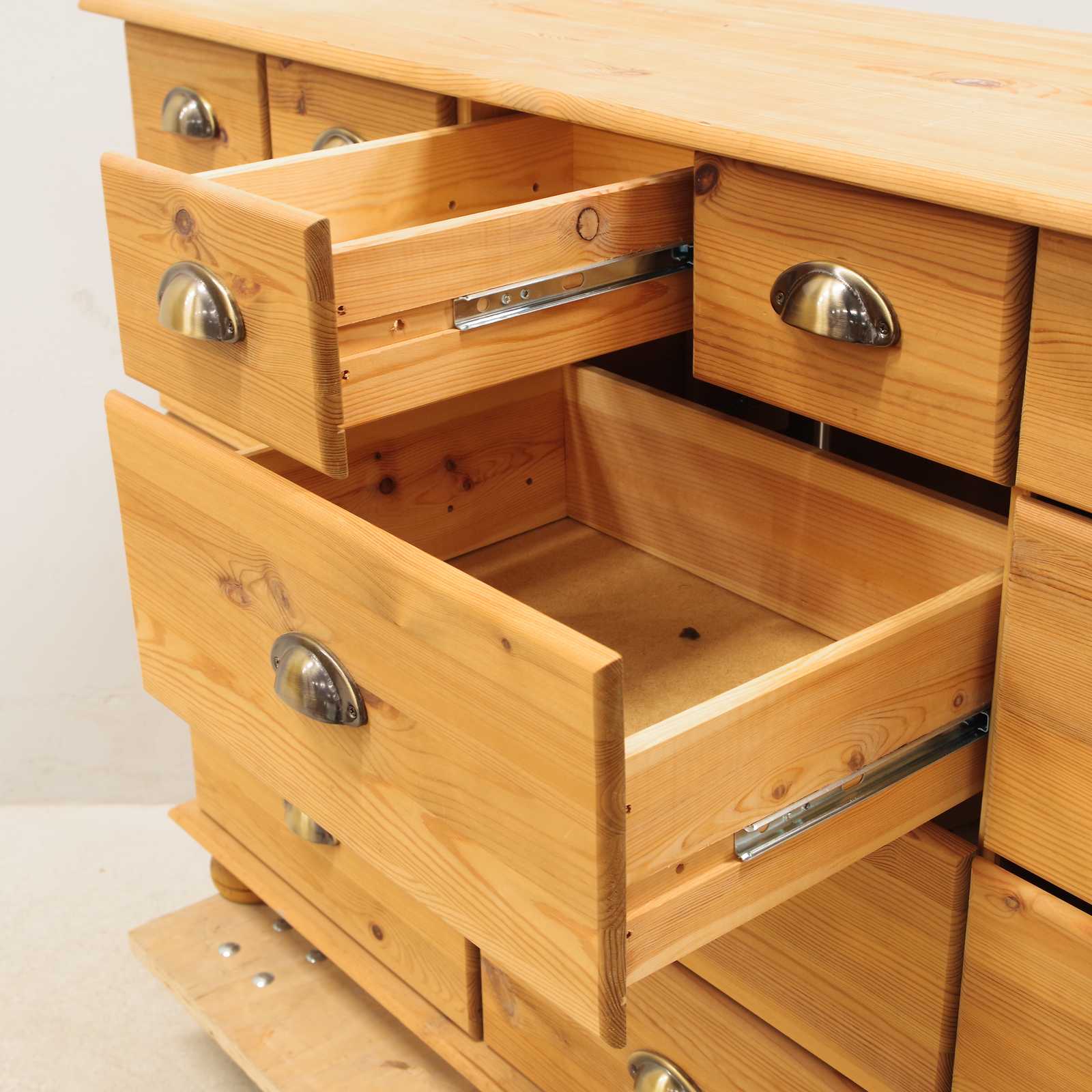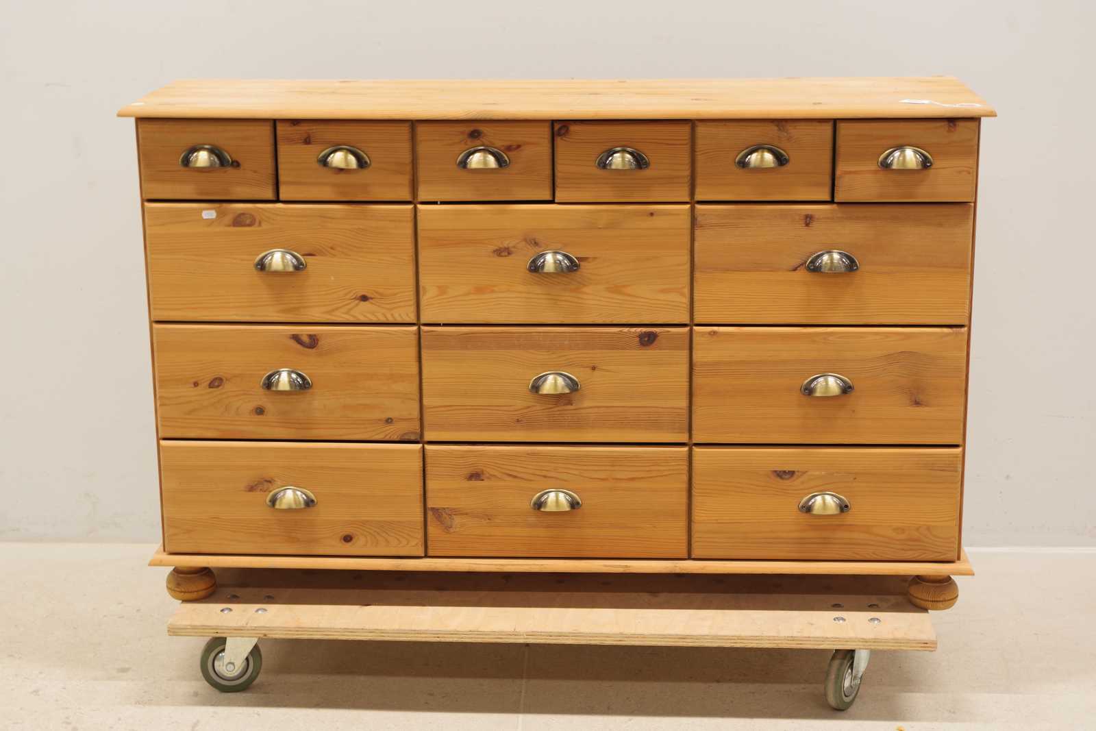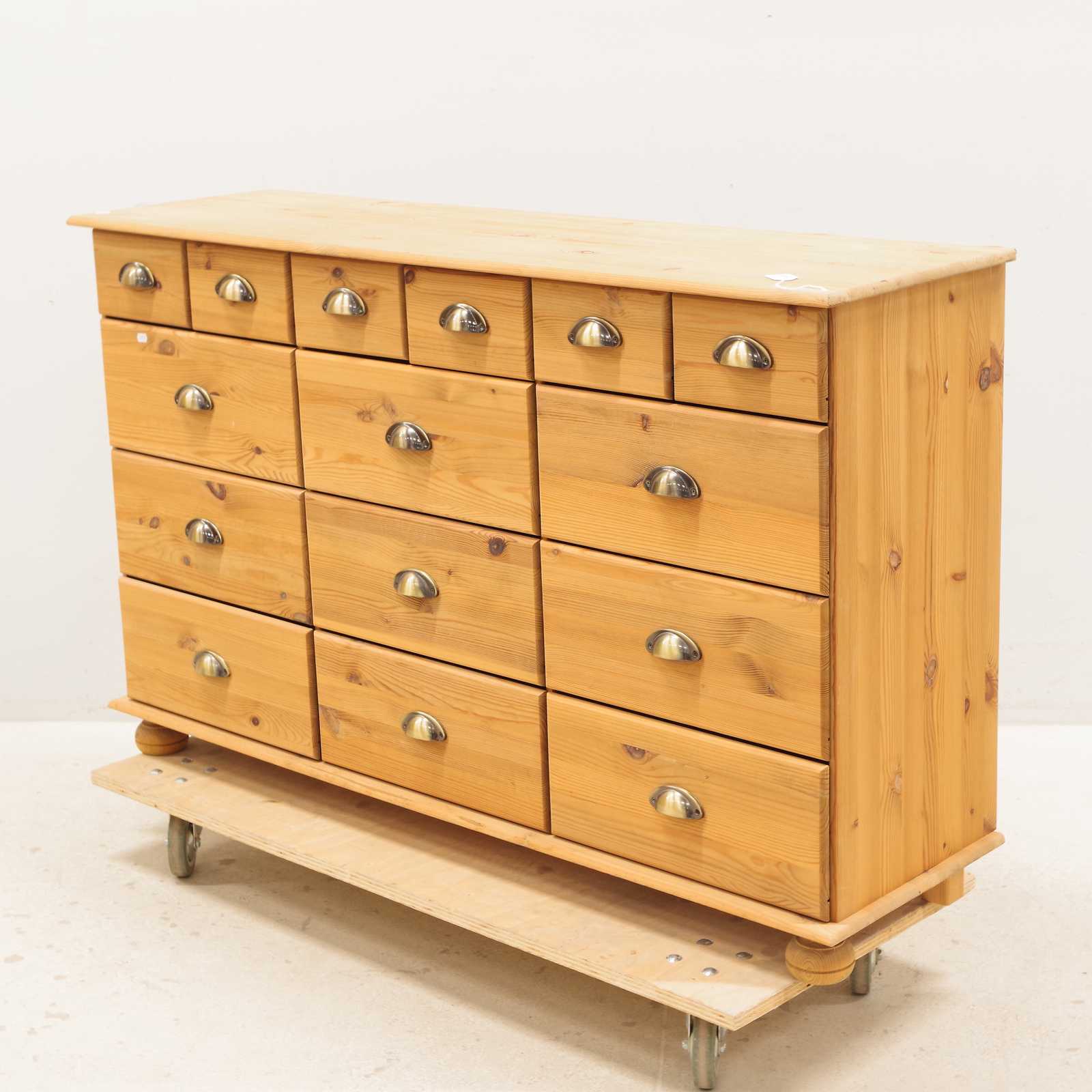KÖPMANSDISK, furu, 15 lådor, 1900-talets andra hälft, H: 80x 131x 38cm (bruksslitage)