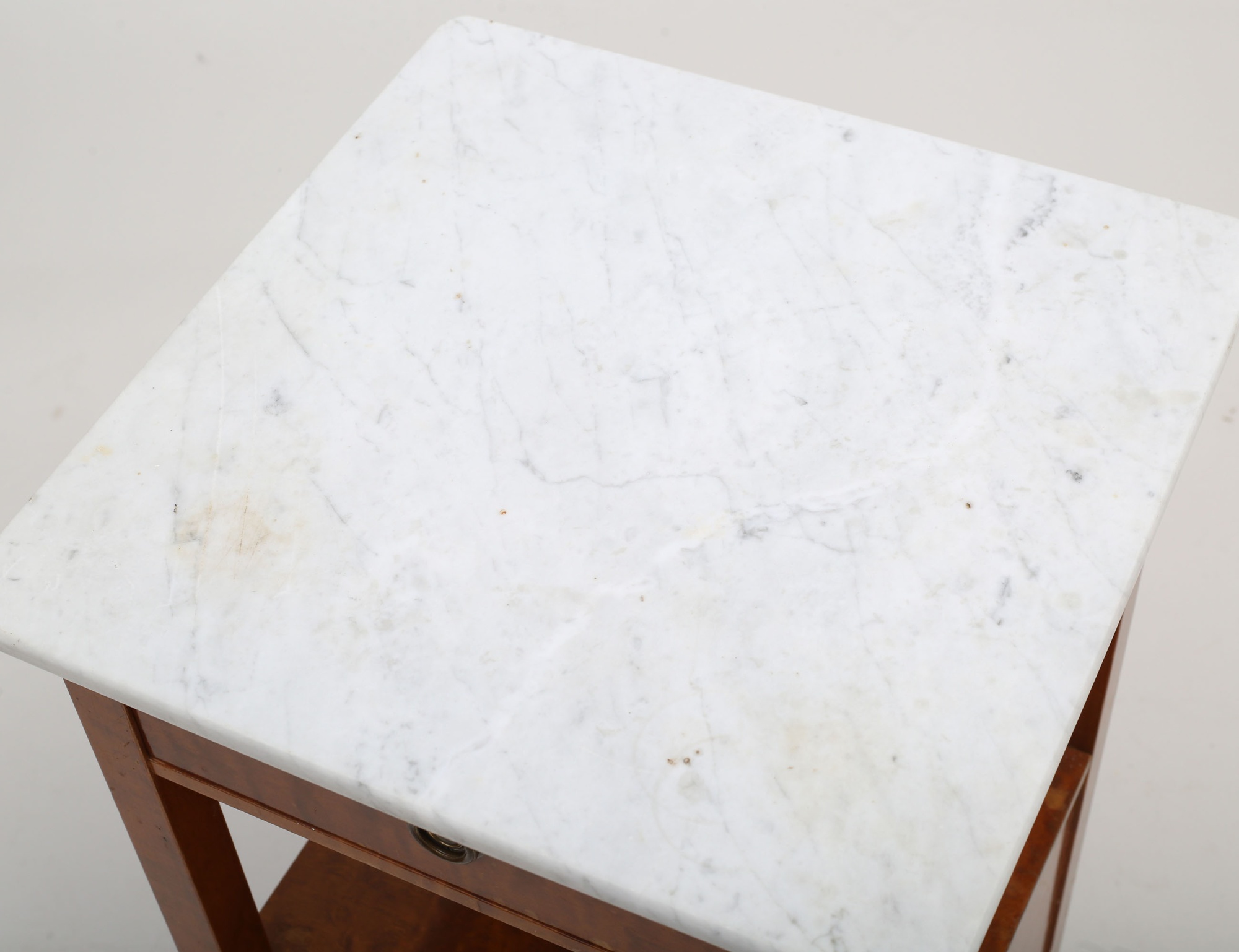 björk, en låda och skåp, beslag i mässing , skiva i vit marmor, höjd 74, bredd 40x40 (bruksslitage, smärre fläckar)