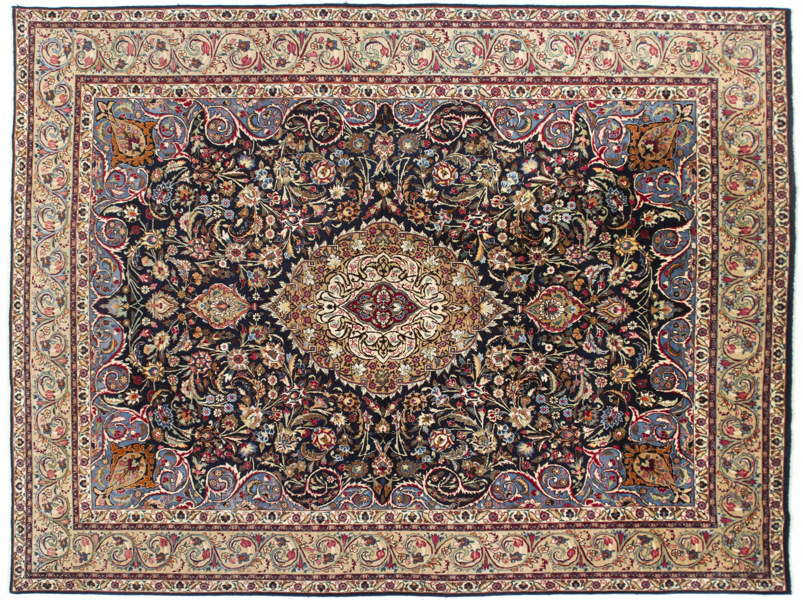 Orientmatta/salongsmatta, handknuten, blå botten med ljus bård och medaljong, dekor i form av växtlighet, mått ca 370 x 288 cm