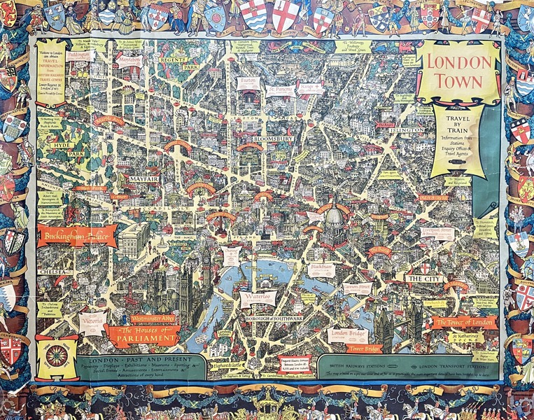 Original vintage Travel By Train map poster for London Town by the British artist, illustrator and poster designer Kerry Lee (1902-1988) featuring a detailed pictorial map of central London with captions including notable and historical buildings, churches, streets, parks and trees, sports and activities, local characters and tourists, mainline railway stations, markets, the City of London and the River Thames with decorative illustrations framing the map including flags and coat of arms with people from the Commonwealth Empire nations as well as the royal carriage in a royal procession for the State Opening of Parliament and crown above shields bearing the crosses and flags with the Union Jack in the centre at the top and an image of the artist and his dog in the corner at the bottom, issued by British Railways, promoting London's past and present including Pageantry, Displays Exhibitions Museums Sporting and Social Events Amusements Entertainments and attractions of every kind all to hand by London's Underground. Large size.