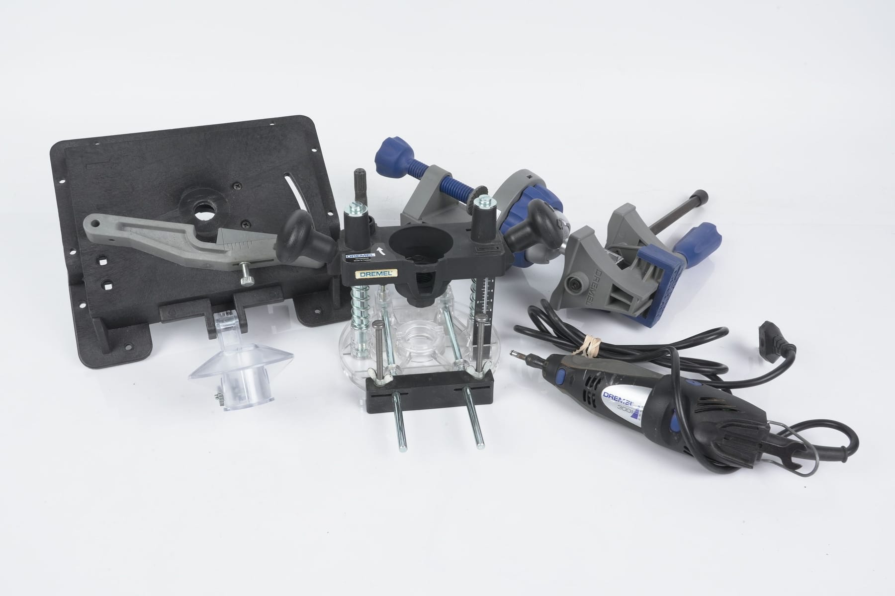 FRÄSBORD, ÖVERHANDSFRÄS, SLIPPENNA samt LEDAT SKRUVSTYCKE, DREMEL