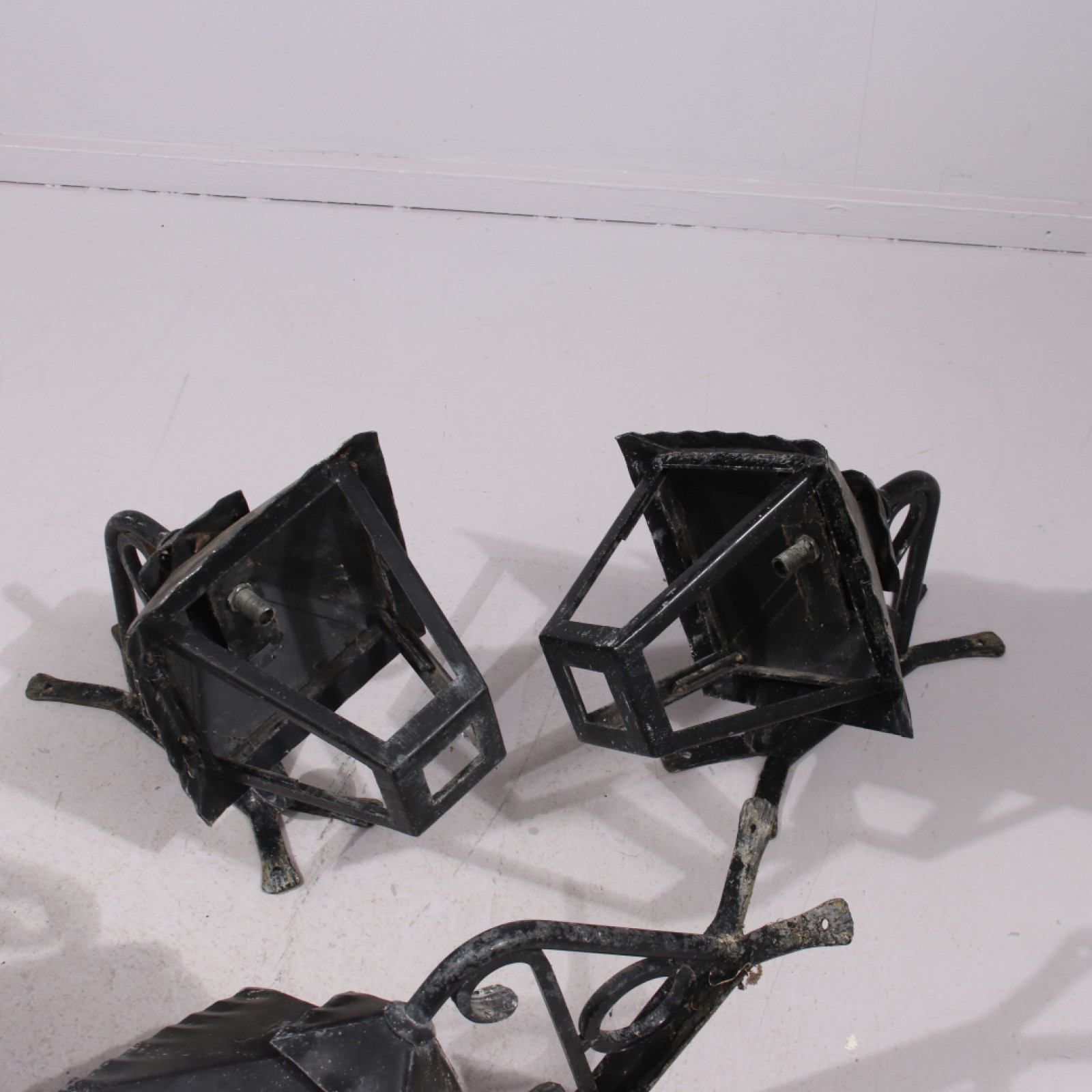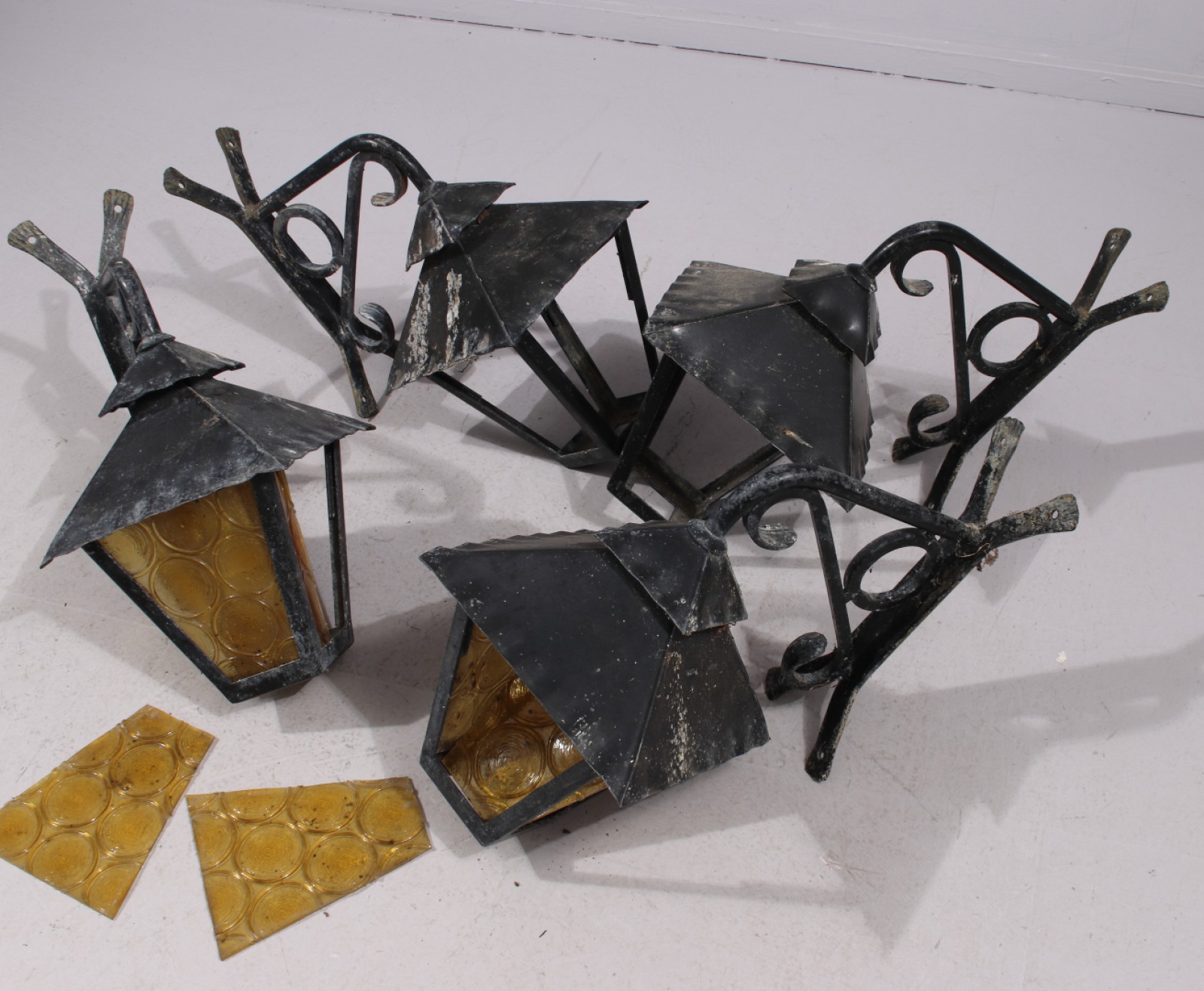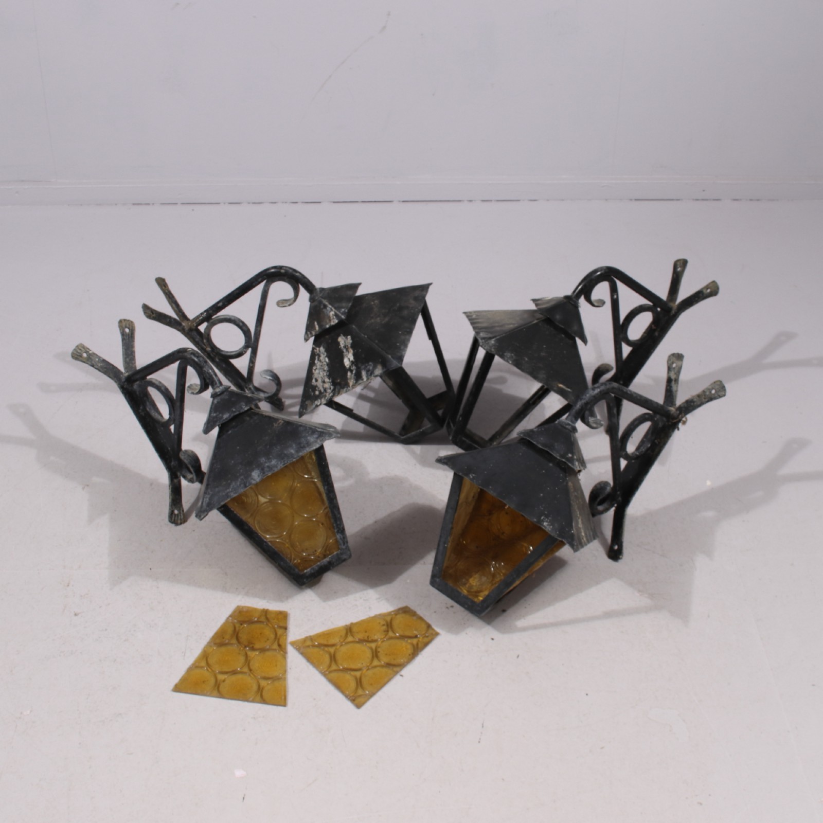 4 stycken, smide, plåt och glas, 1900-talets andra hälft, el saknas, 3st saknar lamphållare, glas saknas delvis (se bilder), rep.objekt, höjd ca:45 cm. (vån2)