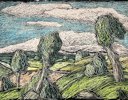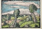 This hand-colored woodcut print, titled "Landschaft" (Landscape), presents a stylized rolling countryside with expressive trees, hills, and a vast sky, executed in a dynamic and almost surreal manner. The intricate line work and color application create a sense of movement, emphasizing the organic flow of nature. The piece is a limited edition print, numbered 29/30, and signed by the artist Lars Holmqvist in 1949.