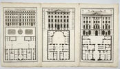 A set of three neoclassical architectural engravings by Jean-François de Neufforge, each depicting an elegant urban façade accompanied by detailed floor plans. These compositions reflect the Enlightenment ideals of symmetry, proportion, and functional design, aimed at harmonizing residential and commercial architecture.