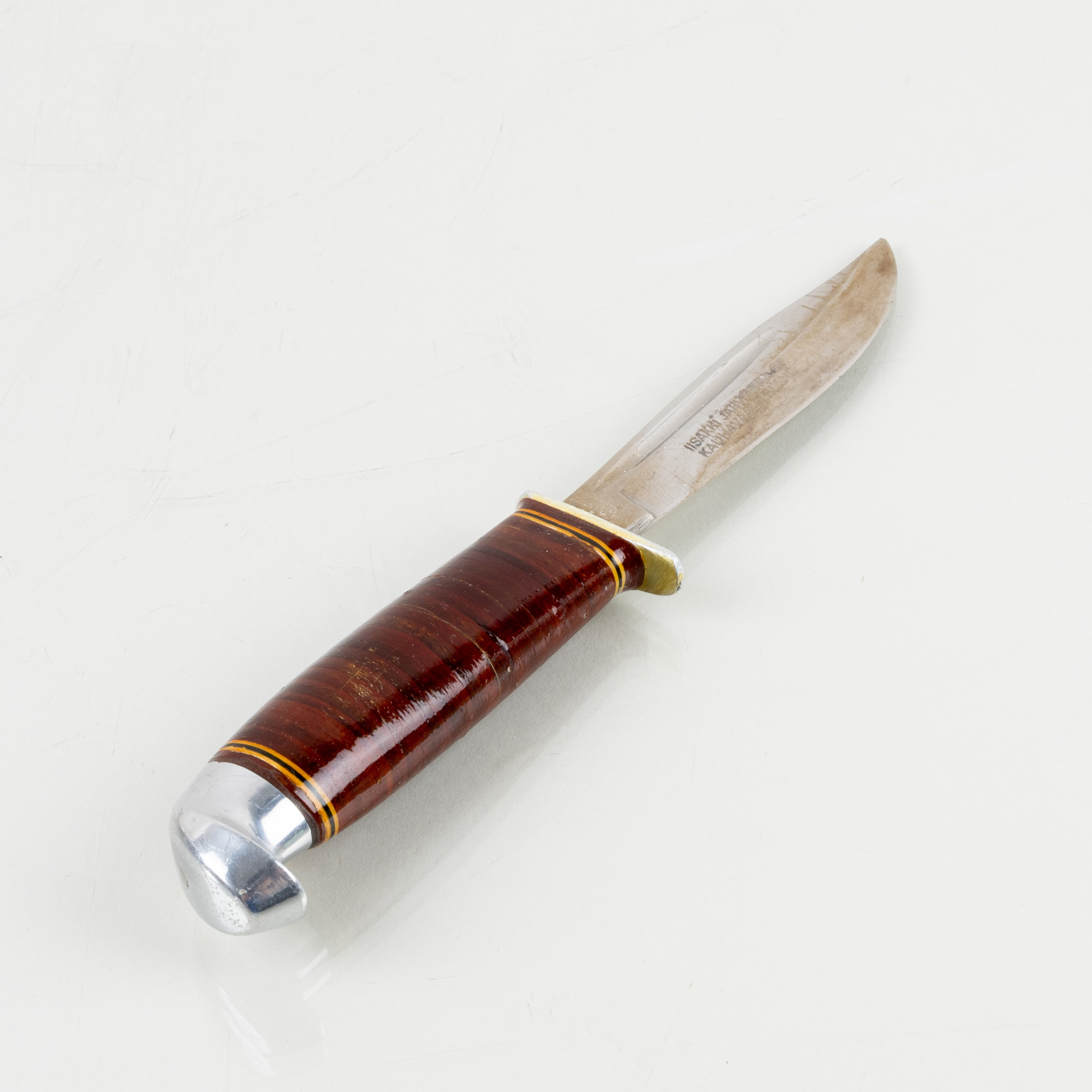 Skaft av trä, blad av stål, slida av brunt läder, knivens längd ca 18,5 cm