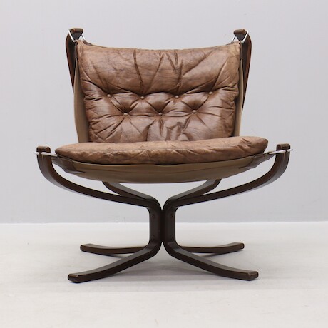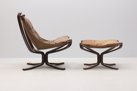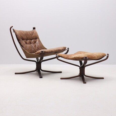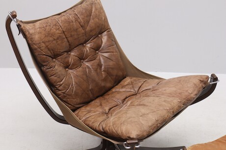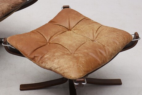 Bilder Sigurd Ressel, fåtölj med fotpall "Falcon chair", Vatne Möbler, Norge, 1970-tal. böjträ och skinn
