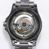 Svart urtavla med målade arabiska index, datumvisning kl. 3, silverfärgade visare med lysmassa, sekundvisare med kontrasterande röd spets
