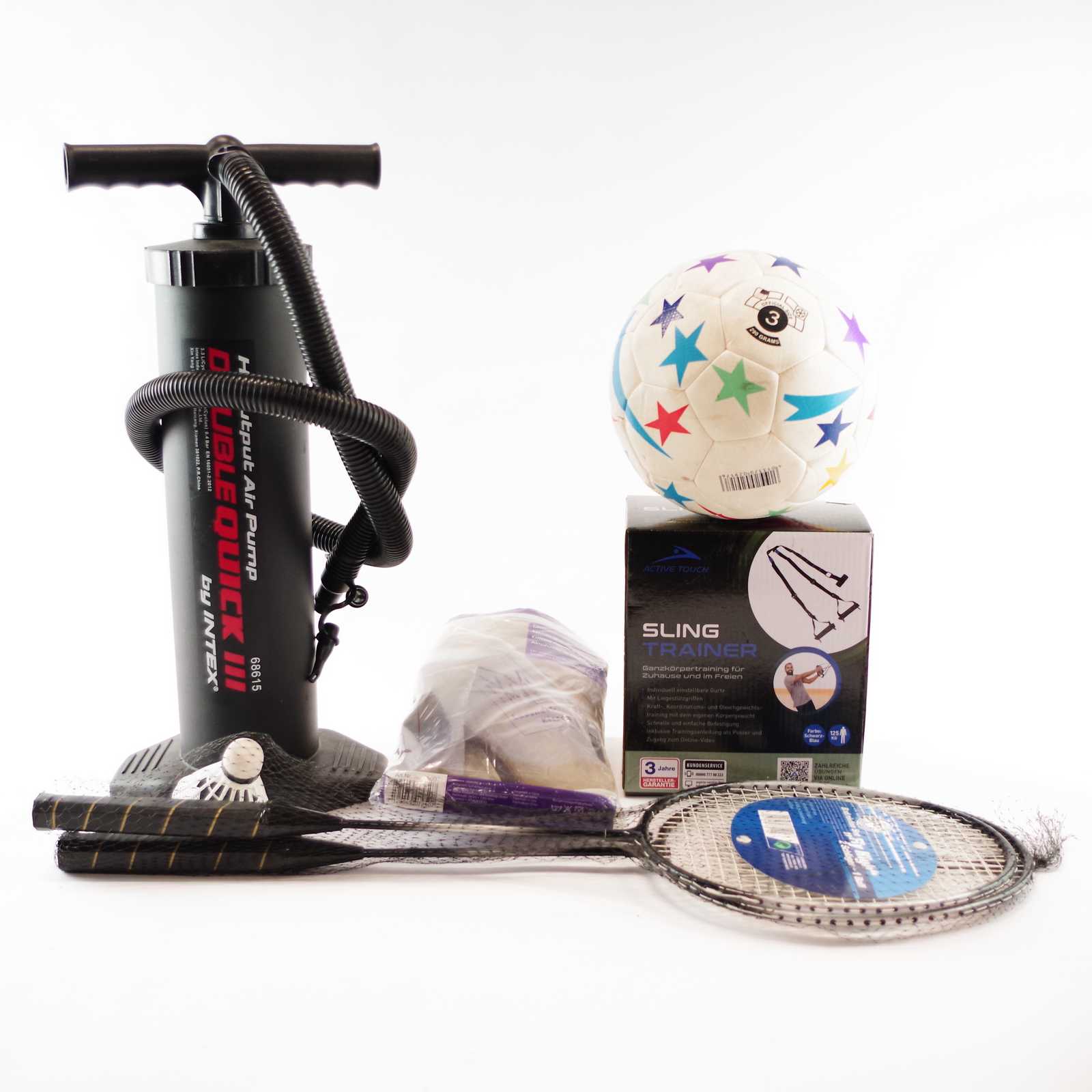 TRÄNINGSREDSKAP, FOTBOLL, BADMINTONSET, PUMP & VETEKUDDE