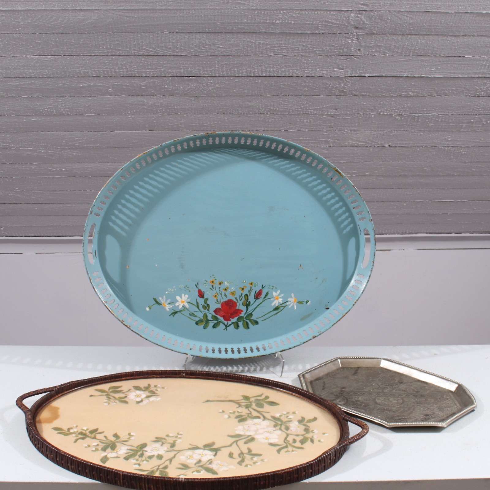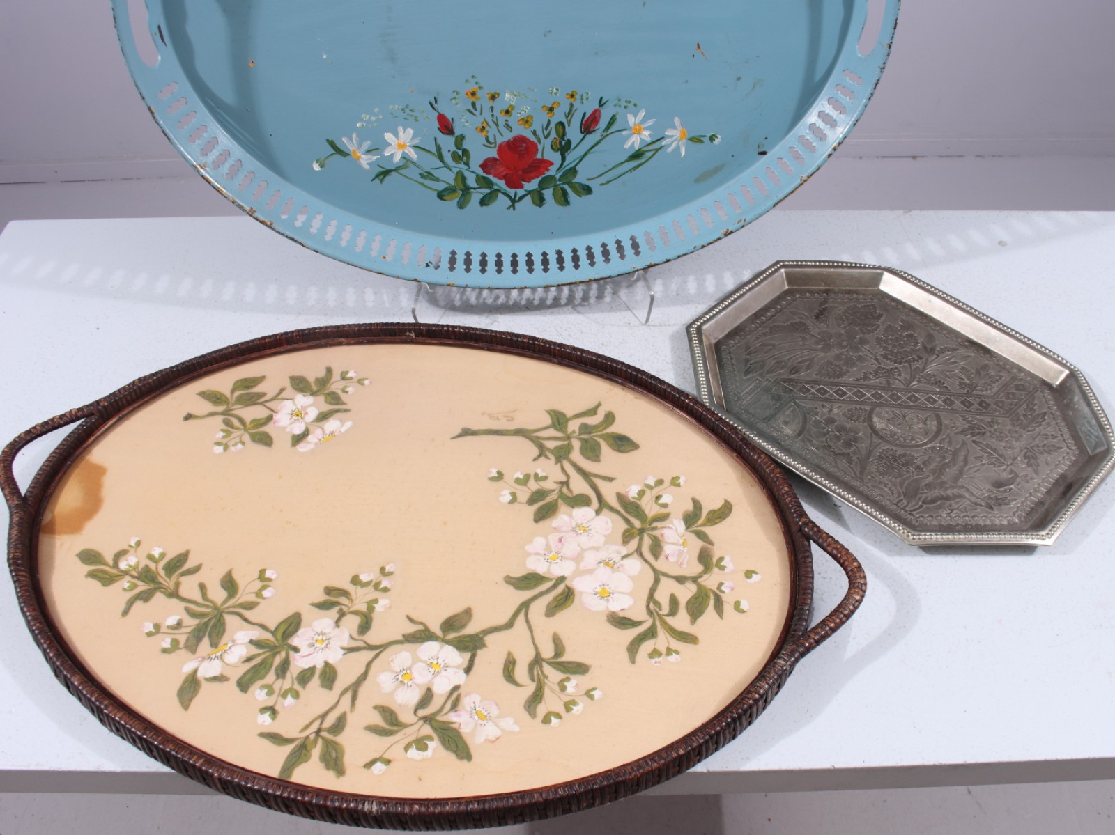 3 stycken, olika material, 1900-tal, plåtbricka ställvis med färgslitage, skiva på rottingbricka med fläckar, L.35-58 cm, B.27-46 cm. (vån3)