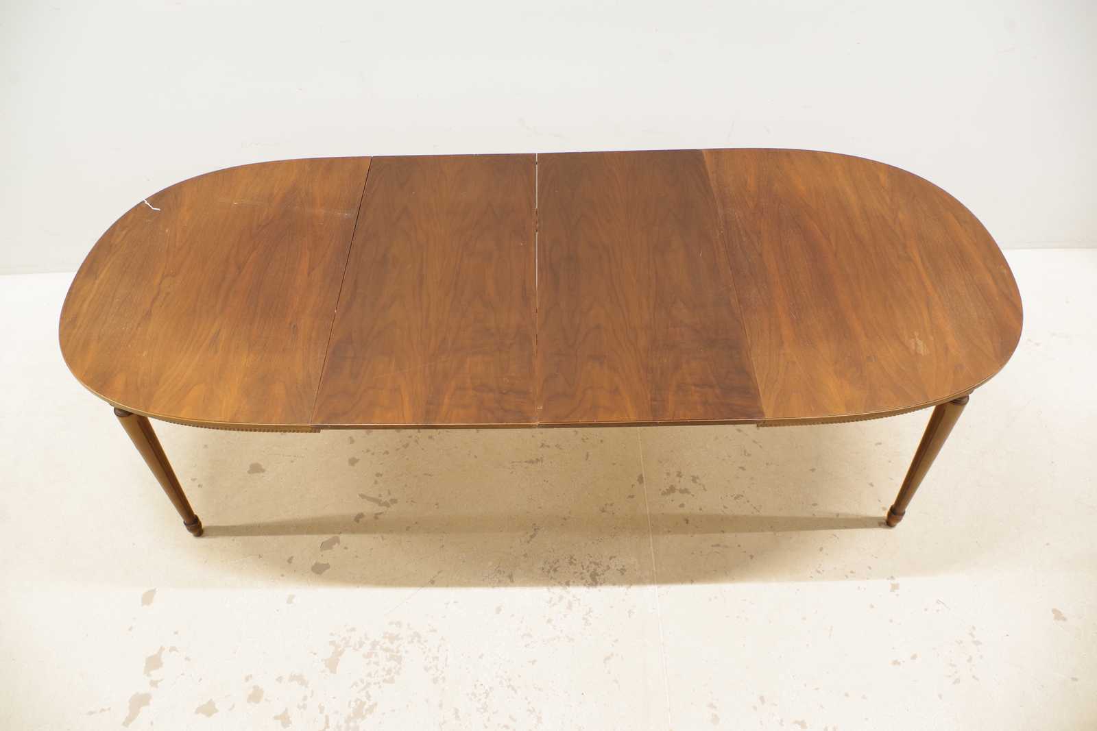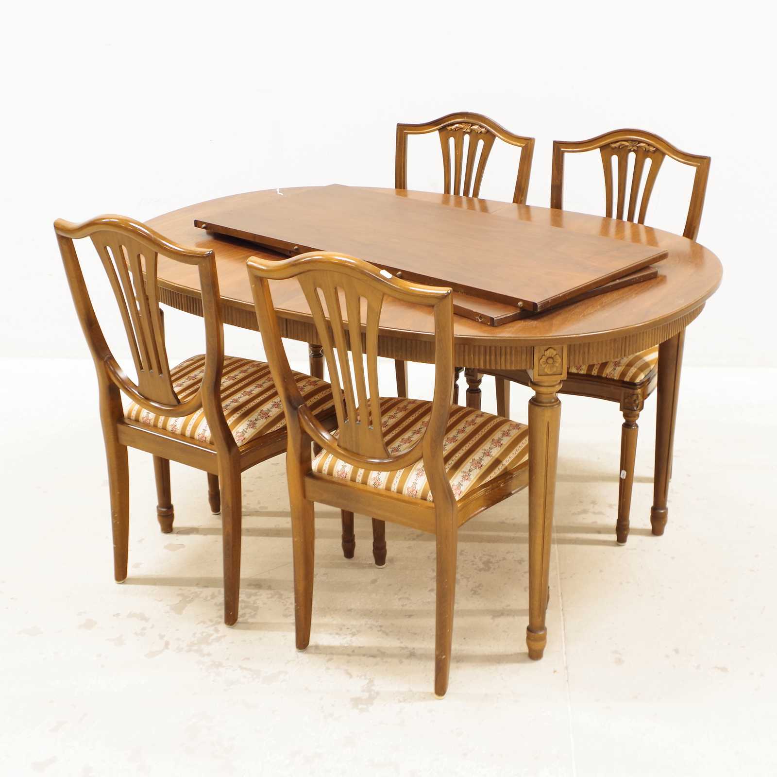MATGRUPP "Axet" Gustaviansk stil, 1900 talets andra hälft, stolar 4st & bord H:74x 100x 140cm + 2st iläggskivor 48cm/st (bruksslitage, skavmärken förekommer)