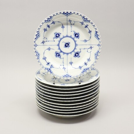 Auktioner Keramik & Porslin Tallrikar 12 st "Musselmalet" helblond, Royal Copenhagen, Danmark, porslin, modell: 1084, diameter 25 cm