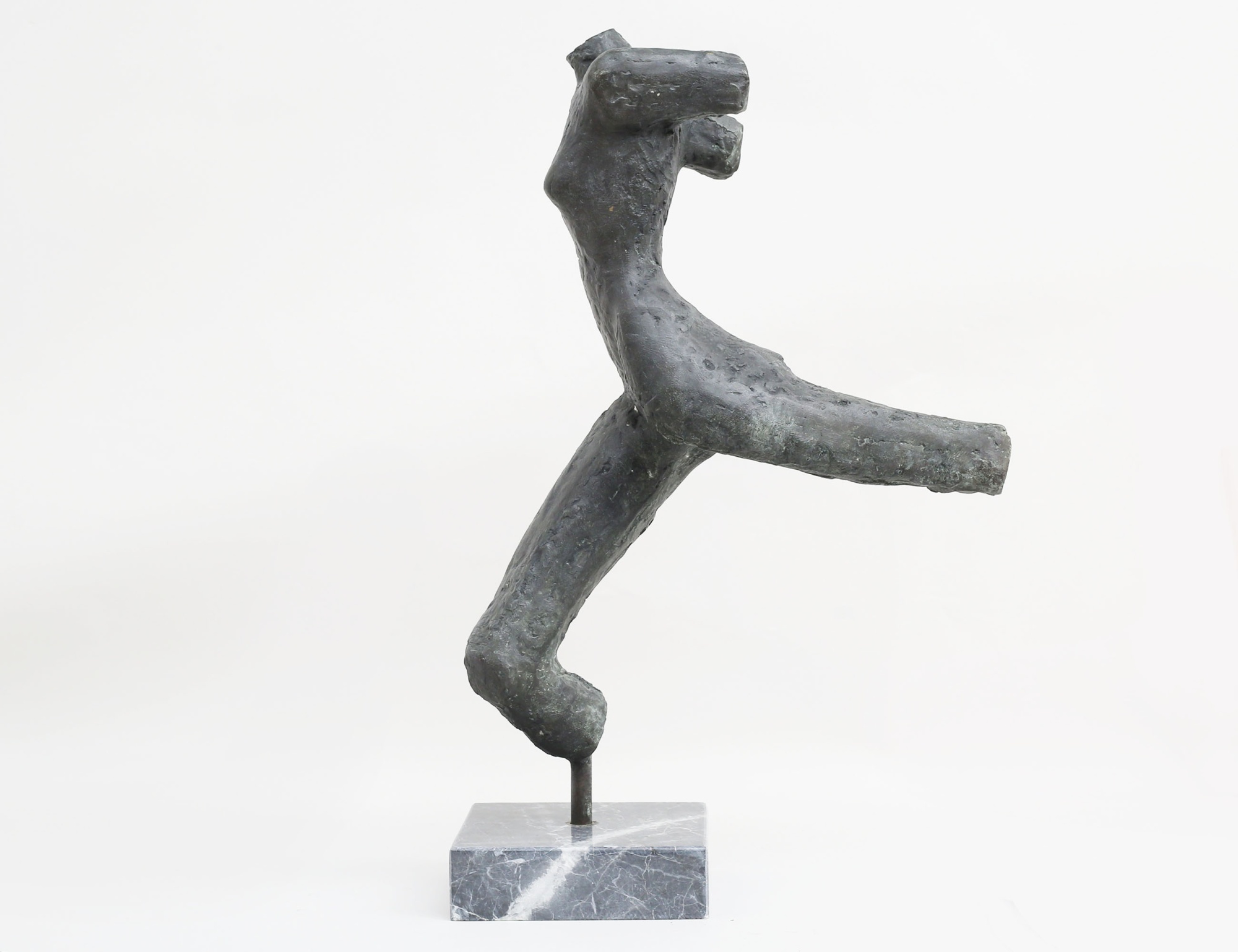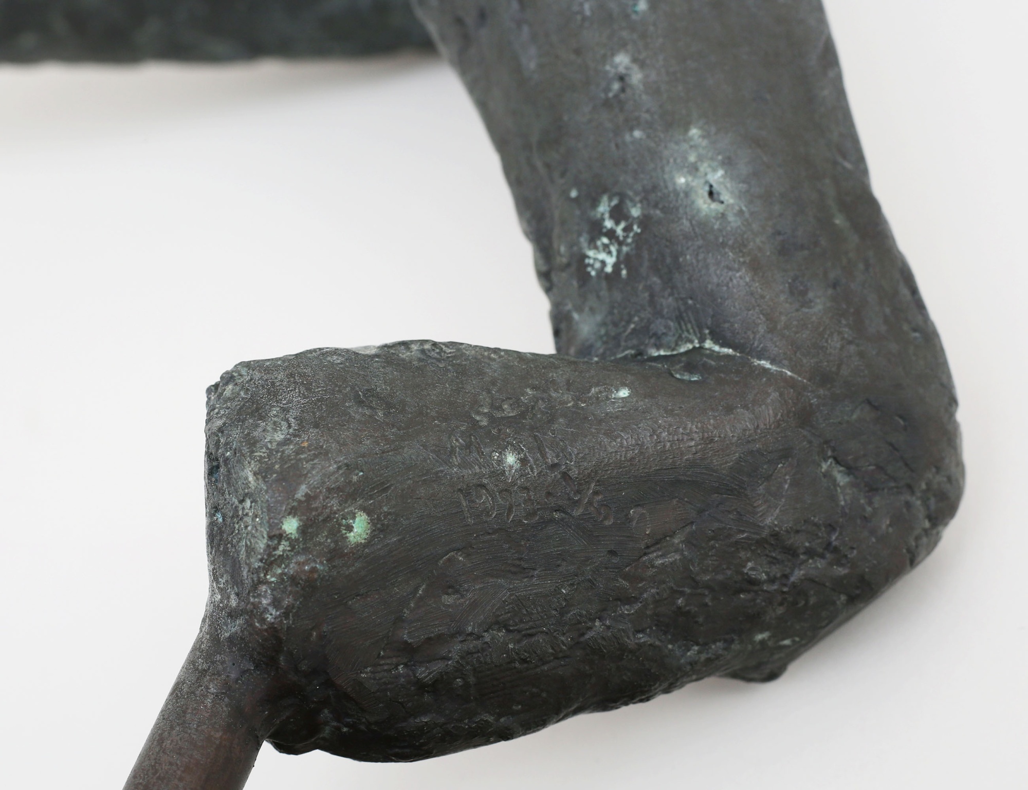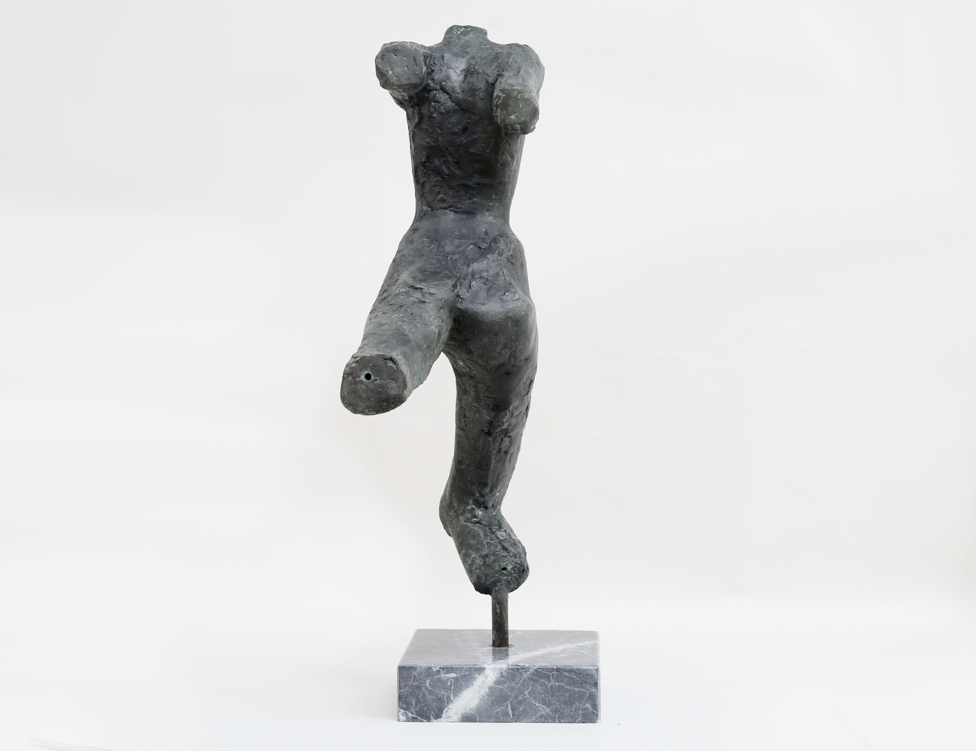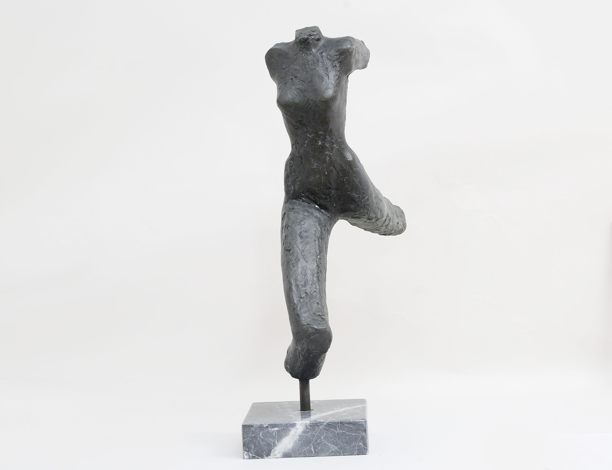 skulptur kvinnokropp i rörelse, mörkpatinerad brons, signerad M. Ali 1993 1/6, monterad på stensockel, höjd 70, bredd 45
