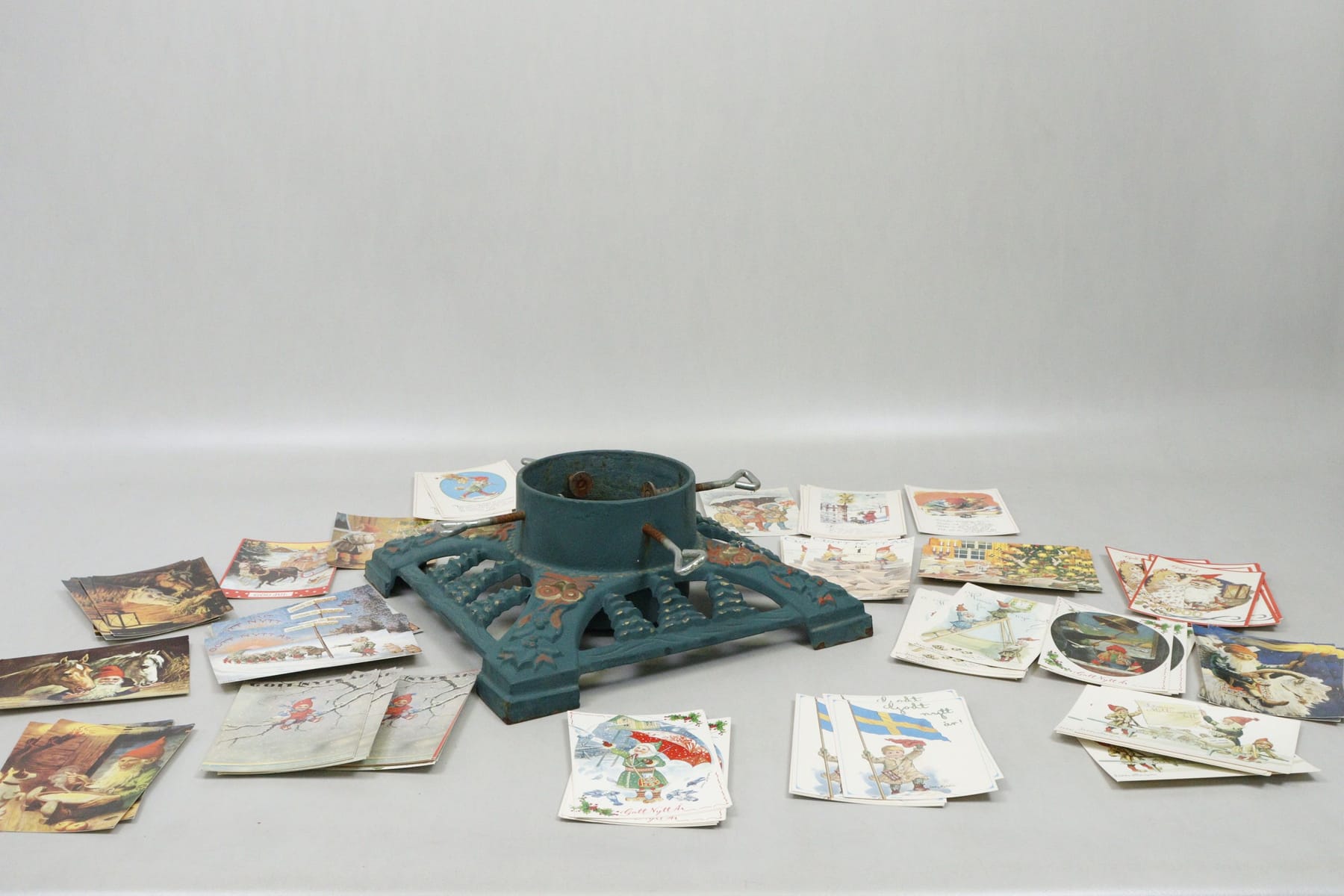 Julgransfot i gjutjärn samt äldre vykort, oskrivna