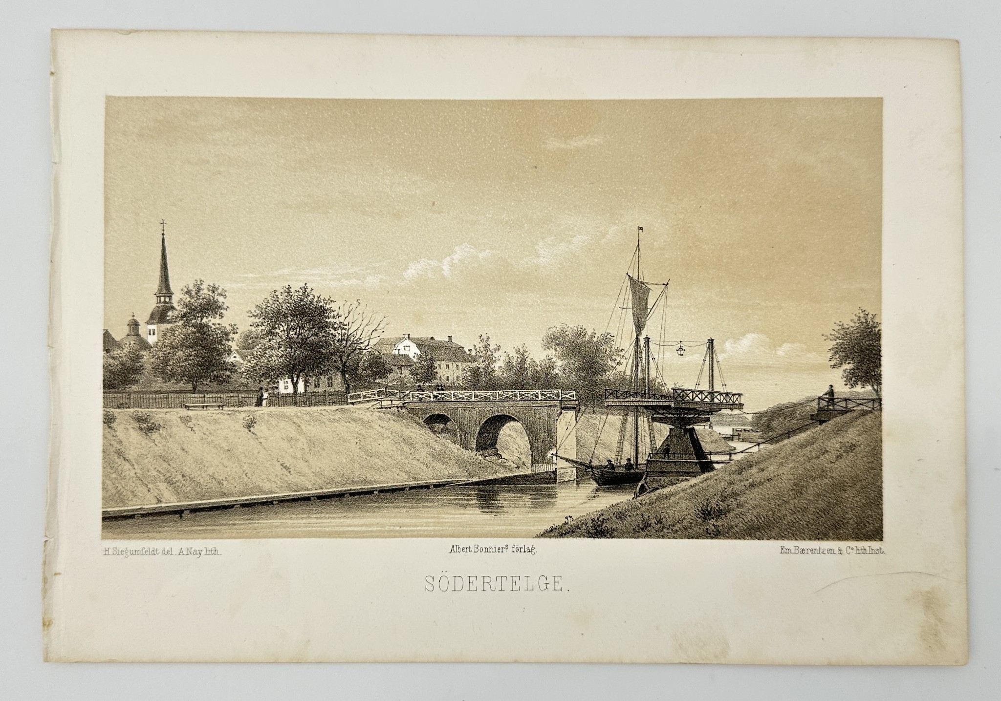 This original chromolithograph depicts a 19th-century view of Södertelge (modern-day Södertälje), a historic town southwest of Stockholm known for its canal connection and tranquil waterways. The scene highlights the natural setting and early industrial charm of the region, capturing waterfront buildings, tree-lined banks, and serene reflections in rich chromatic detail.