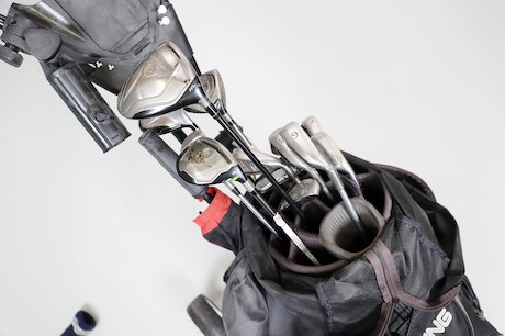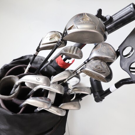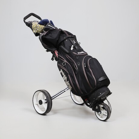 Golbag med klubbor på vagn