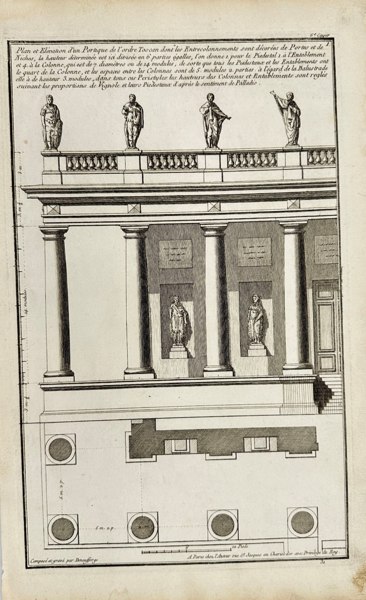 This set of two antique architectural engravings by Jean-François de Neufforge presents a detailed study of a classical portico, including both the plan and elevation. Taken from his seminal work Recueil Élémentaire d’Architecture, published in Paris in 1770, these plates exemplify the rigorous symmetry and measured proportions that define Enlightenment-era neoclassicism. The designs offer insight into structural organization and ornamental detail, intended for use by architects and draughtsmen in the construction of refined civic and domestic buildings.