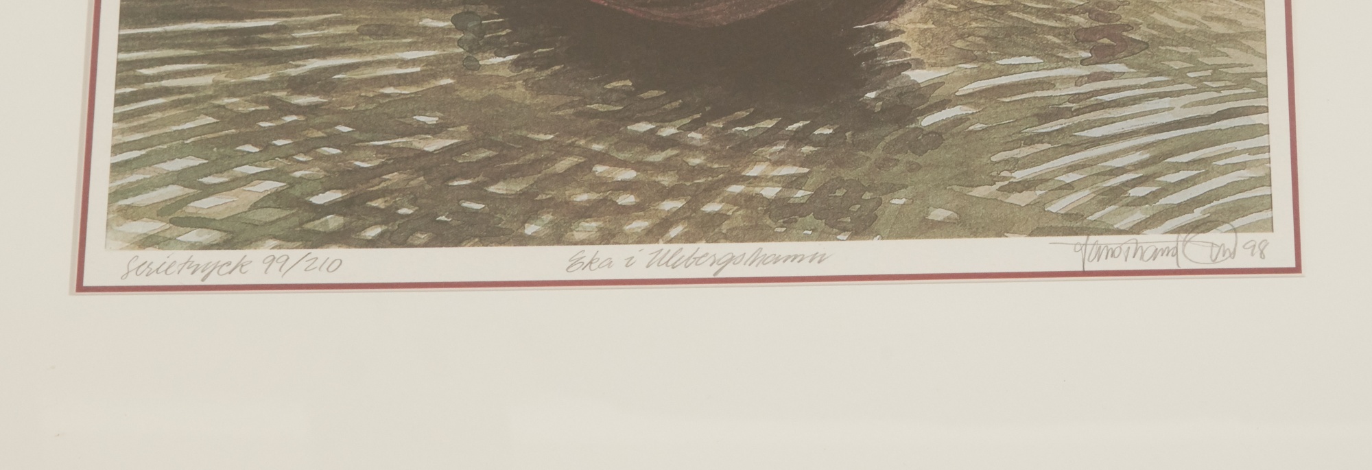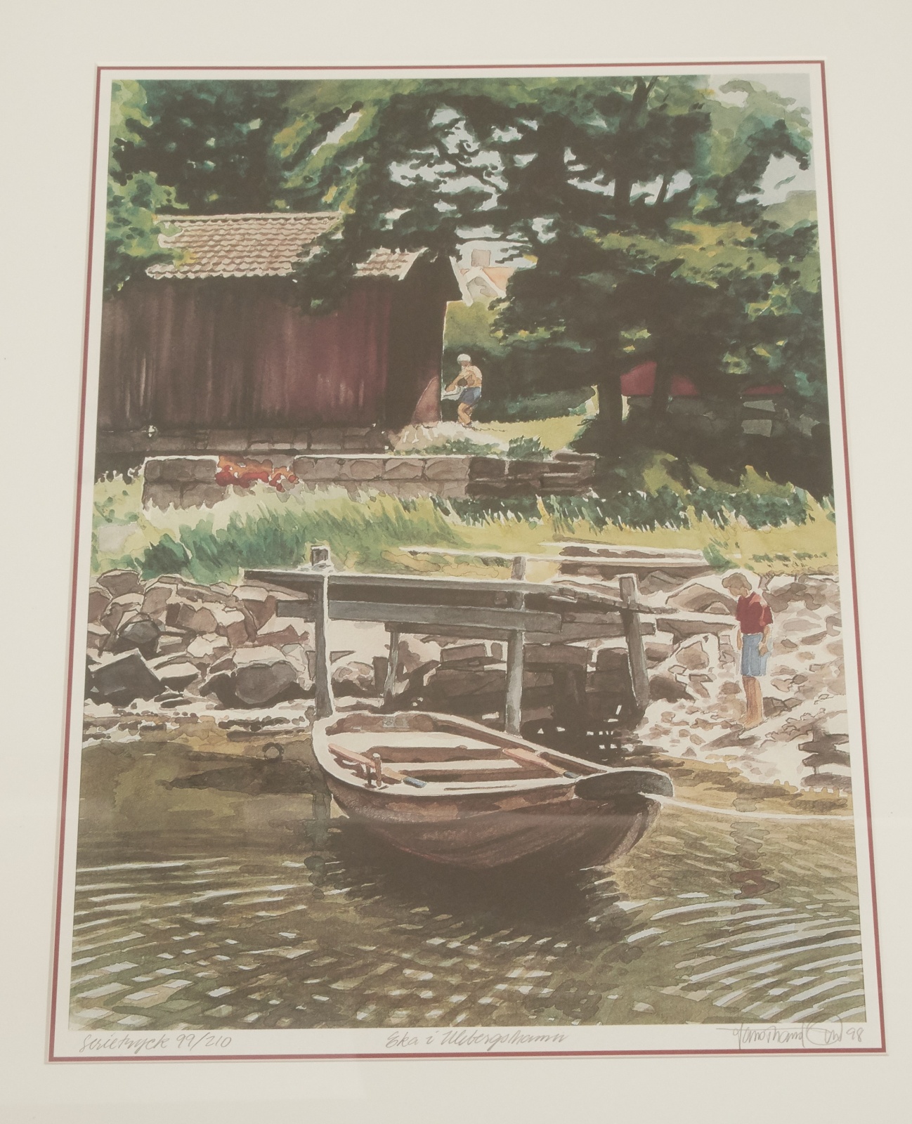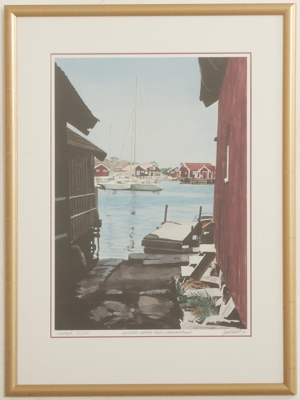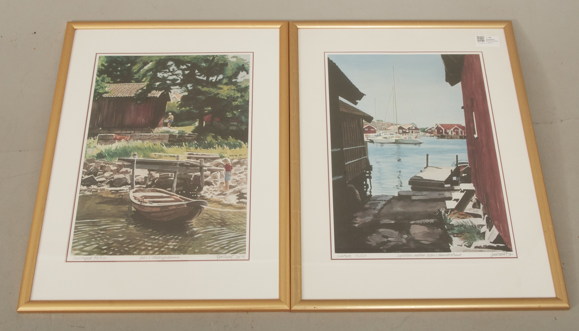 2 st bildmått 37 x 52 cm. "Segelbåtar mellan bodar i Hunnebostrand" signerad samt numrerad 121/210 samt "Eka i Ulebergshamn" signerad och numrerad 99/210 cm