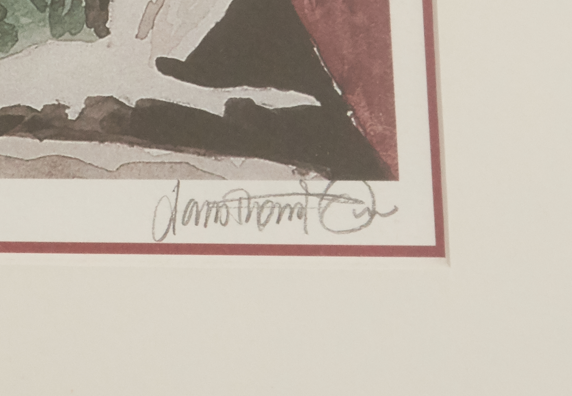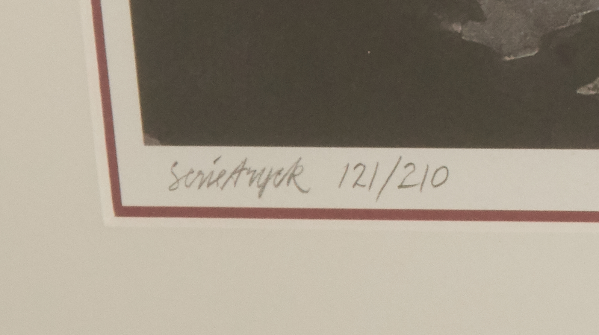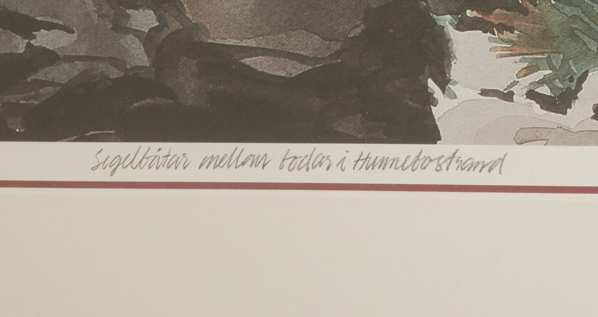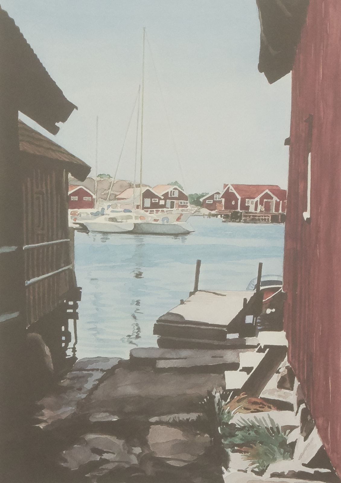 2 st bildmått 37 x 52 cm. "Segelbåtar mellan bodar i Hunnebostrand" signerad samt numrerad 121/210 samt "Eka i Ulebergshamn" signerad och numrerad 99/210 cm