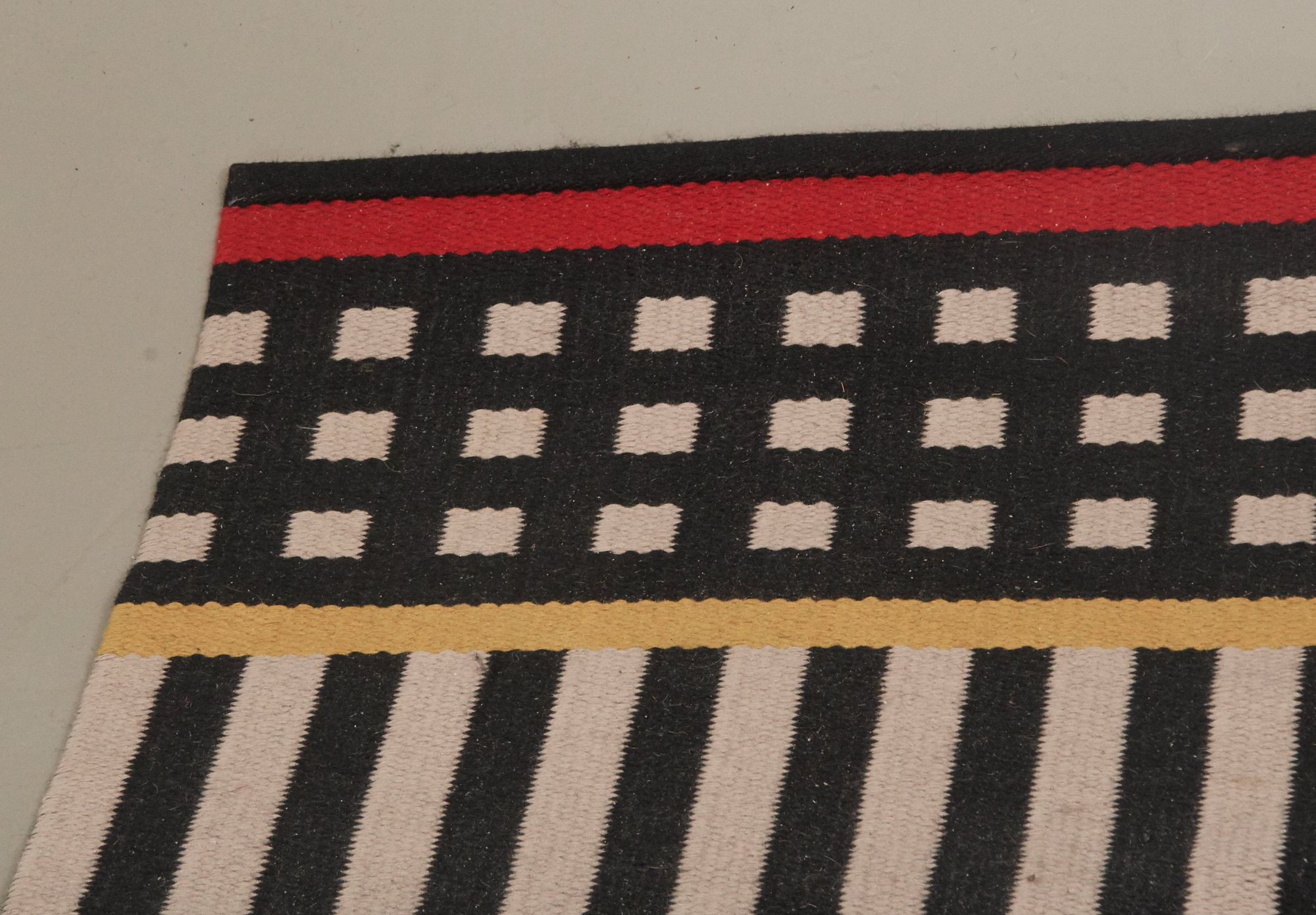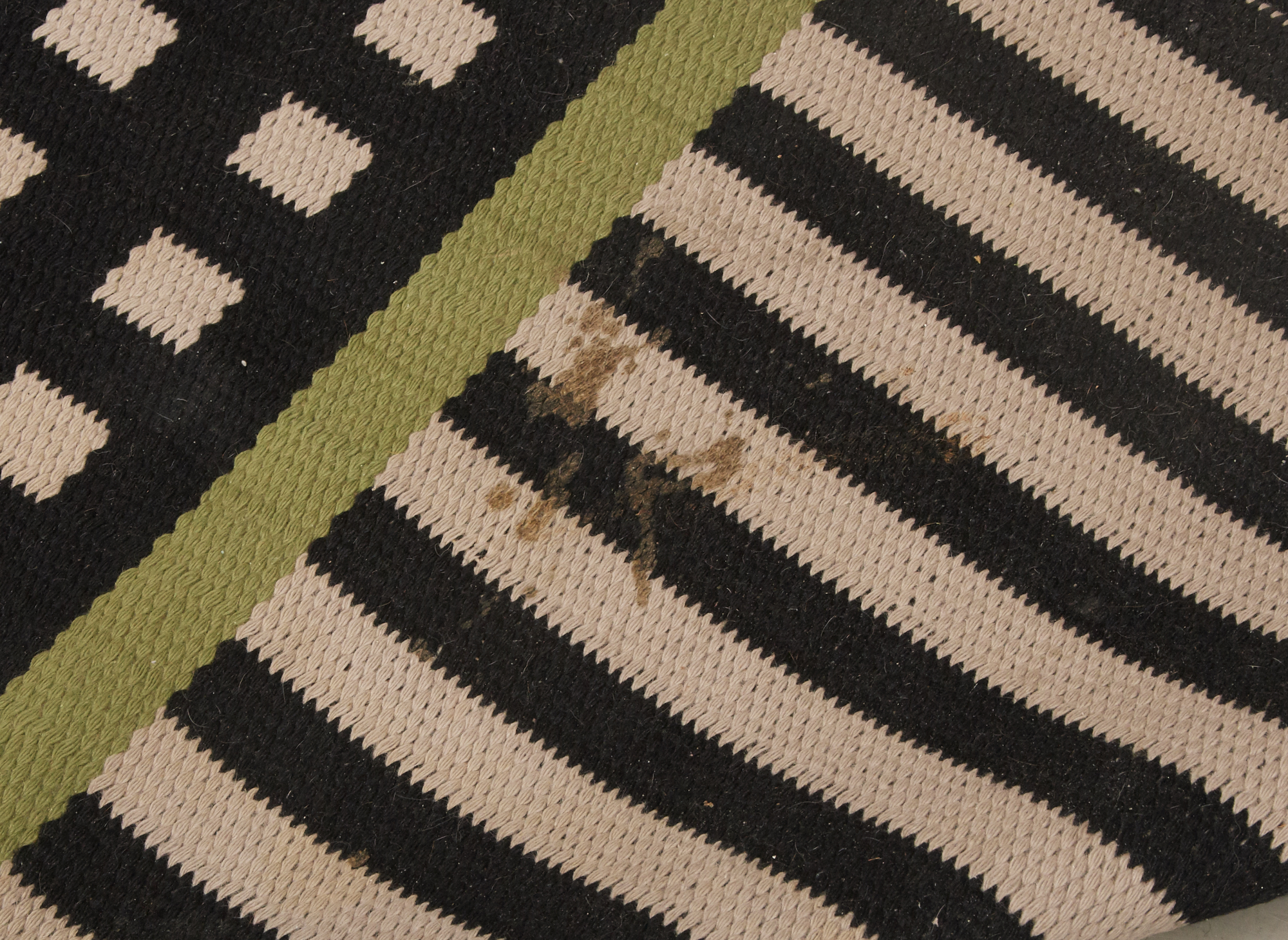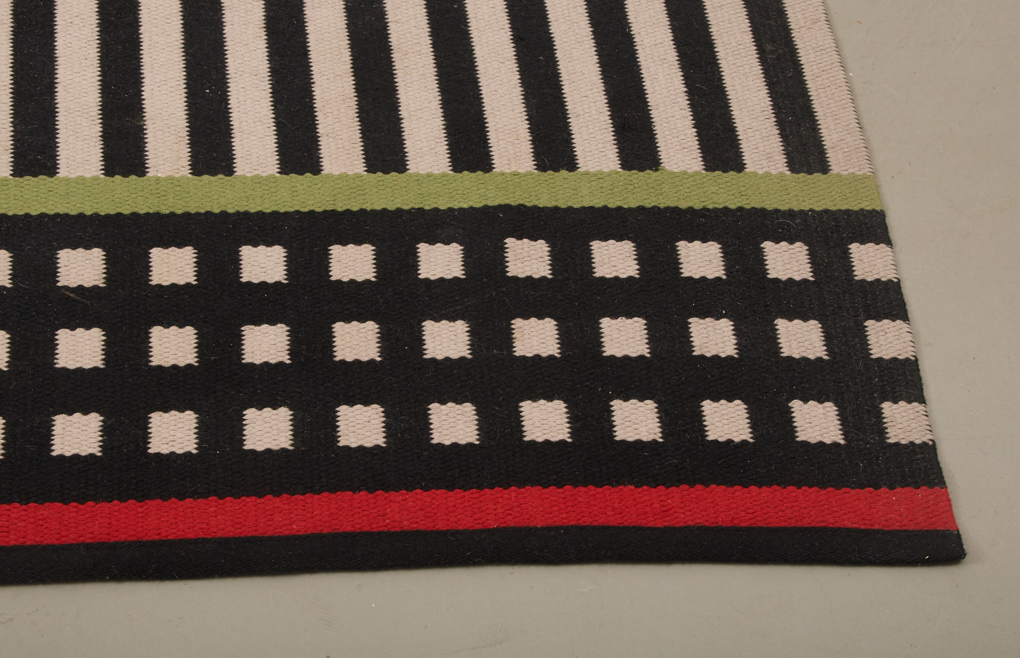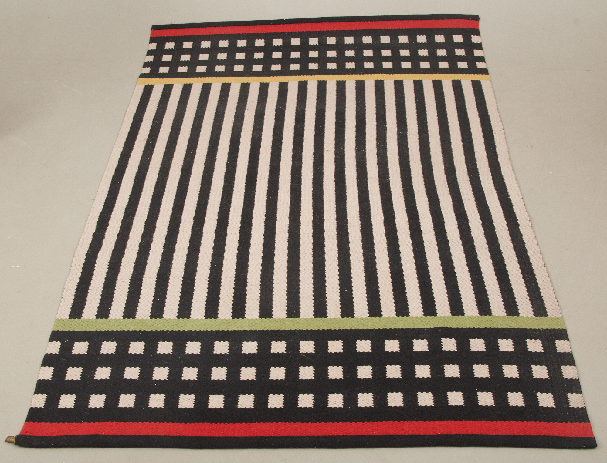 240 x 160 cm. Ränder i gult, rött och grönt, Etikettmärkt, bruksslitage, fläckar