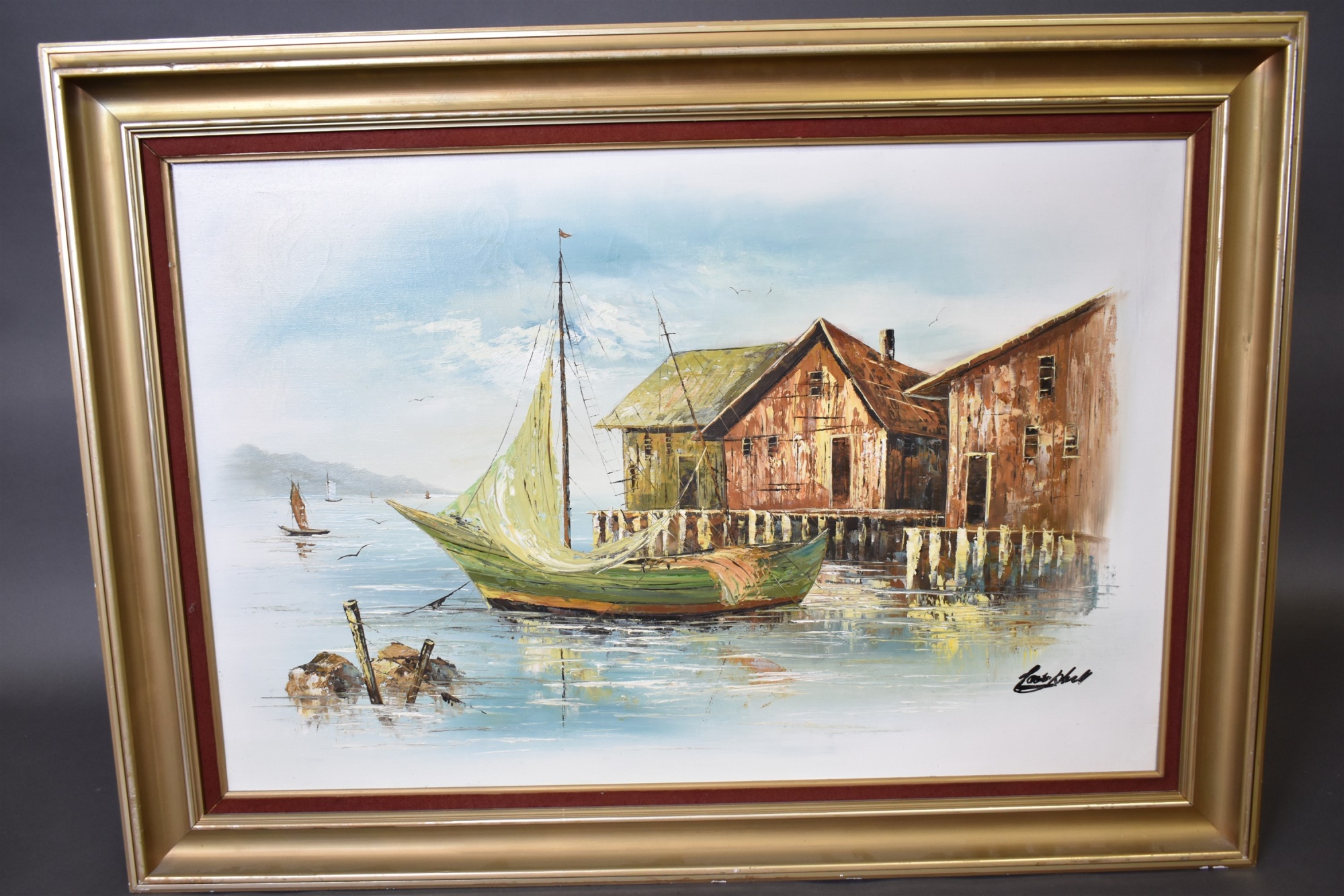 Bilder Olja pÄ duk, signerad Campbell, fiskelÀge, yttermÄtt 112x82 cm