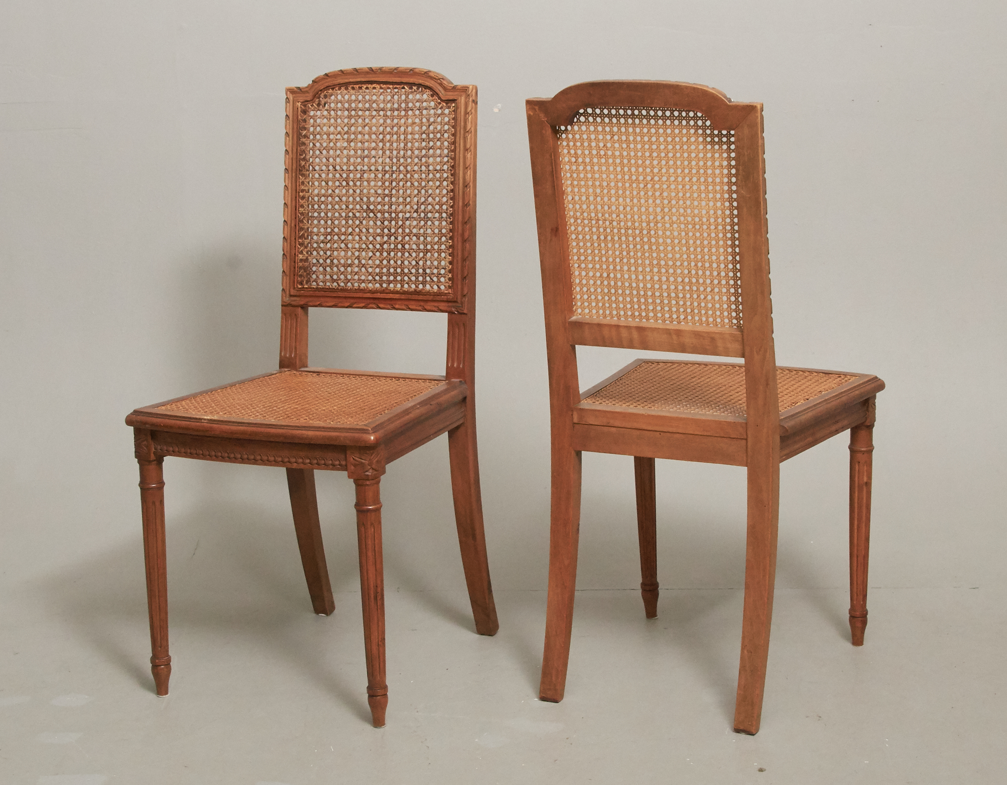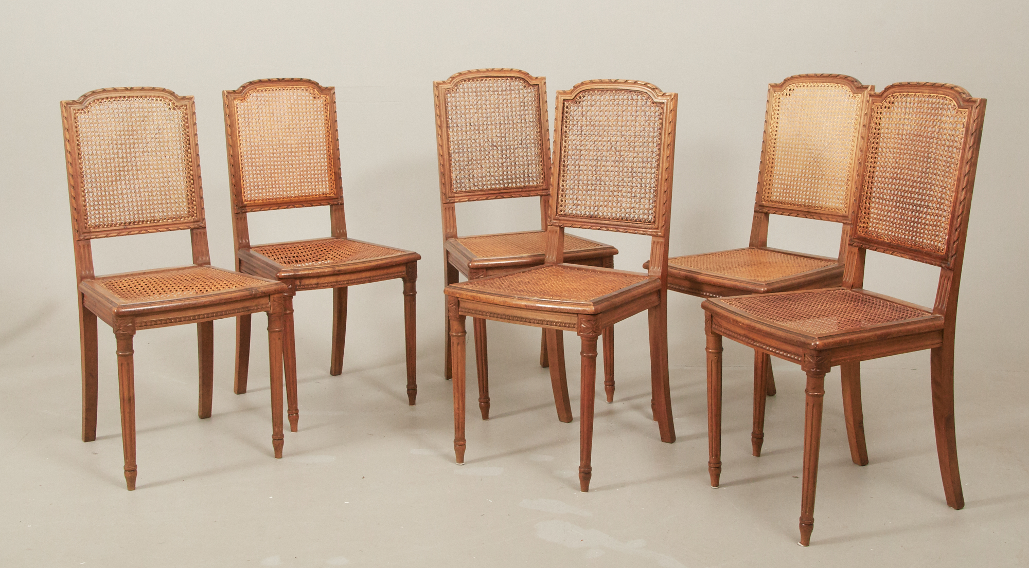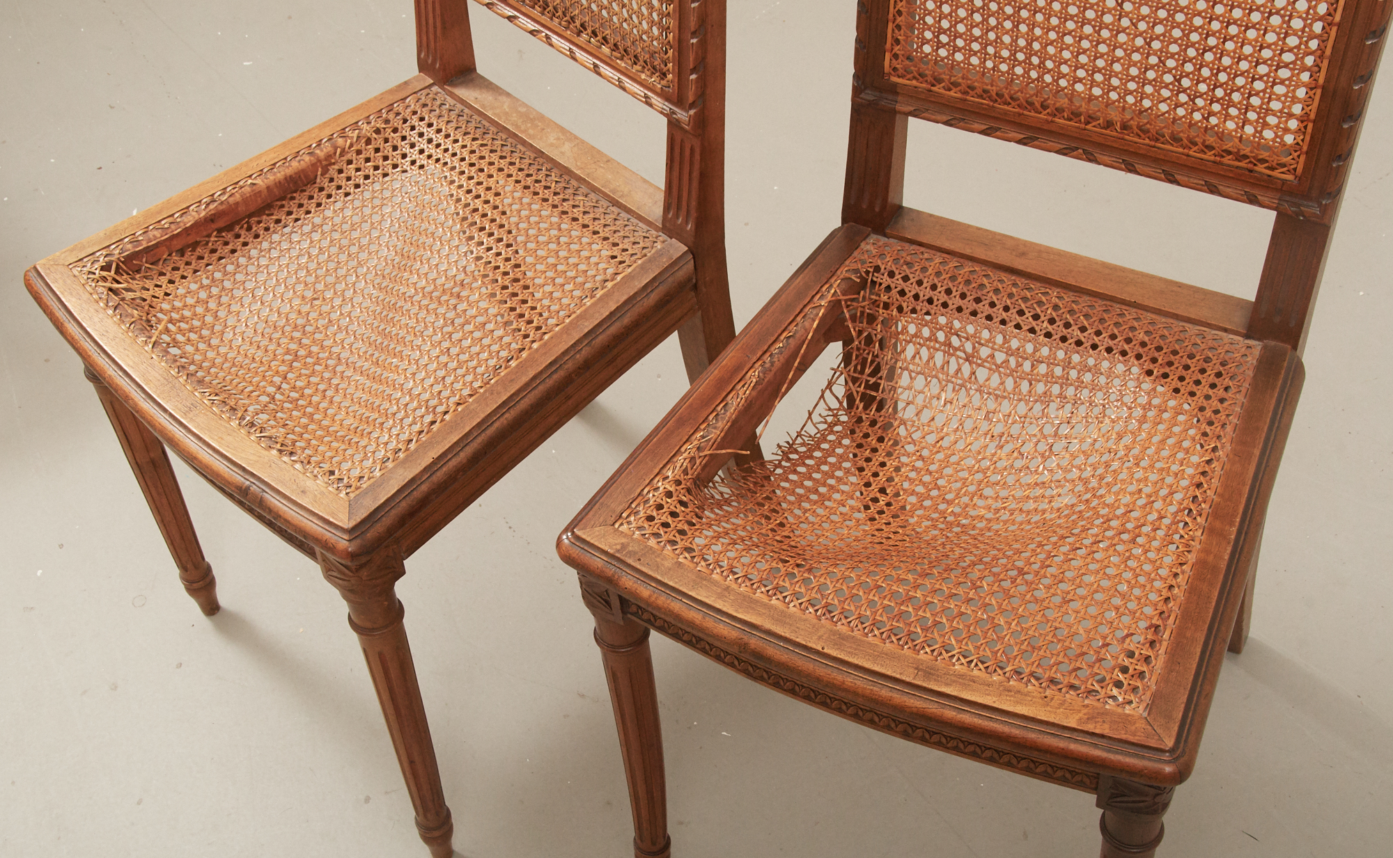 6 st, med sitsar, samt ryggar i rotting, bruksslitage, 2 st med skador på sitsar.
