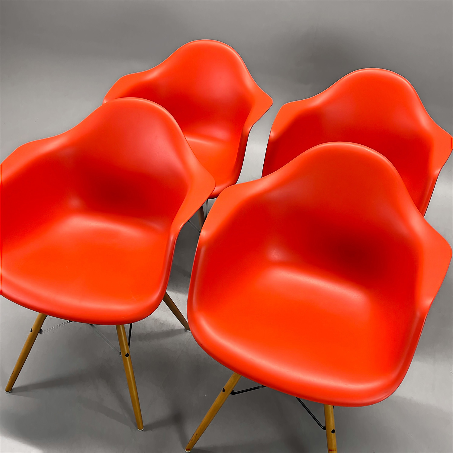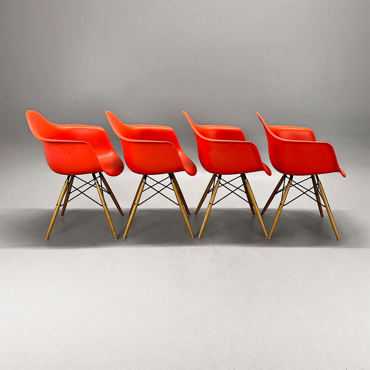 4 stycken stolar från Vitra. Modell Eames Plastic Armchair DAW stol. Rött skal i plast med en bas i trä.