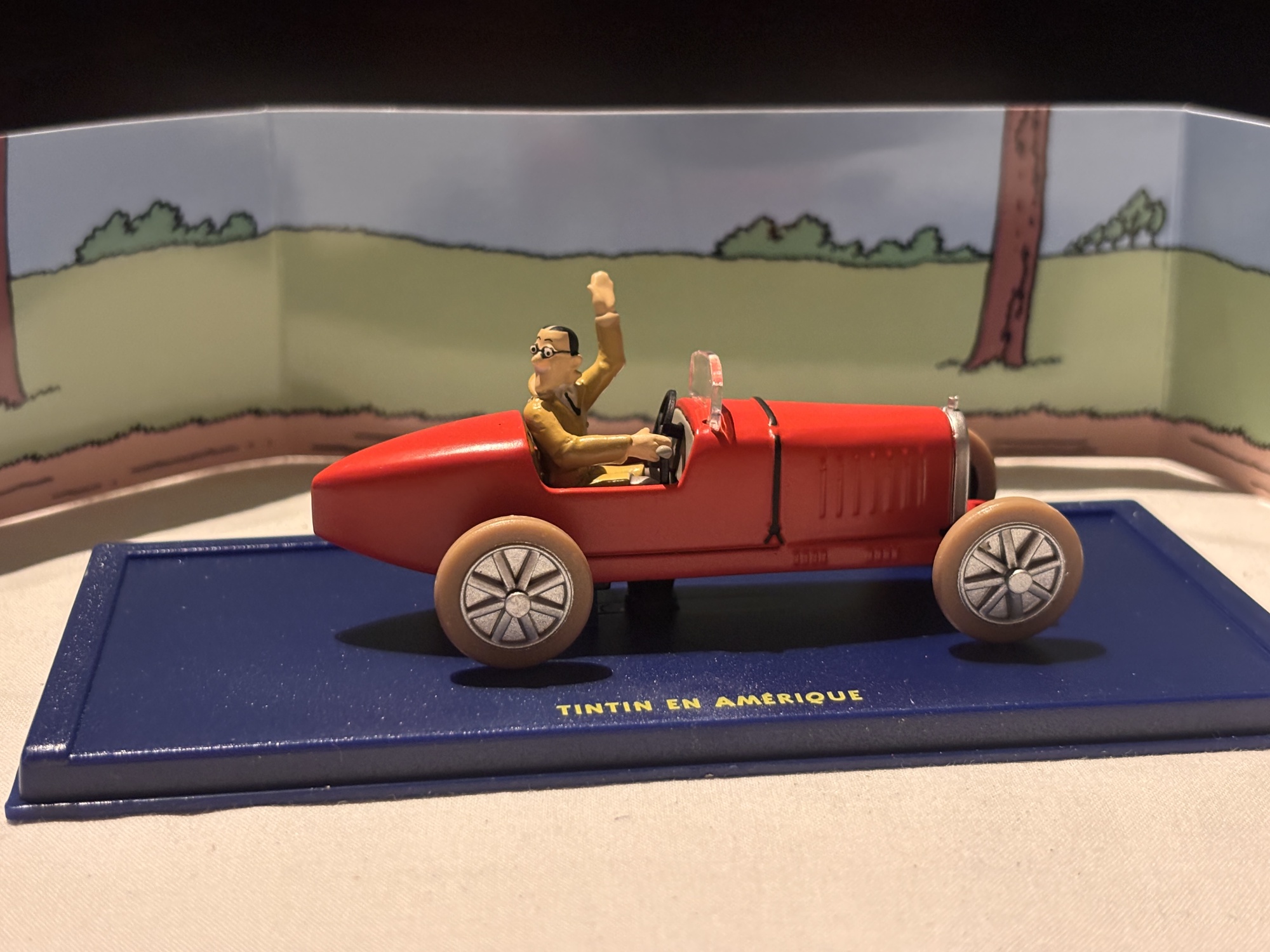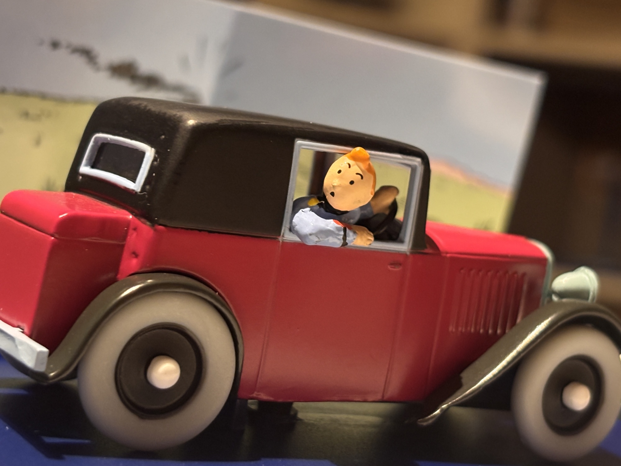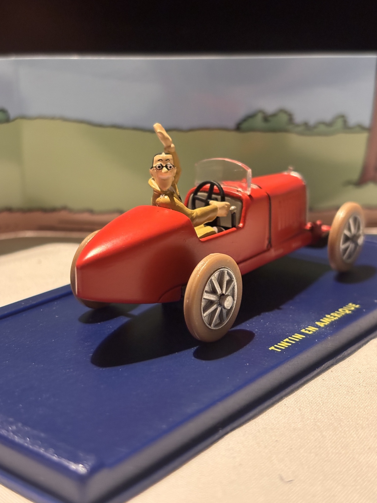 Röd sportbil (Tintin i Amerika) – En liten öppen sportbil med Dupontarna i framsätet, återskapad från den klassiska scenen i Tintin i Amerika. Bilen är baserad på tidiga 1930-talets racerbilar, med strömlinjeformad design och stora ekrade hjul. En fartfylld modell som sticker ut i samlingen.