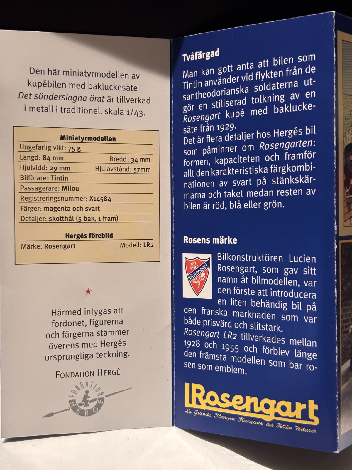 Rosengart LR2 (1929) – Från Det sönderslagna örat! En magenta- och svartfärgad kupébil med Tintin som förare och Milou som passagerare. Modellen har realistiska detaljer som skotthål i karossen. En ovanlig bil inspirerad av den franska Rosengart LR2.