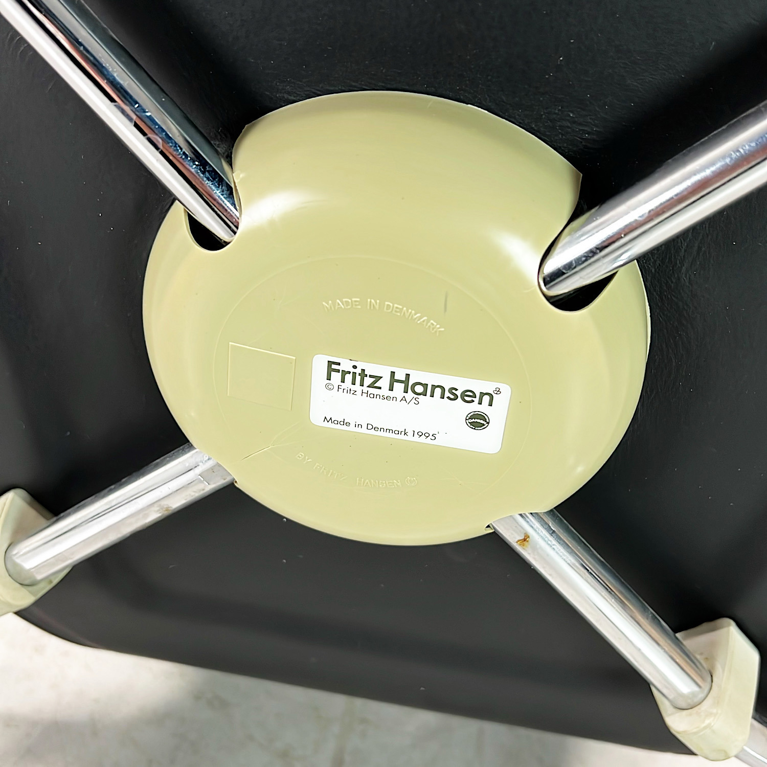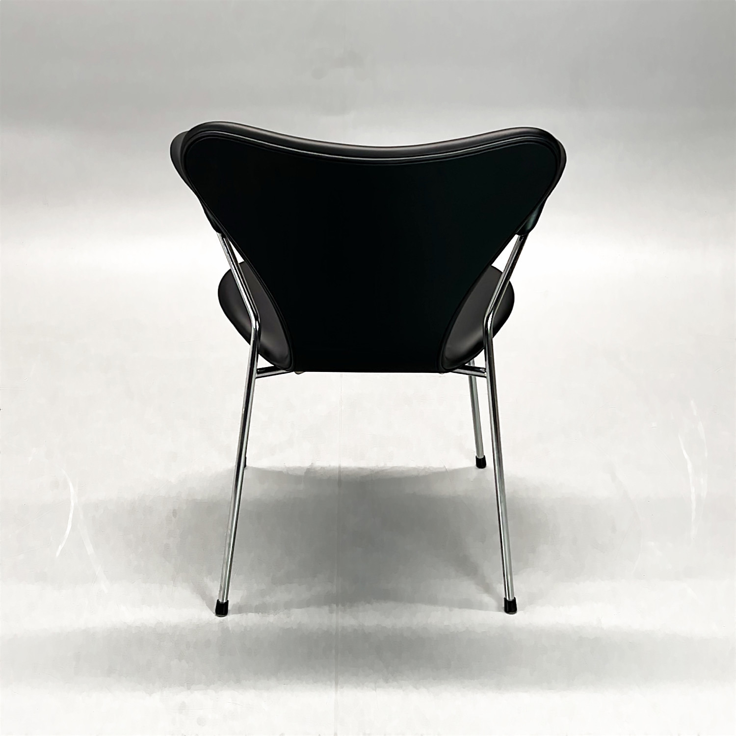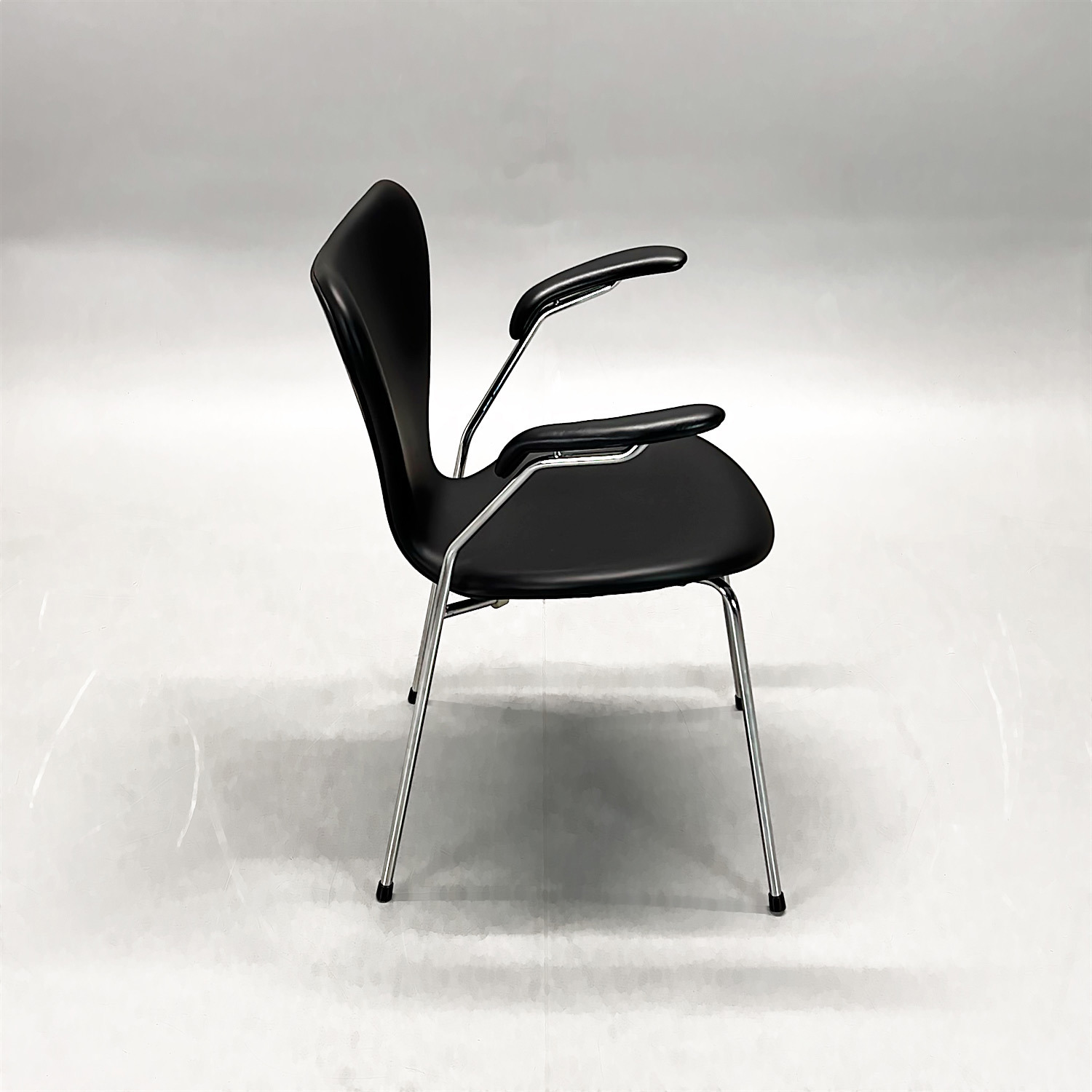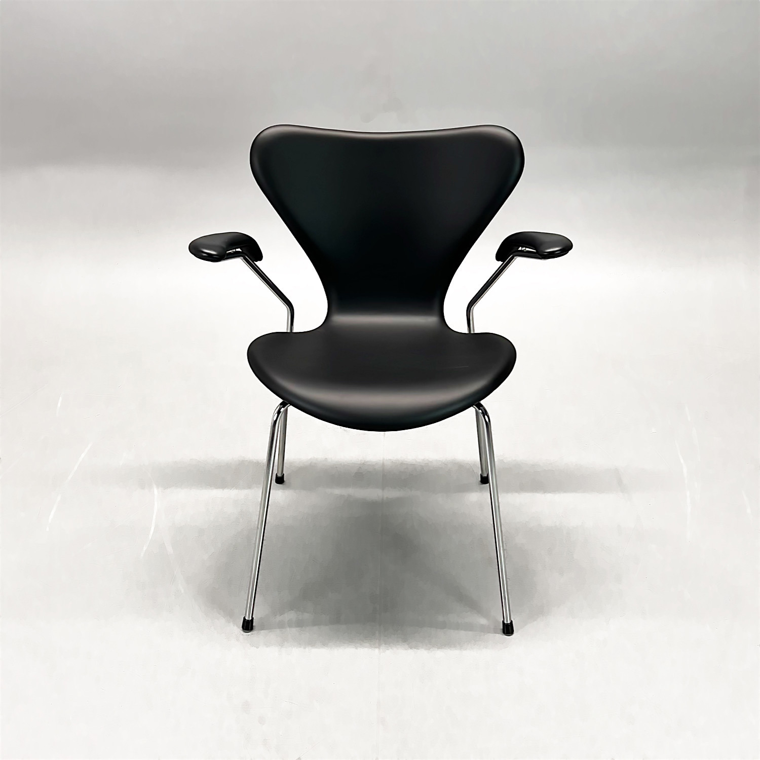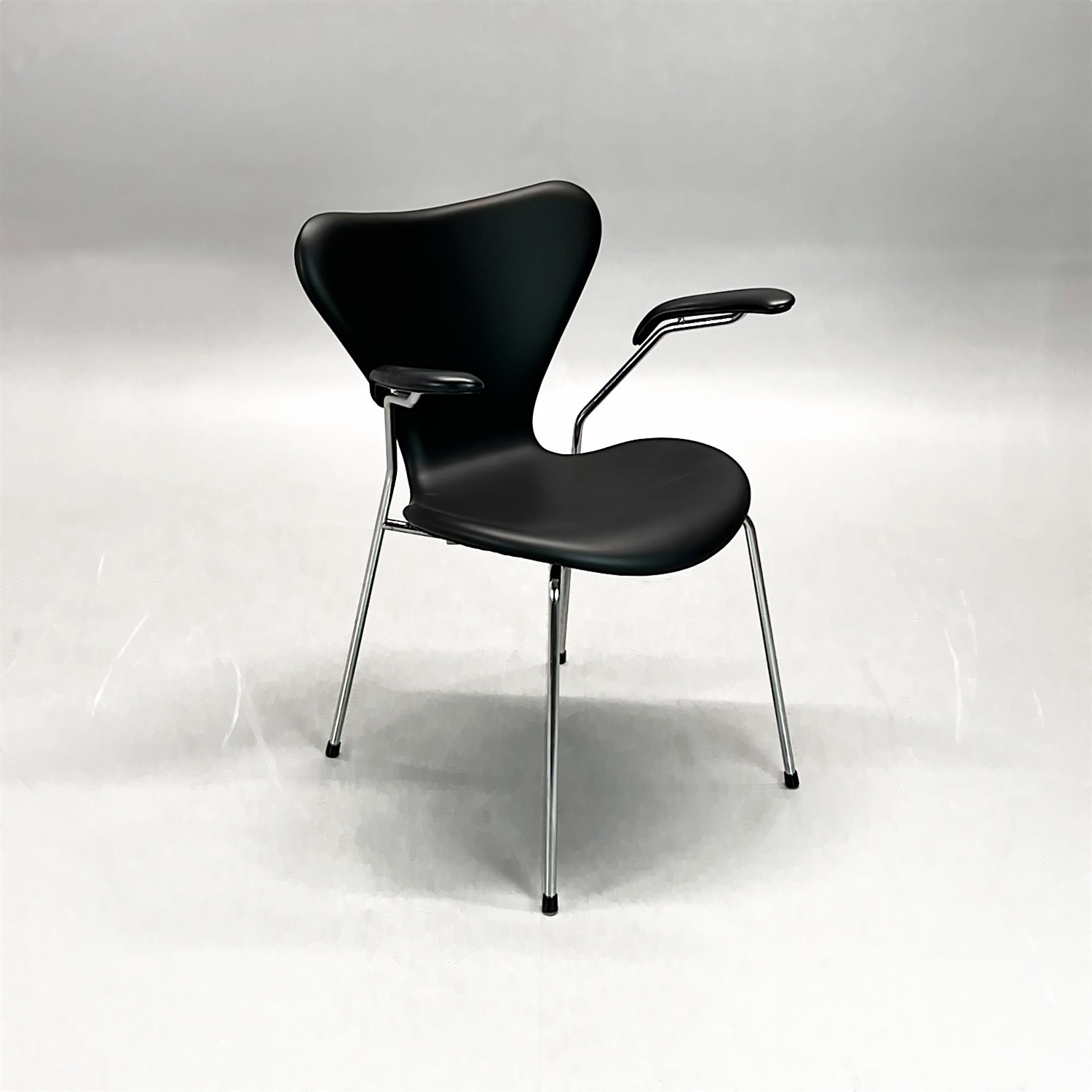 Sjuan karmstol, modell 3207 från Fritz Hansen. Formgivare Arne Jakobsen. Stålunderrede med kromade ben, nyrenoverade i svart läder, helklädd.