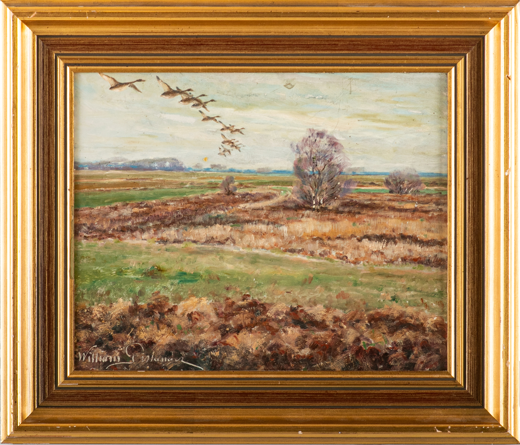 WILLIAM GISLANDER (1890-1937), olja på pannå, sträckande gäss, signerad.
