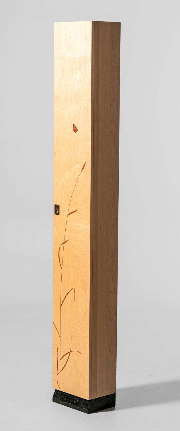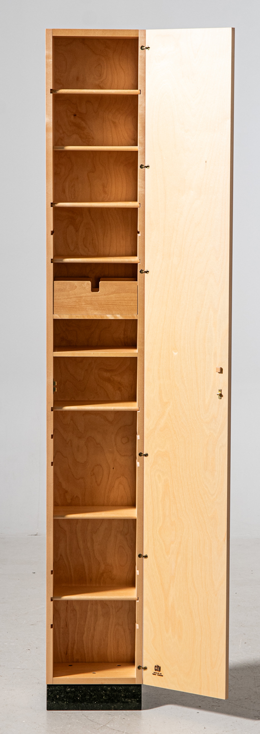 SKÅP TIBRO, stomme i björk med intarsiadekor, handtag i mässing, sockel i sten, brännmärkt, 1900-talets slut.