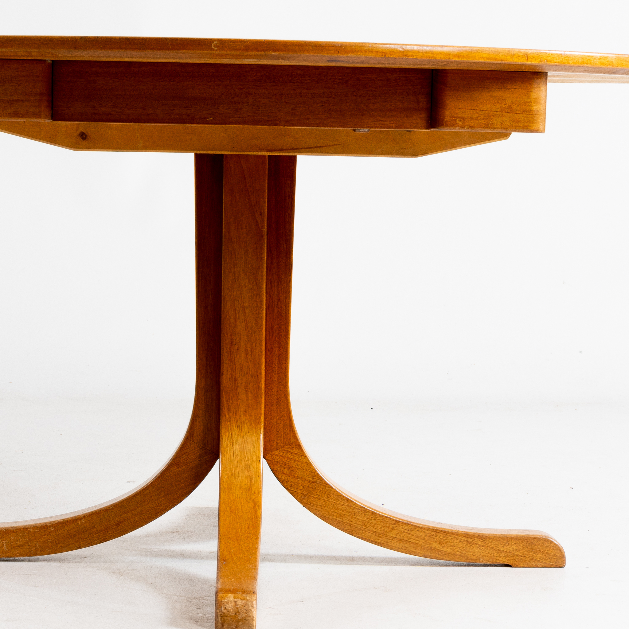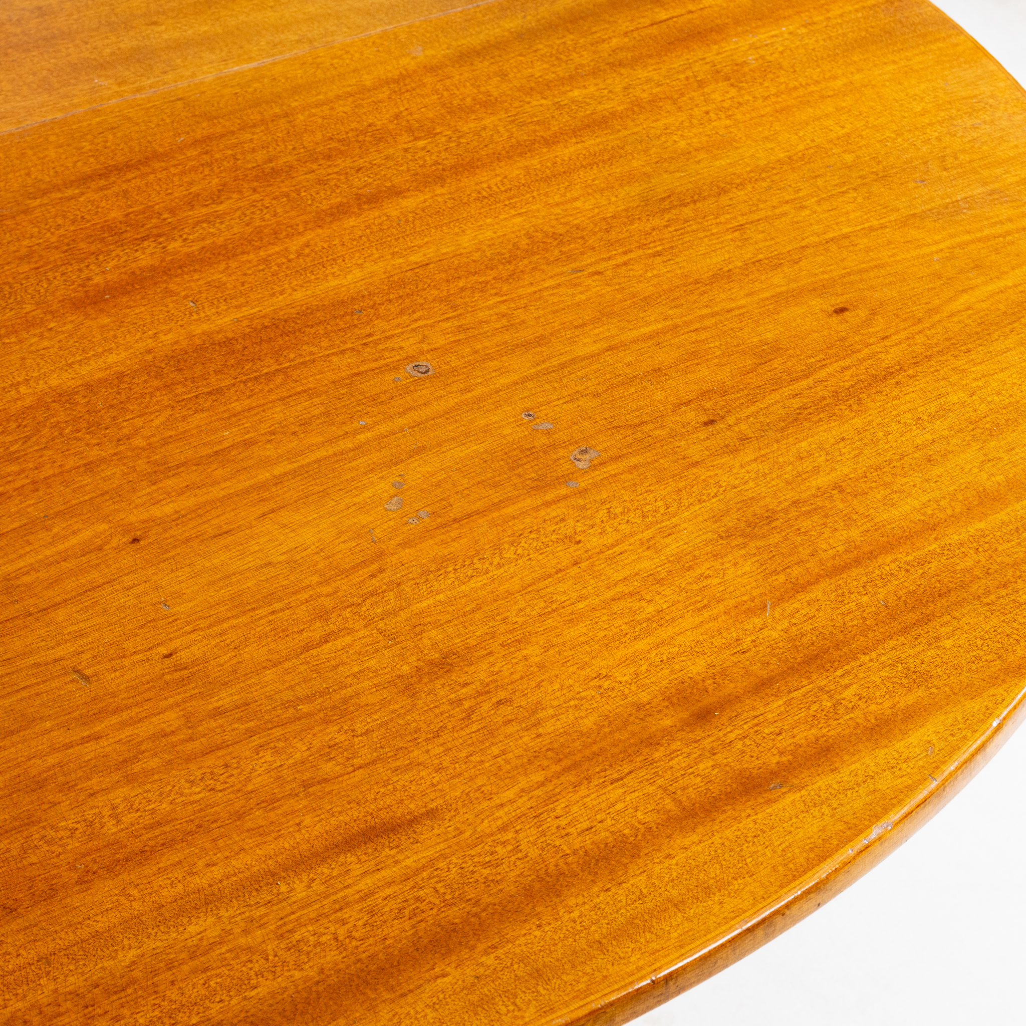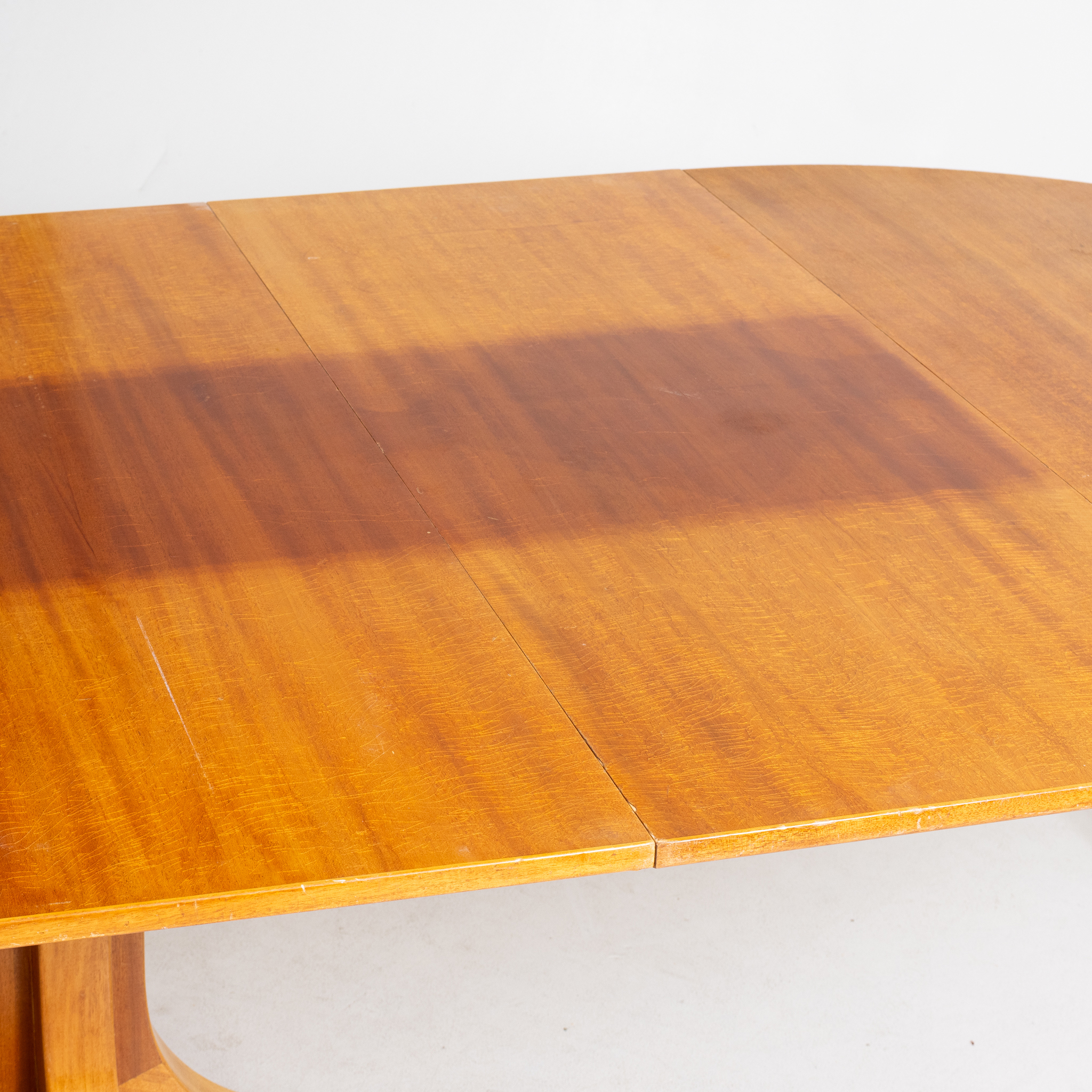 Modellnr 771?, fot av massiv mahogny, skivan fanerad med mahogny, tre iläggsskivor á 50 cm vardera, utfällbara ben, bordets höjd ca 72,5 cm, bordets diameter 130, total längd 280 cm
