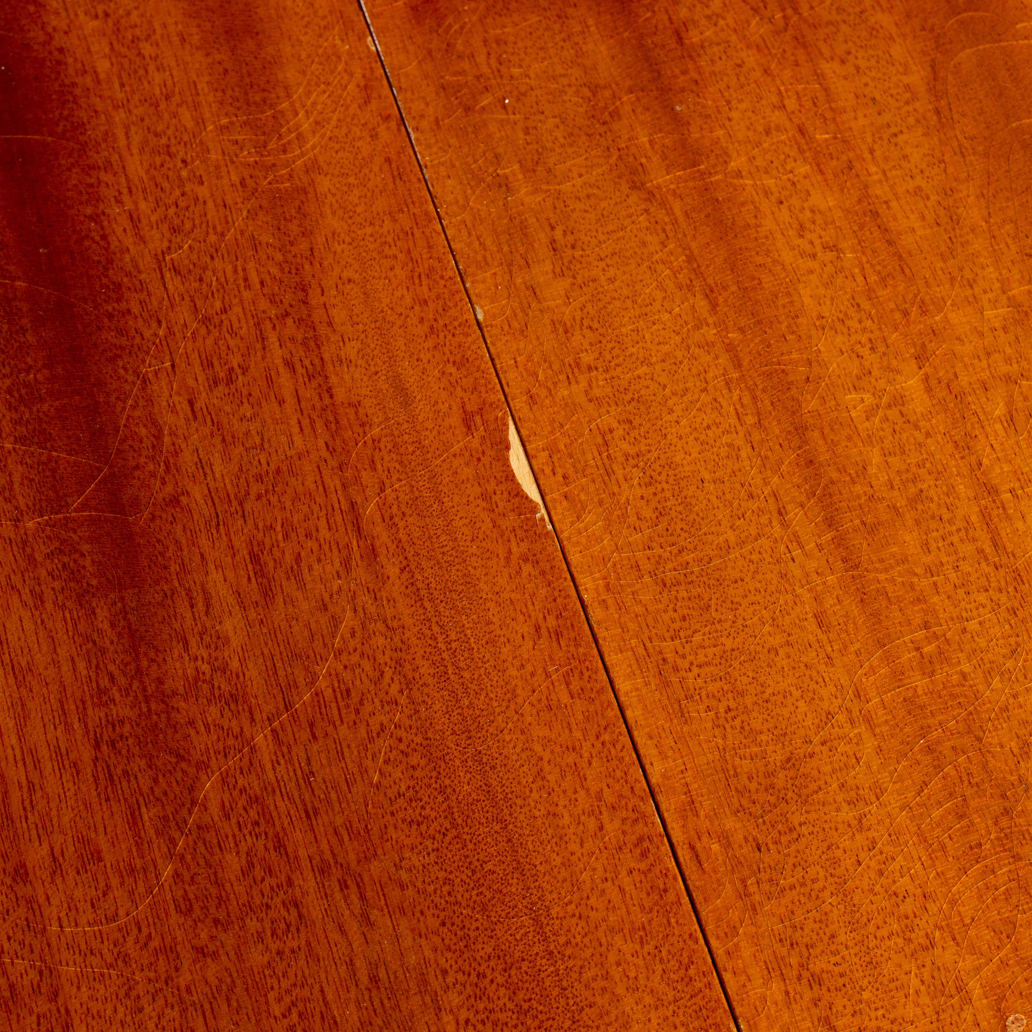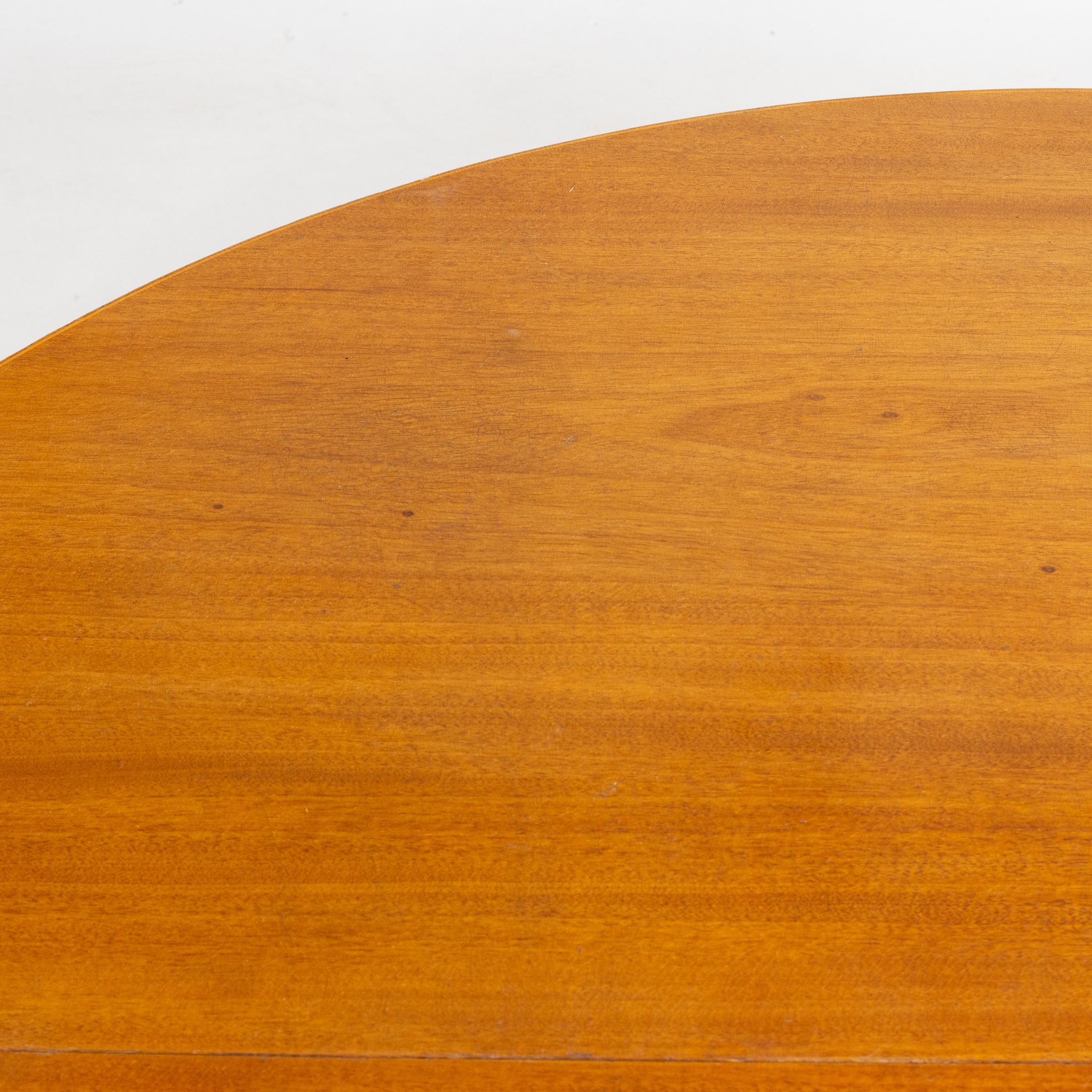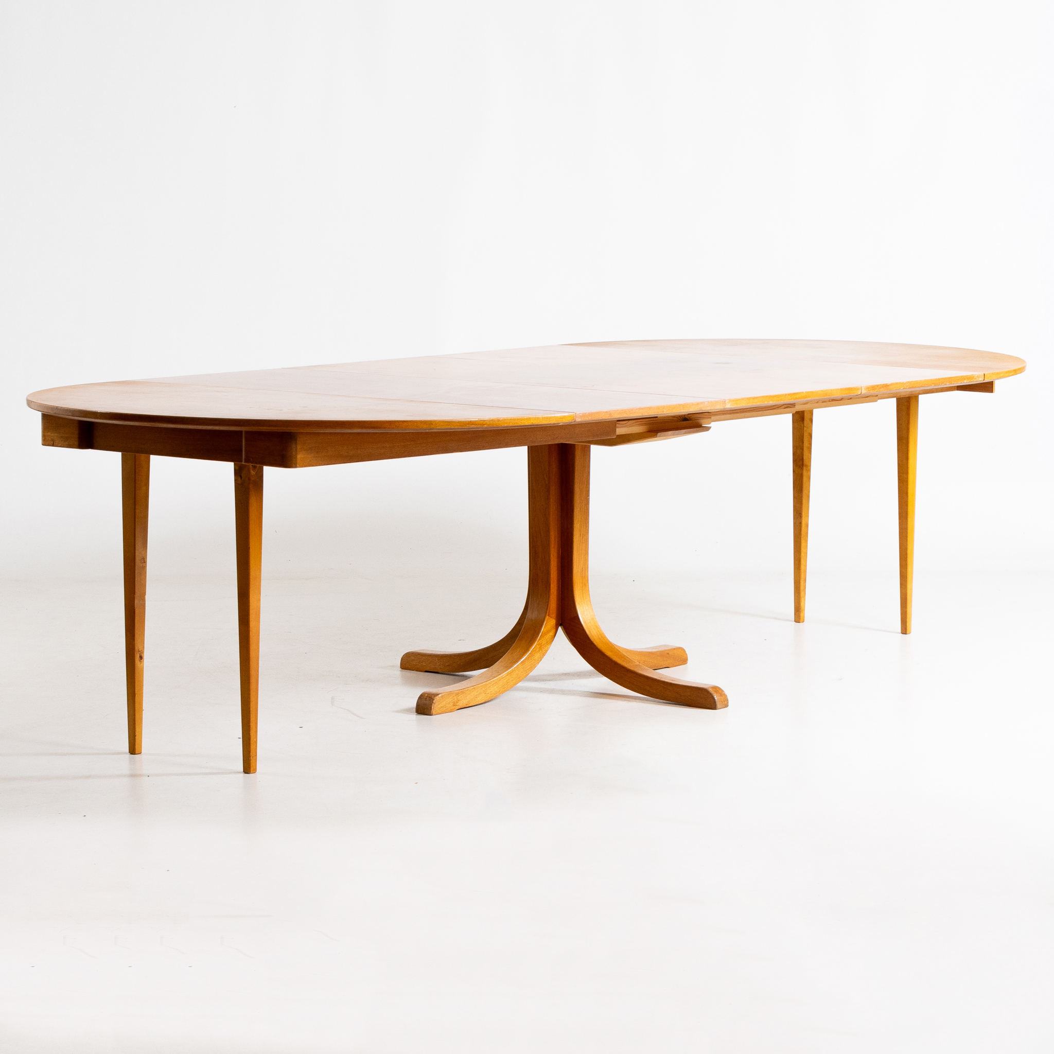 Modellnr 771?, fot av massiv mahogny, skivan fanerad med mahogny, tre iläggsskivor á 50 cm vardera, utfällbara ben, bordets höjd ca 72,5 cm, bordets diameter 130, total längd 280 cm