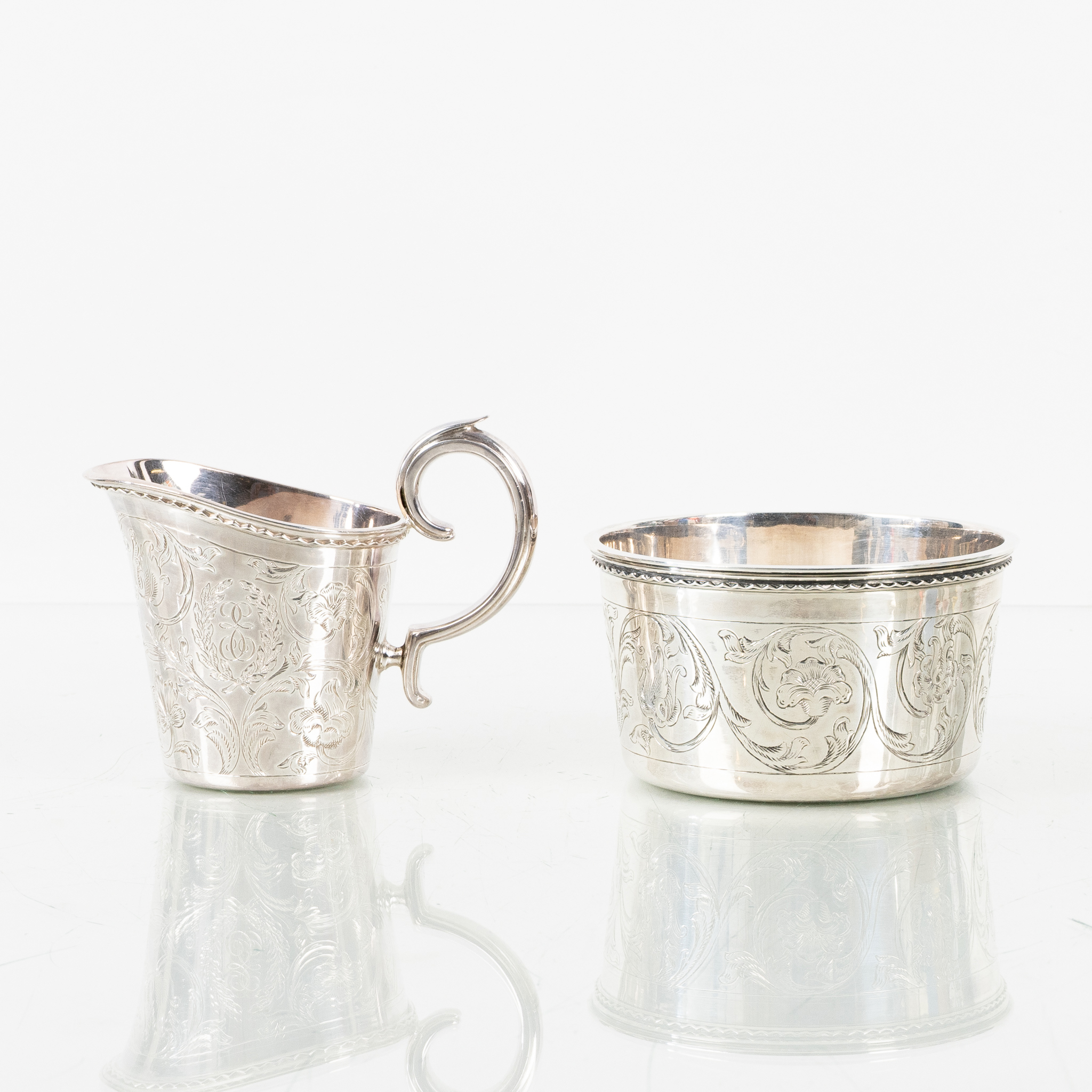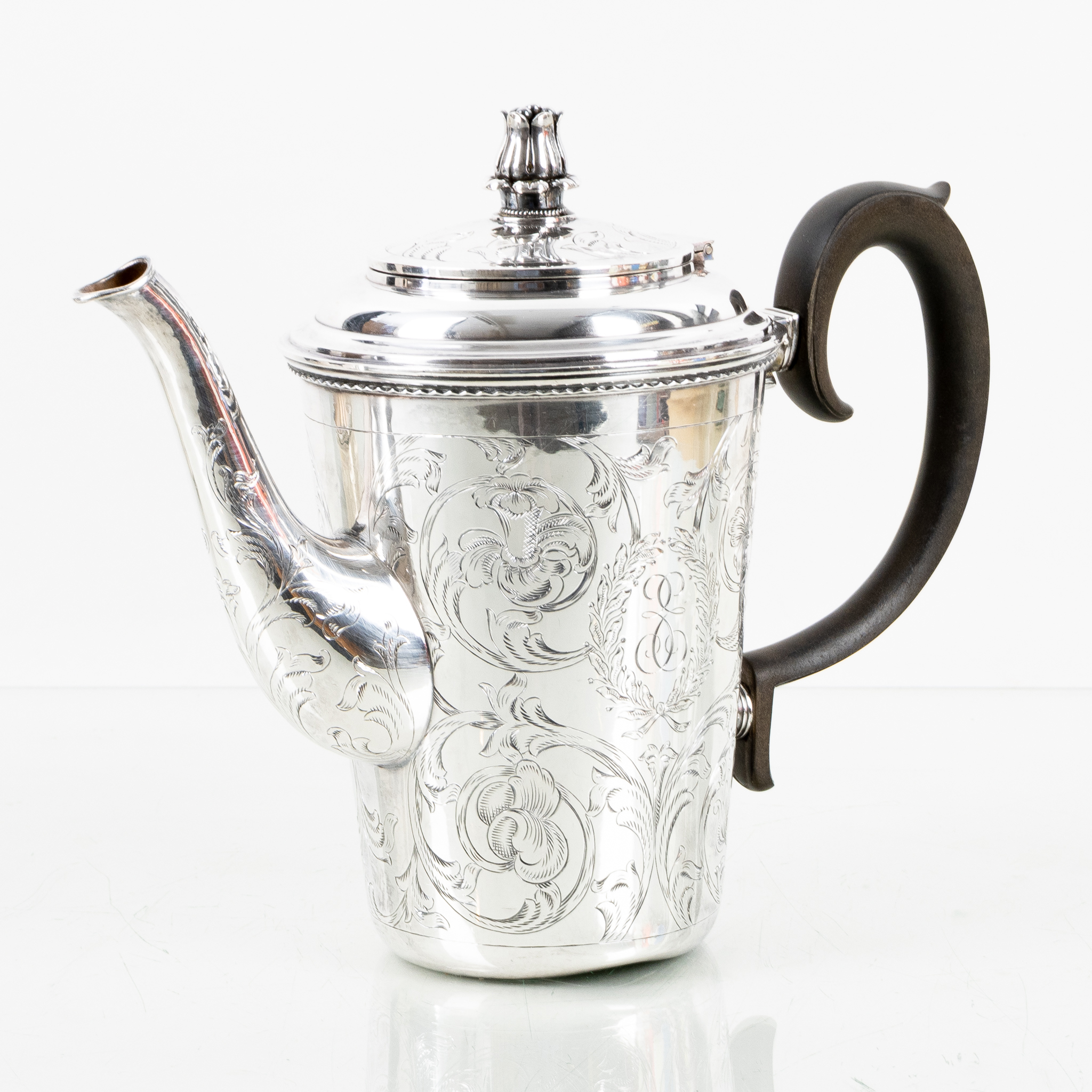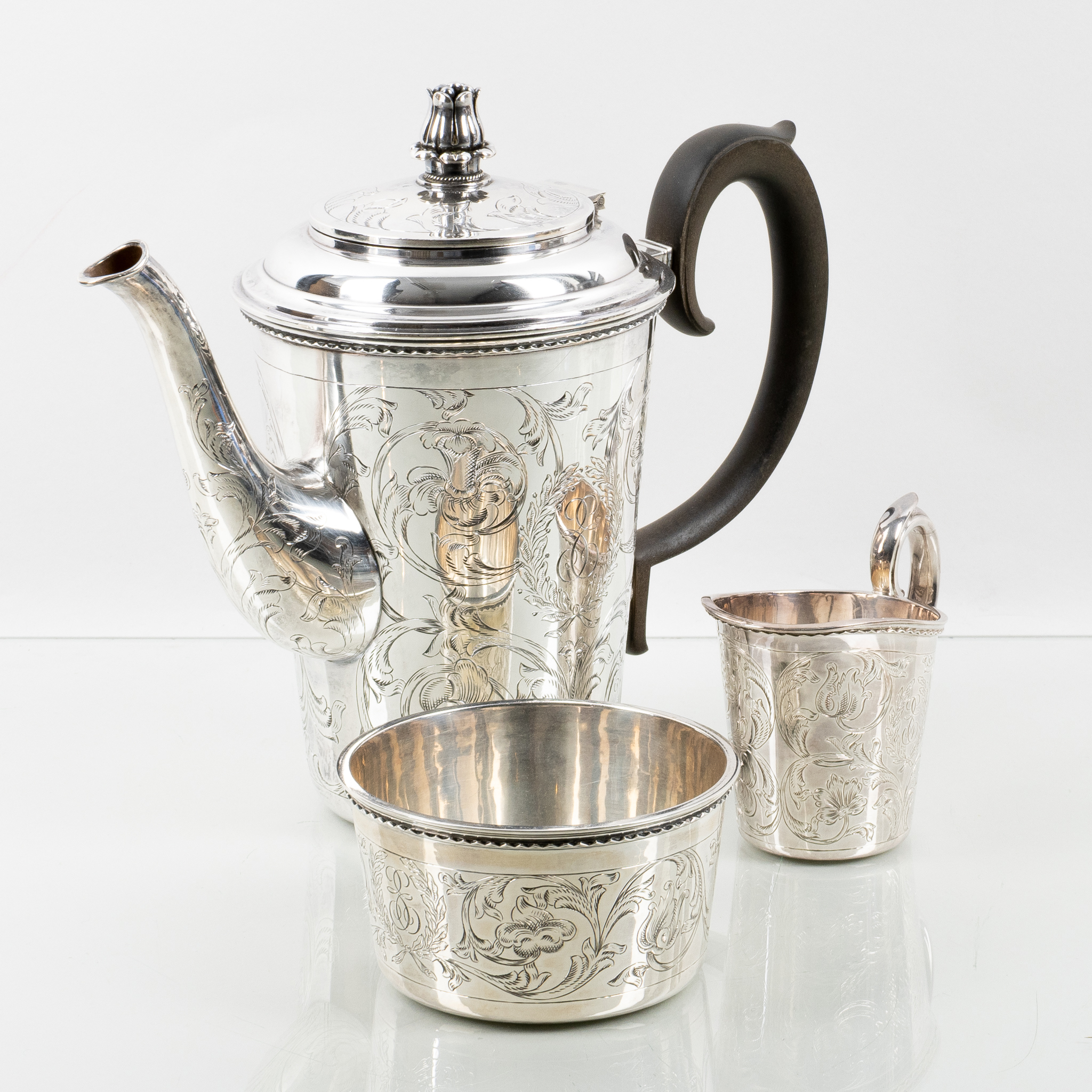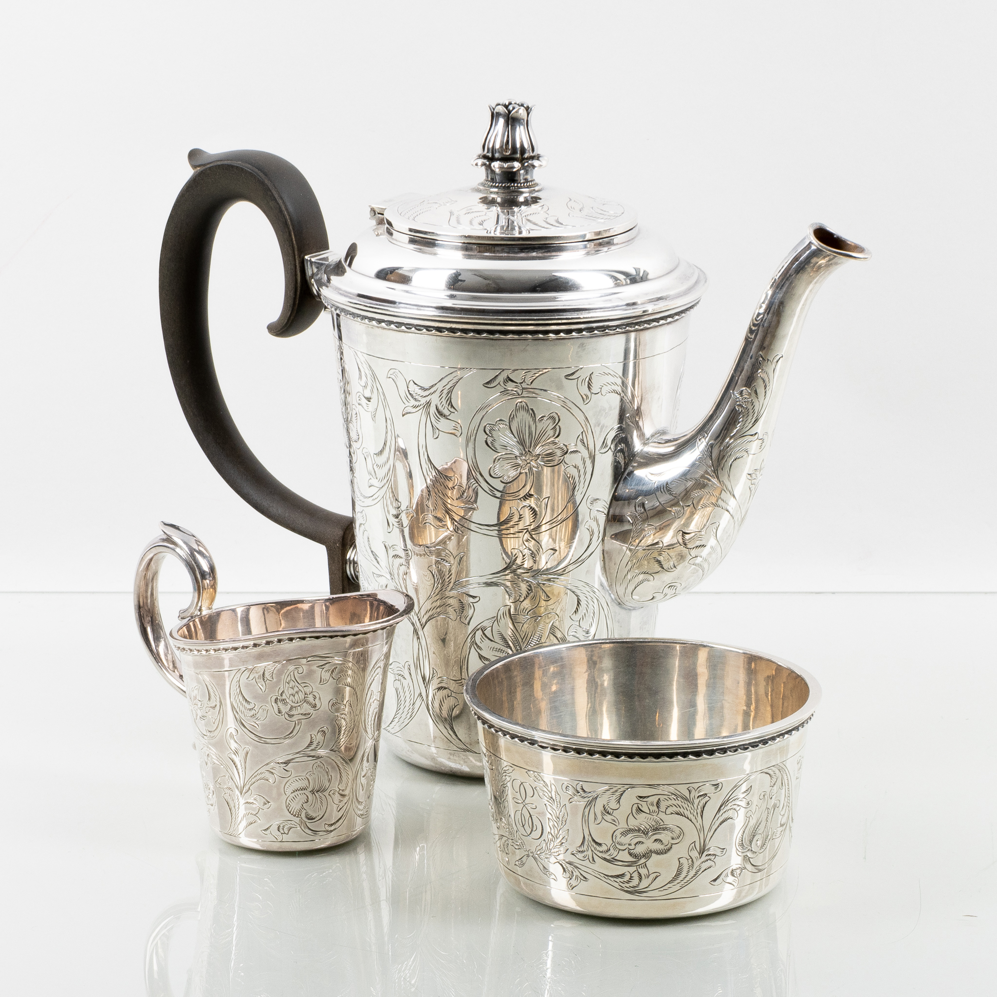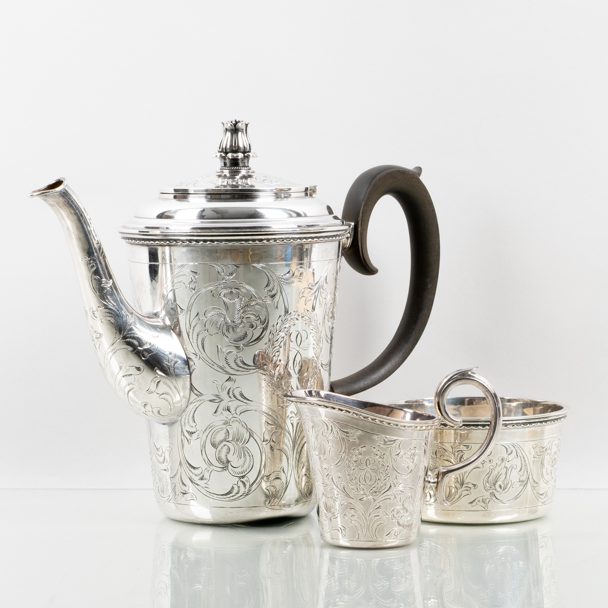 Dekor av blommor och bladverk, handtag i svärtat trä, omfattande kaffekanna, sockerskål och gräddkanna, kaffekannans höjd ca 21 cm, tot vikt ca 1 110 g