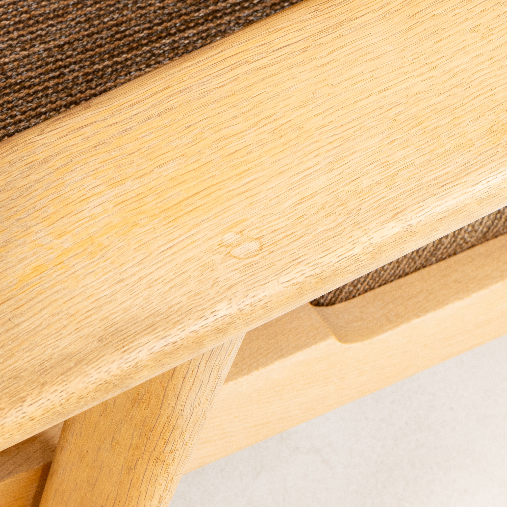 Stomme av ek, lös stoppad rygg och sits, klädsel av brun textil, brännmärkta, sitthöjd 40, tot höjd 69, djup 85 cm