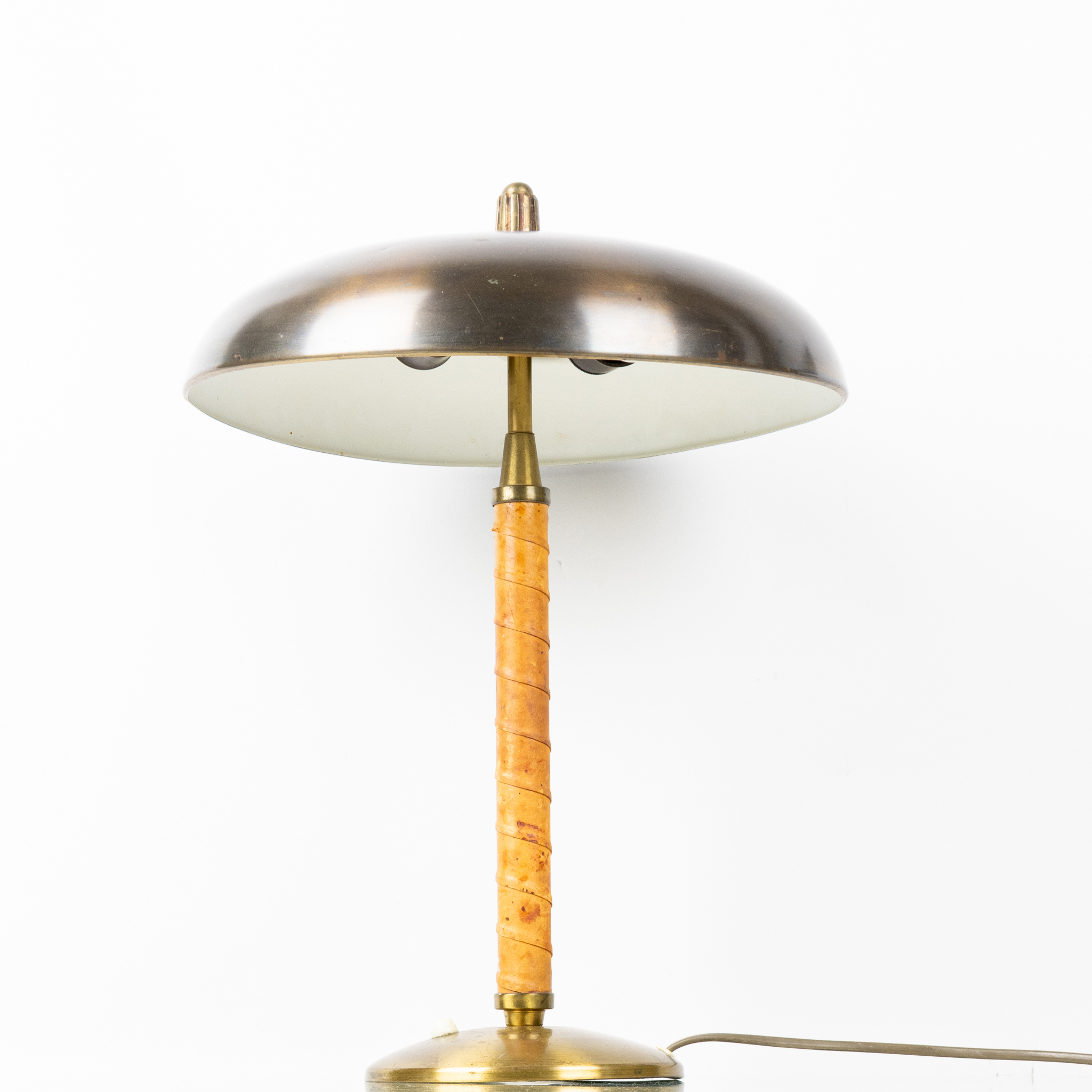 Skärm och fot av mässing, läderlindat skaft, höjd 52 cm