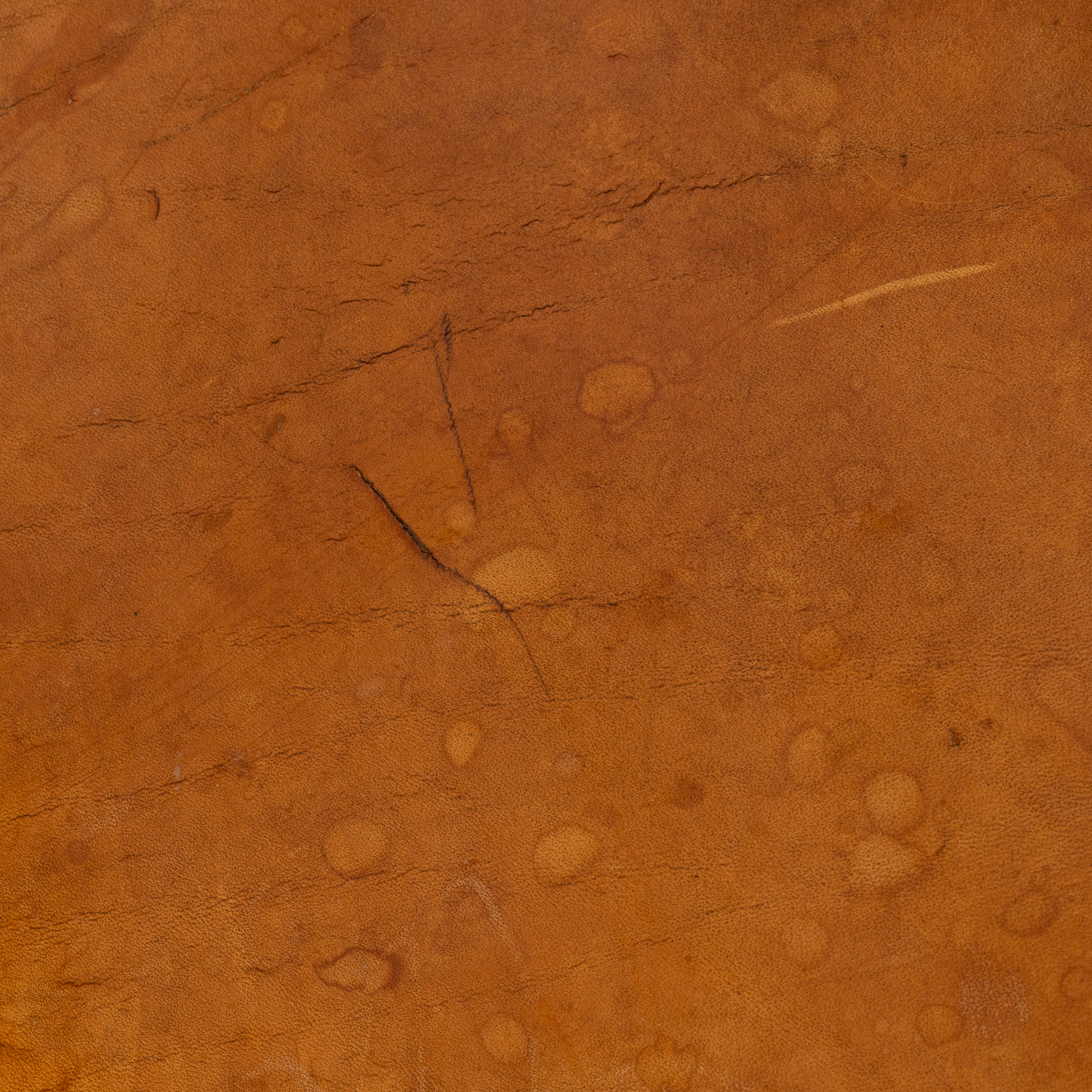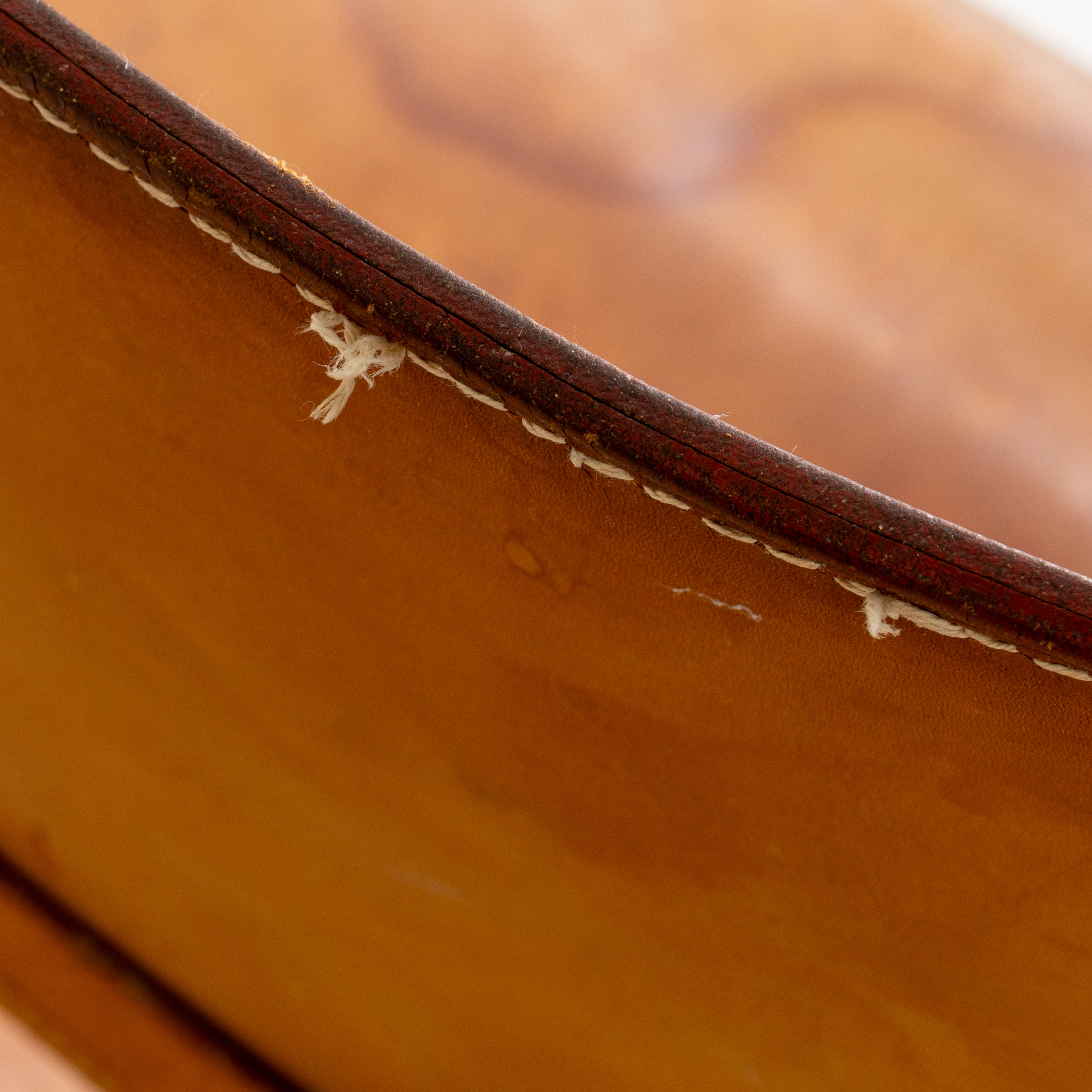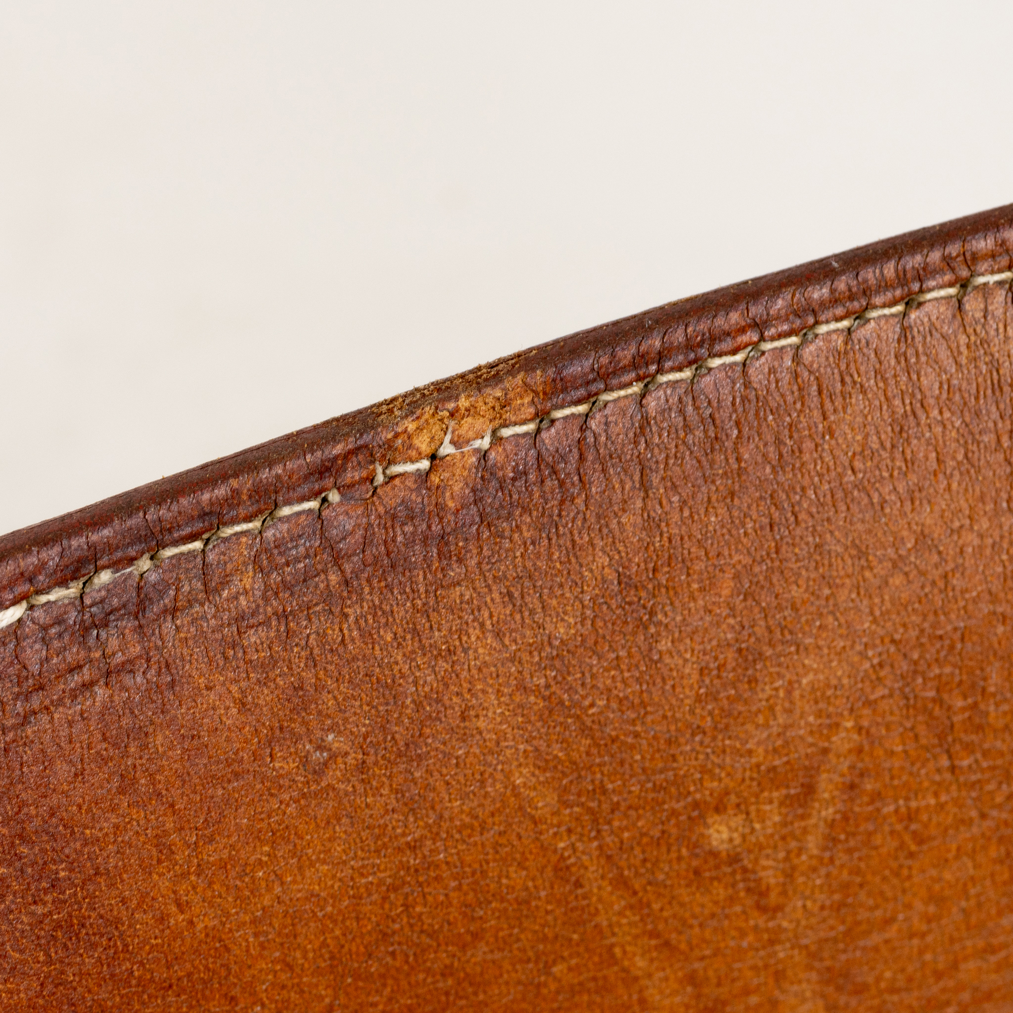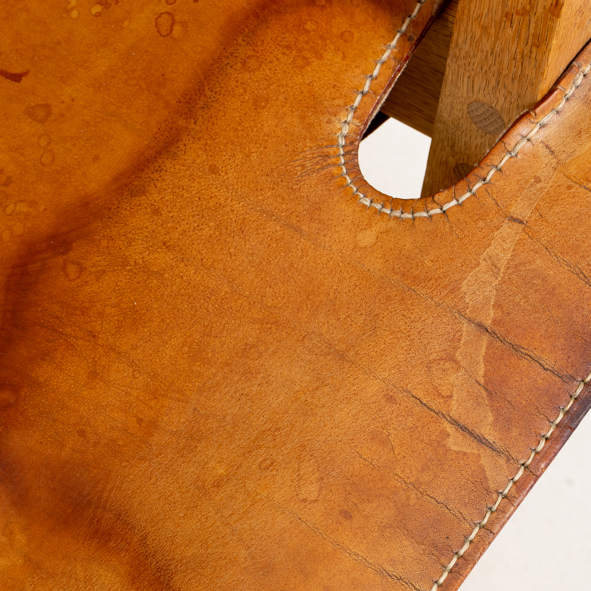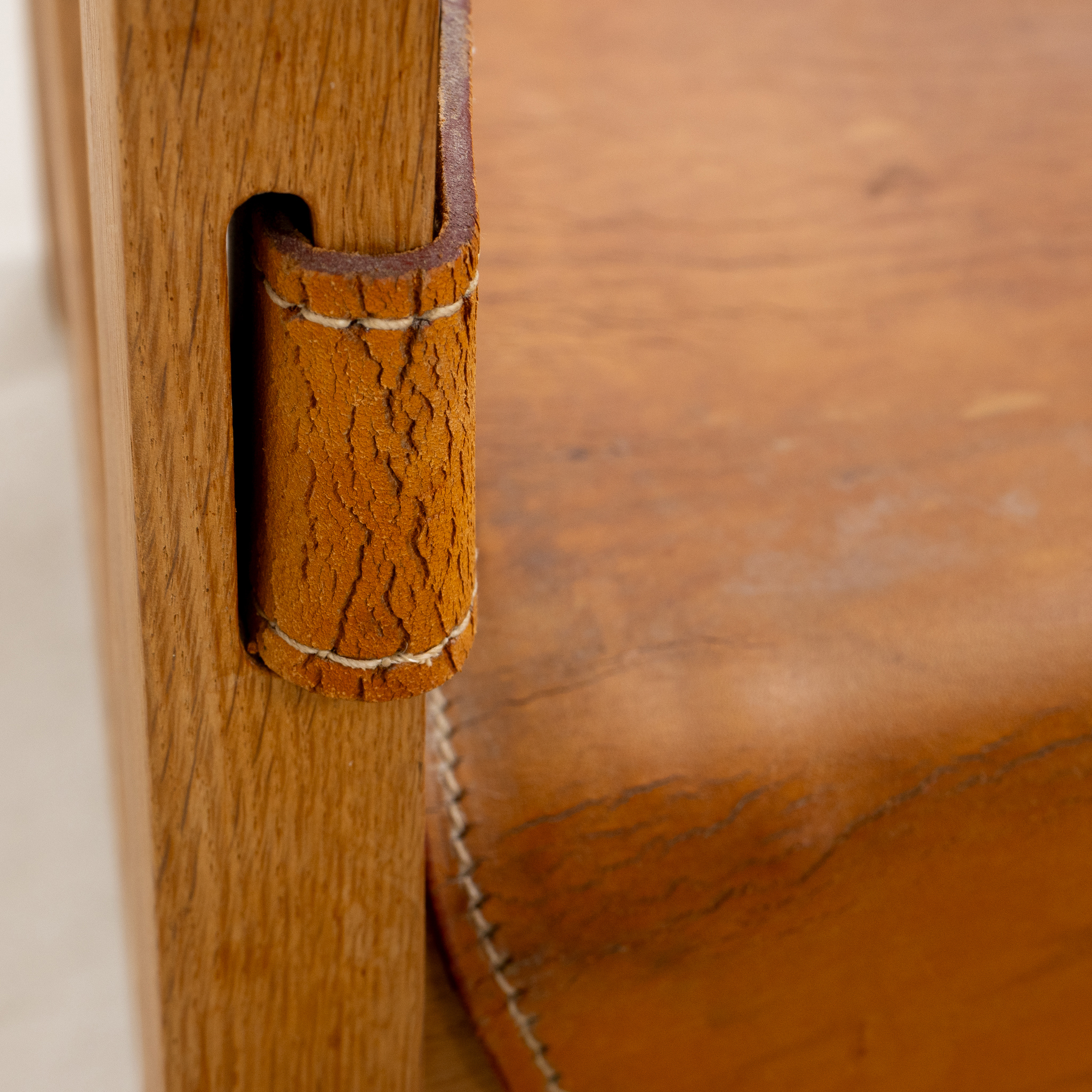 Modellen formgiven 1958, stomme av ek, sits och rygg av brunt läder, sitthöjd 30, bredd 81, djup 60, höjd 61 cm