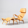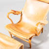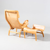 BRUNO MATHSSON, fåtölj med fotpall, "Pernilla", Firma Karl Mathsson Värnamo, brännstämplad och datumstämplad 1975, cognacfärgat skinn på fåtölj och fotpall, stomme i ek.
