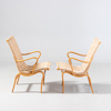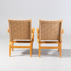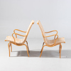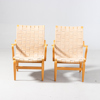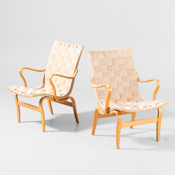 BRUNO MATHSSON, fåtöljer, ett par, "Eva", Firma Karl Mathsson Värnamo, stomme av ek med sits och rygg av sadelgjord, brännmärkta, 1970-tal.