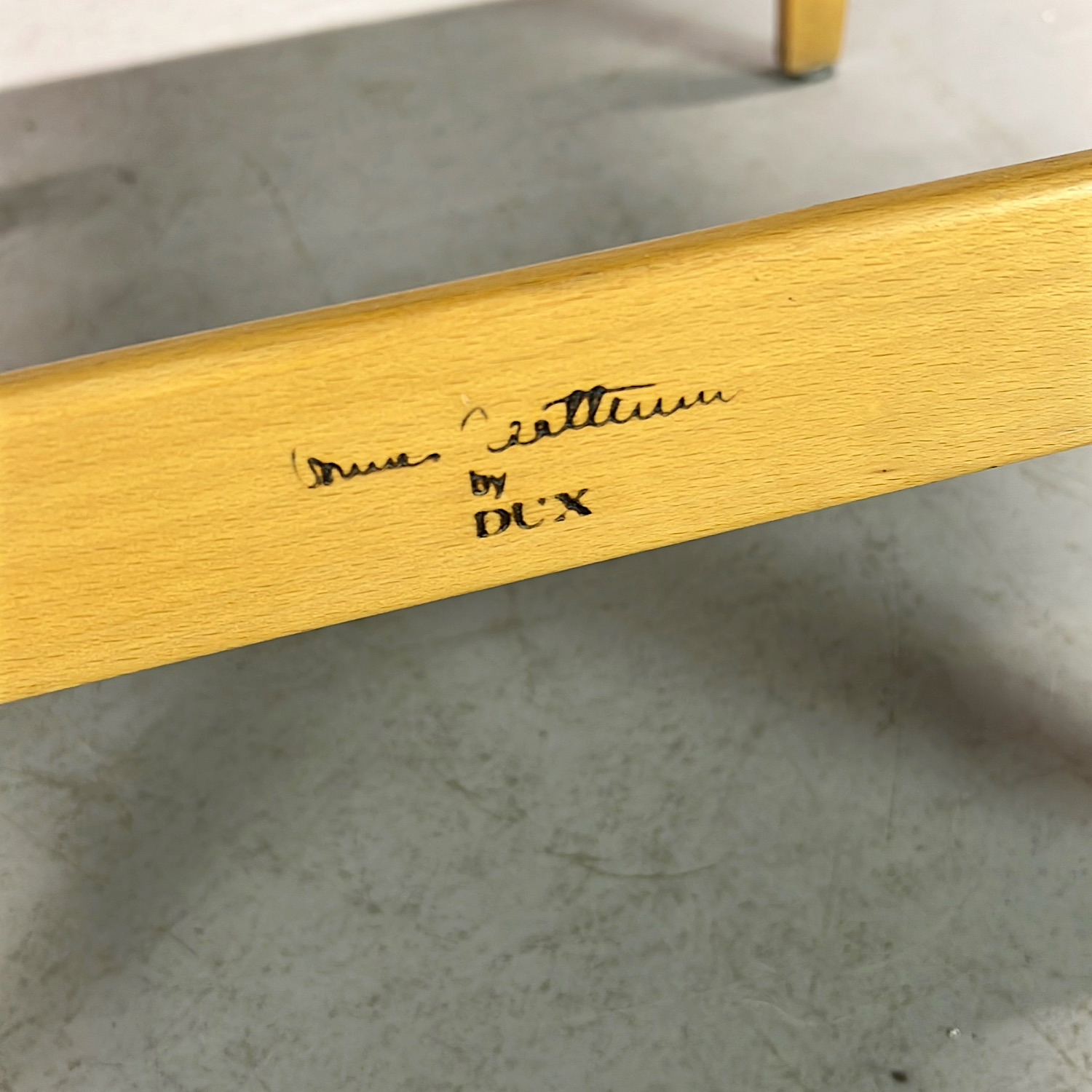 Normalt slitage, märken, fläckar, canvas delvis sliten. Brännstämplad “Bruno Mathsson by DUX”.