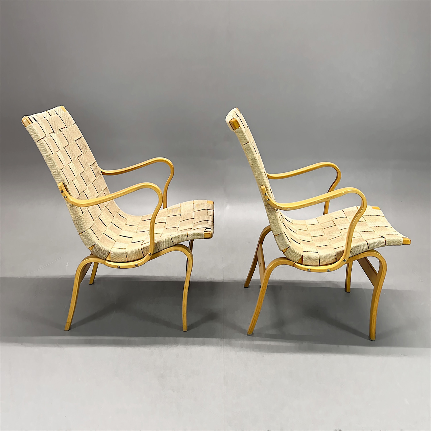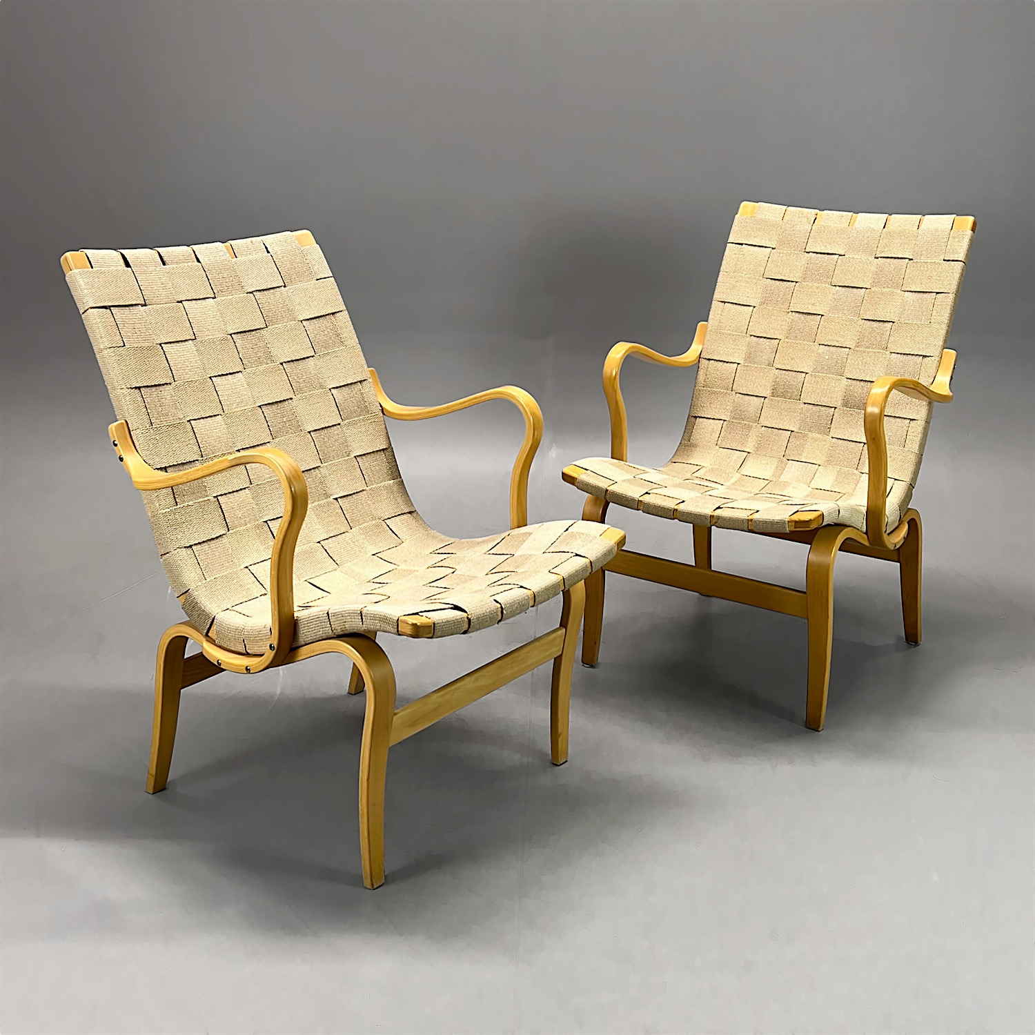 Fåtöljer, 2st, modell Eva, Bruno Mathsson för DUX, fåtölj. Ram av bok, flätad sadelgjord.