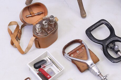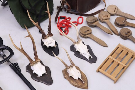 Bilder Jakttillbehör, 3 jaktstolar, rycksäck, patronväska, kompasser, pluntor, mm