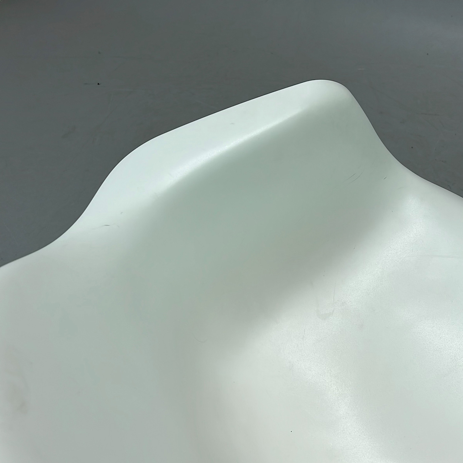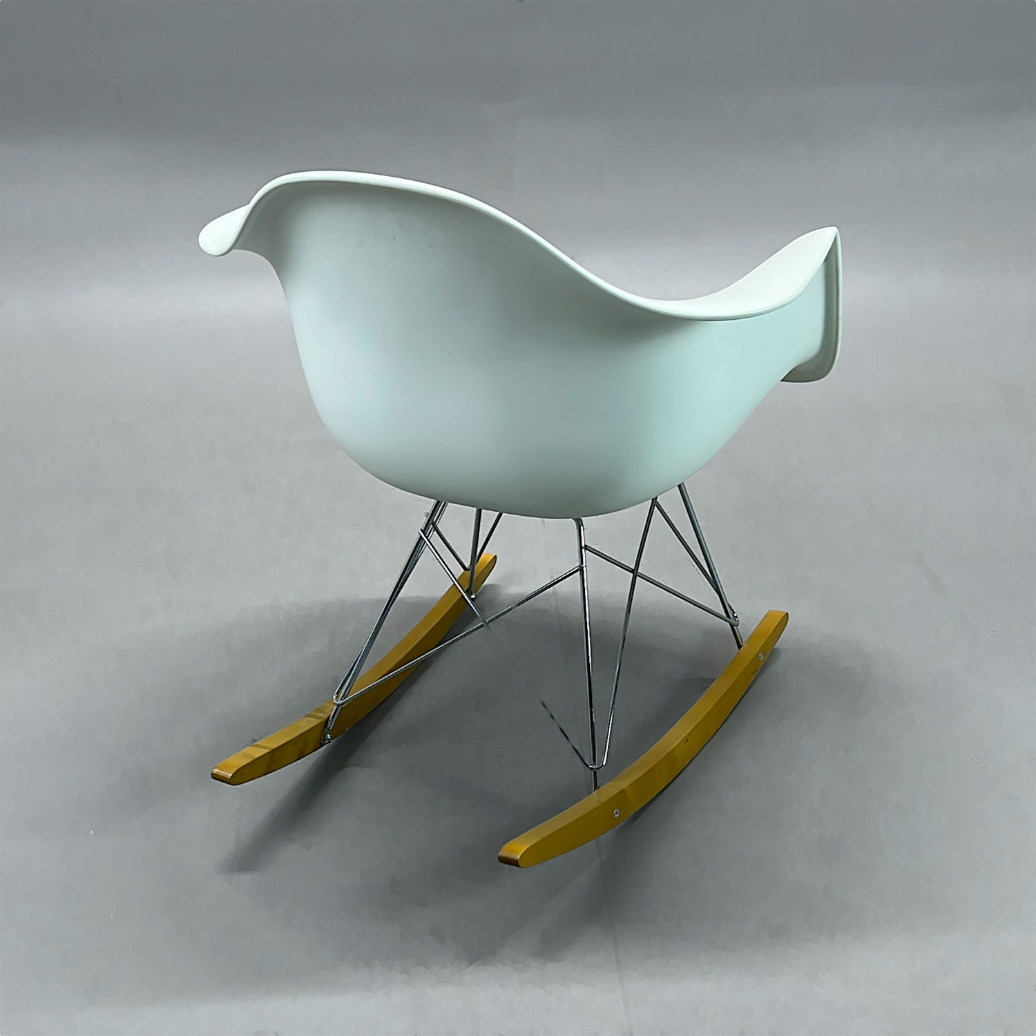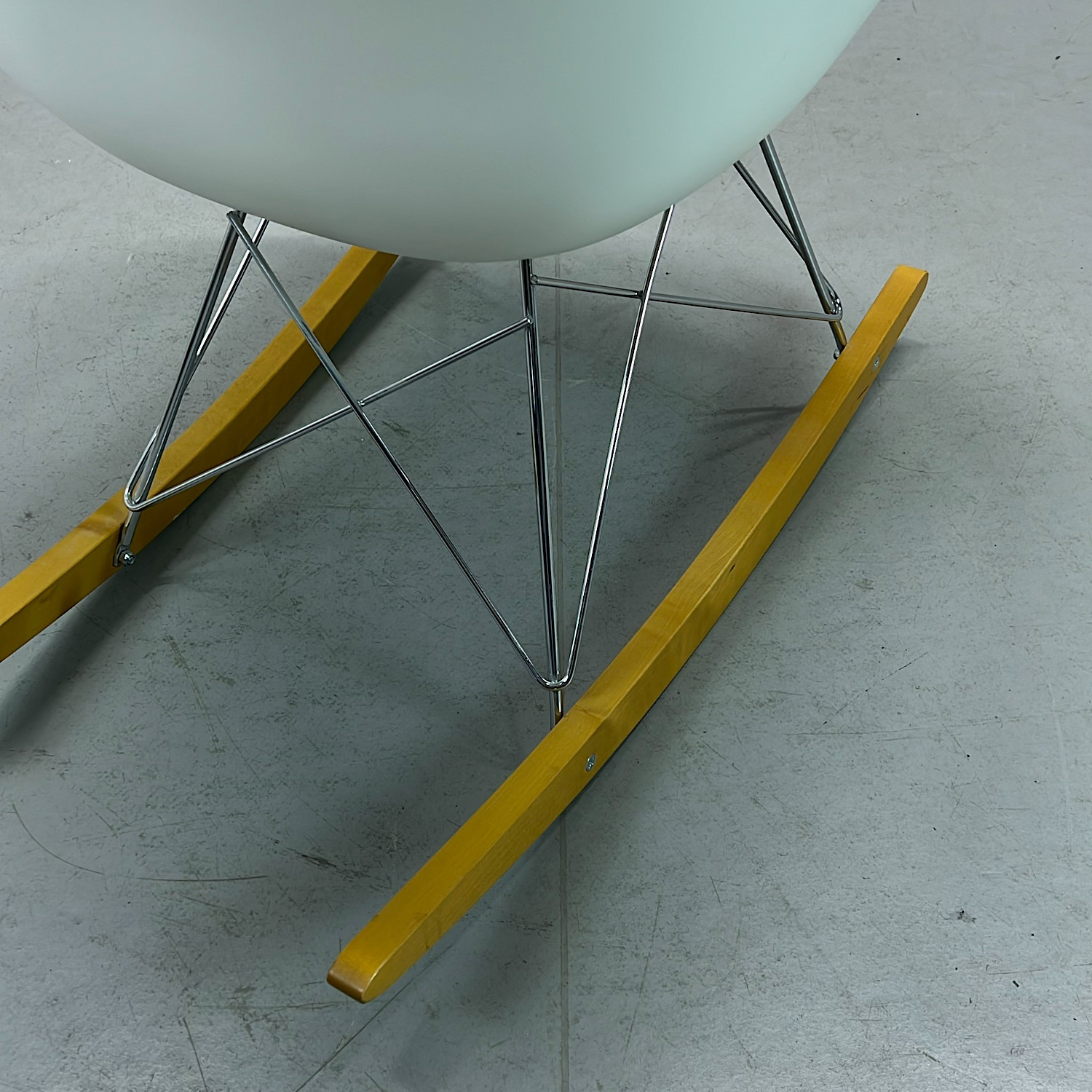 Gungstol Eames Plastic Armchair RAR, formgivare Charles & Ray Eames, Vitra. Sits i vit plast med gungstolsbas i stål och trä. Märkt undertill samt etikettmärkt.