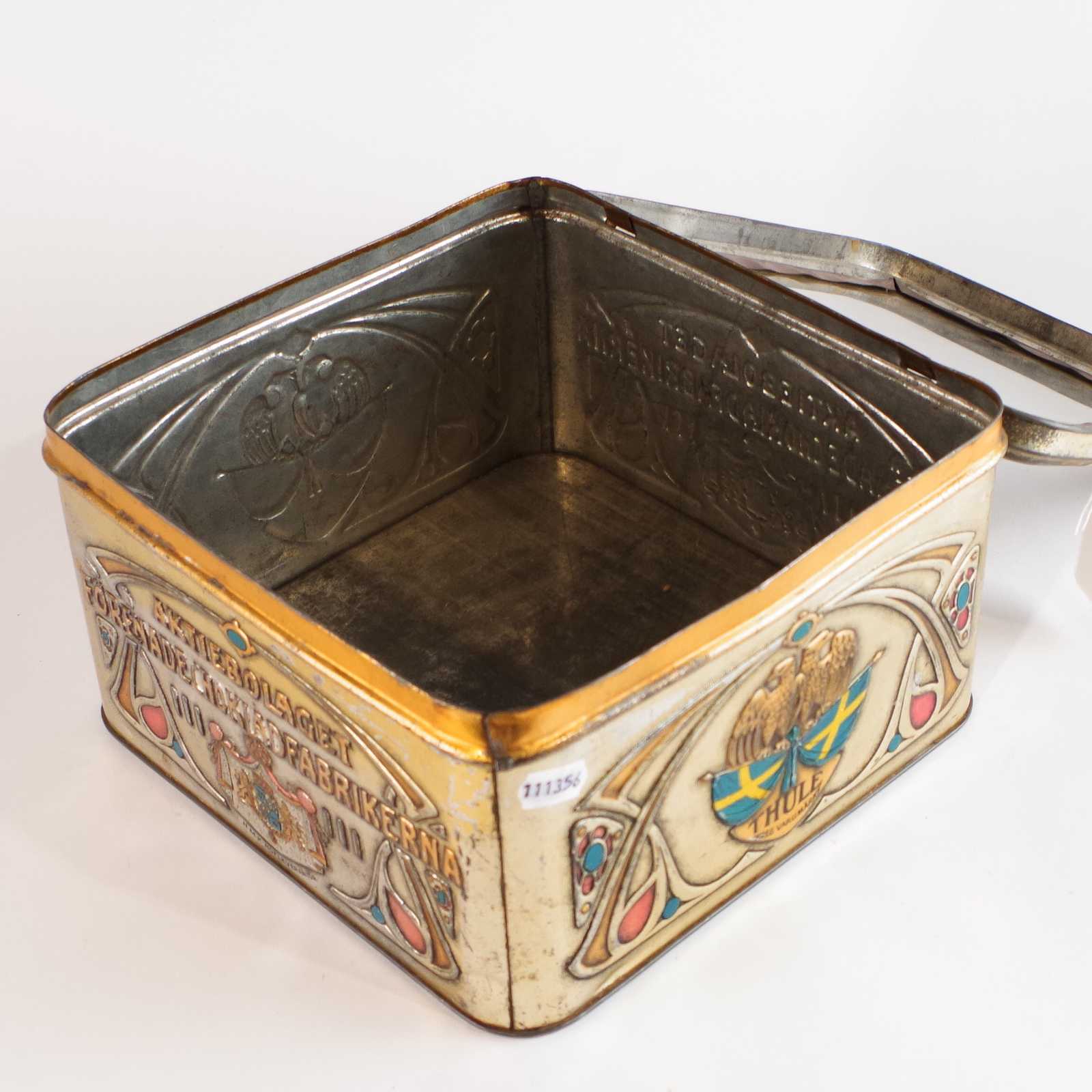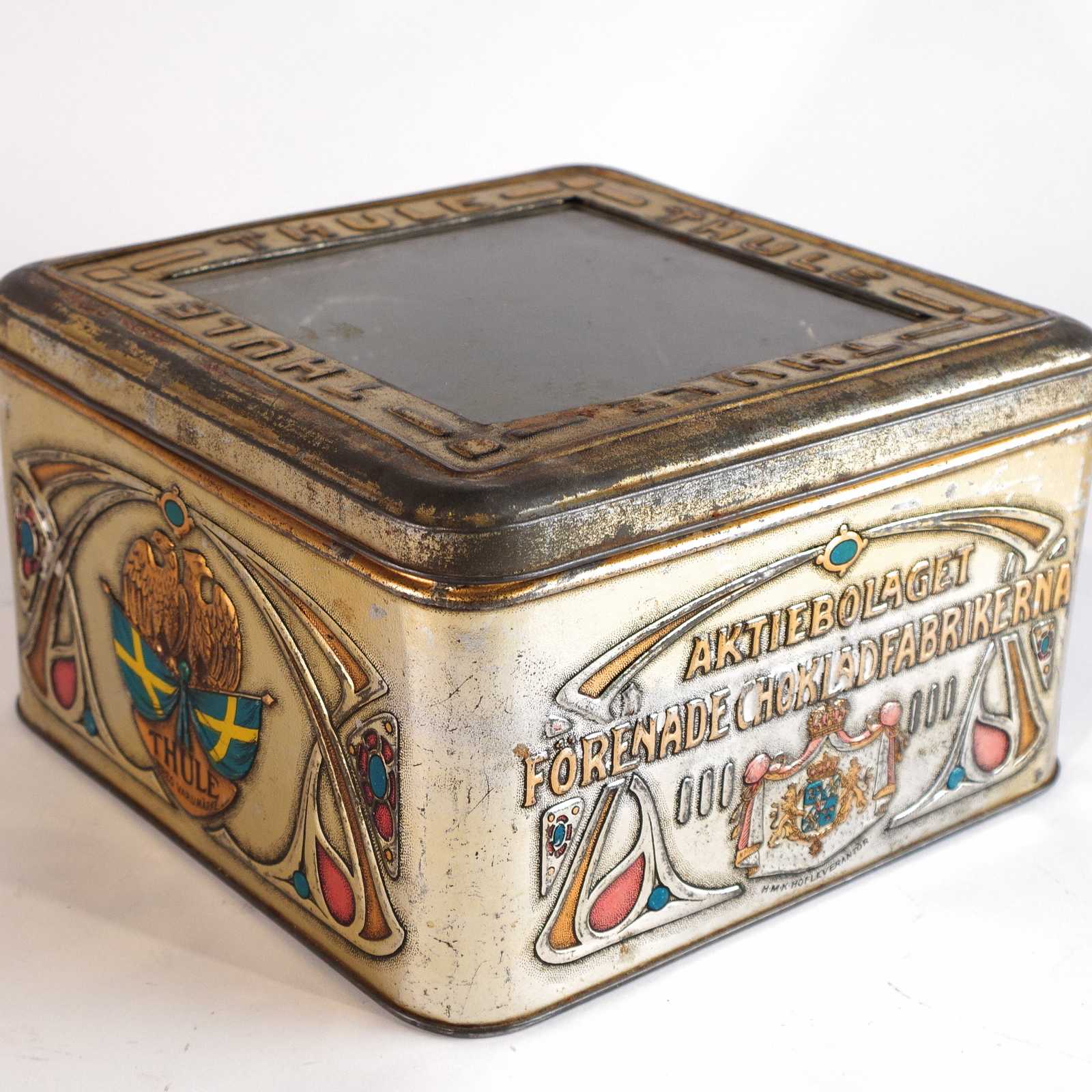 Bilder PLÅTBURK äldre, glasat lock. Aktiebolaget förenade chokladfabrikerna. H:14x 22x 22cm.